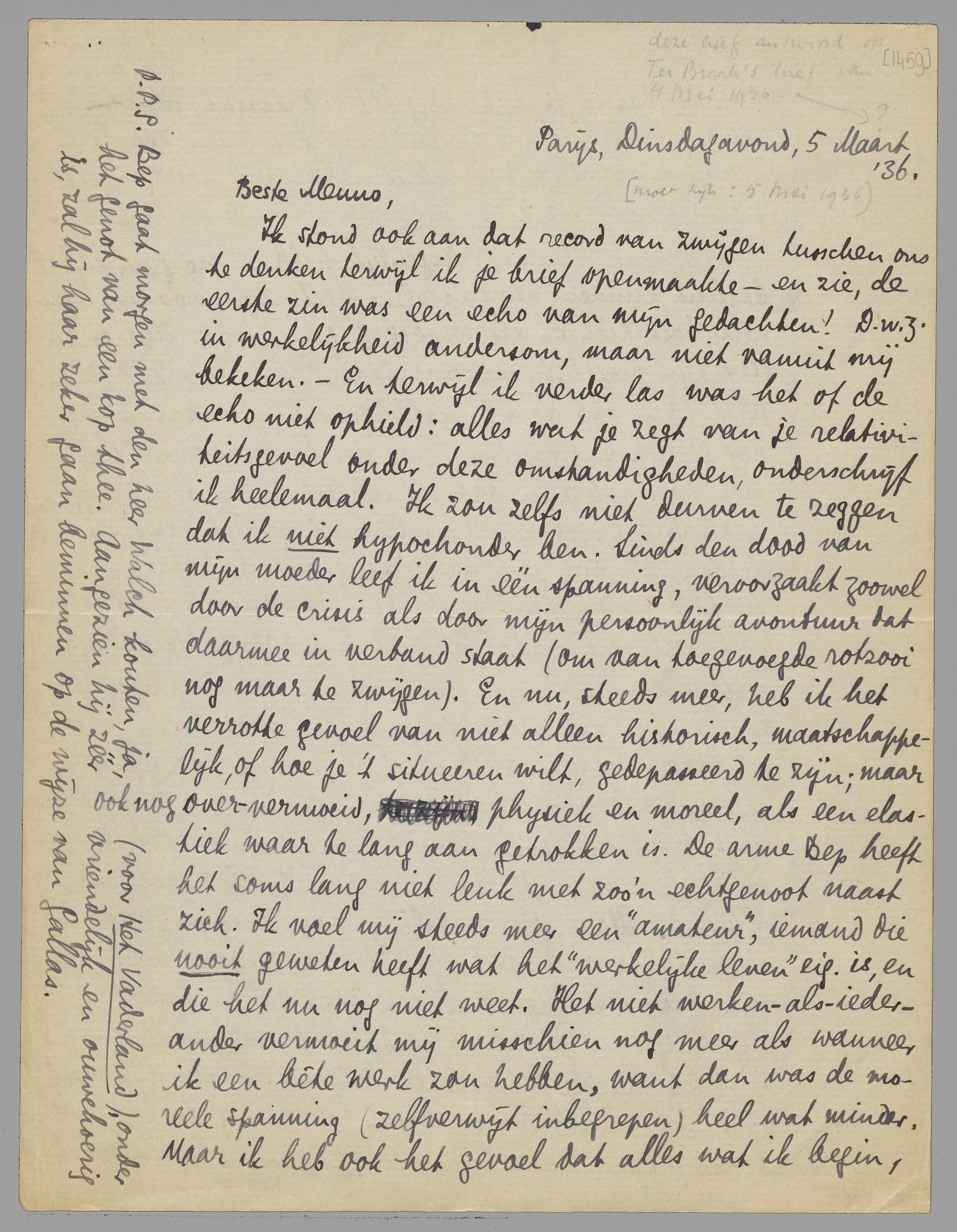 Ik stond ook aan dat record van zwijgen tusschen ons te denken terwijl ik je brief openmaakte - en zie, de eerste zin was een echo van mijn gedachten! D.w.z. in werkelijkheid andersom, maar niet vanuit mij bekeken. - En terwijl ik verder las was het of de echo niet ophield: alles wat je zegt van je relativiteitsgevoel onder deze omstandigheden, onderschrijf ik heelemaal. Ik zou zelfs niet durven te zeggen dat ik niet hypochonder ben. Sinds den dood van mijn moeder leef ik in één spanning, veroorzaakt zoowel door de crisis als door mijn persoonlijk avontuur dat daarmee in verband staat (om van toegevoegde rotzooi nog maar te zwijgen). En nu, steeds meer, heb ik het verrotte gevoel van niet alleen historisch, maatschappelijk, of hoe je 't situeeren wilt, gedepasseerd te zijn; maar ook nog over-vermoeid, physiek en moreel, als een elastiek waar te lang aan getrokken is. De arme Bep heeft het soms lang niet leuk met zoo'n echtgenoot naast zich. Ik voel mij steeds meer een ‘amateur’, iemand die nooit geweten heeft wat het ‘werkelijke leven’ eig. is, en die het nog niet weet. Het niet werken-als-ieder-ander vermoeit mij misschien nog meer als wanneer ik een bête werk zou hebben, want dan was de moreele spanning (zelfverwijt inbegrepen) heel wat minder. Maar ik heb ook het gevoel dat alles wat ik begin, mislukt, dat ik te onhandig (of onpractisch) ben om het nog eens ‘klaar te spelen’ met het leven, zooals ik in mijn hoopvolle oogenblikken natuurlijk als vanzelfsprekend voor me zie, - en waaròm? met welk recht?