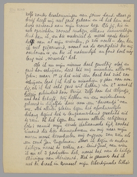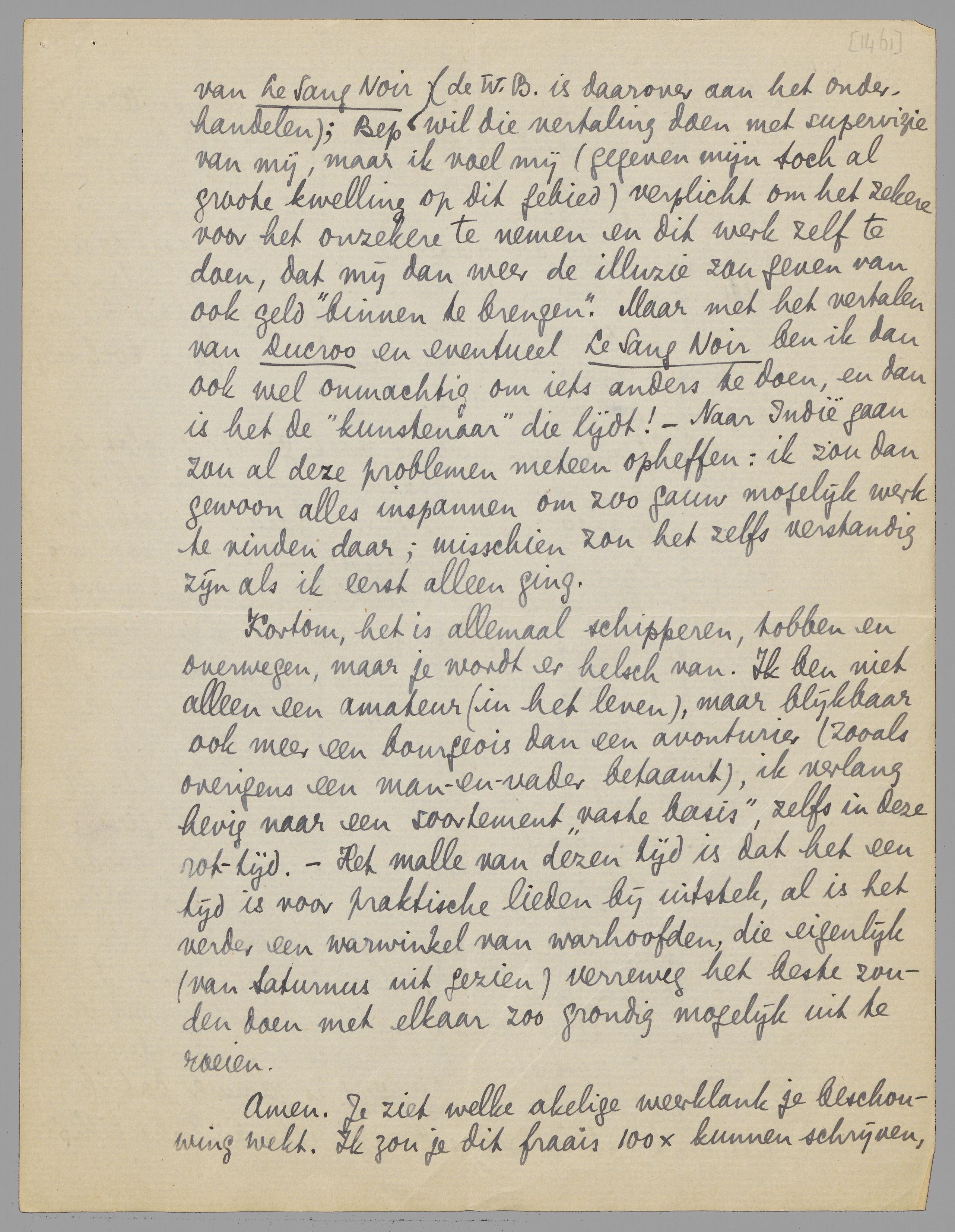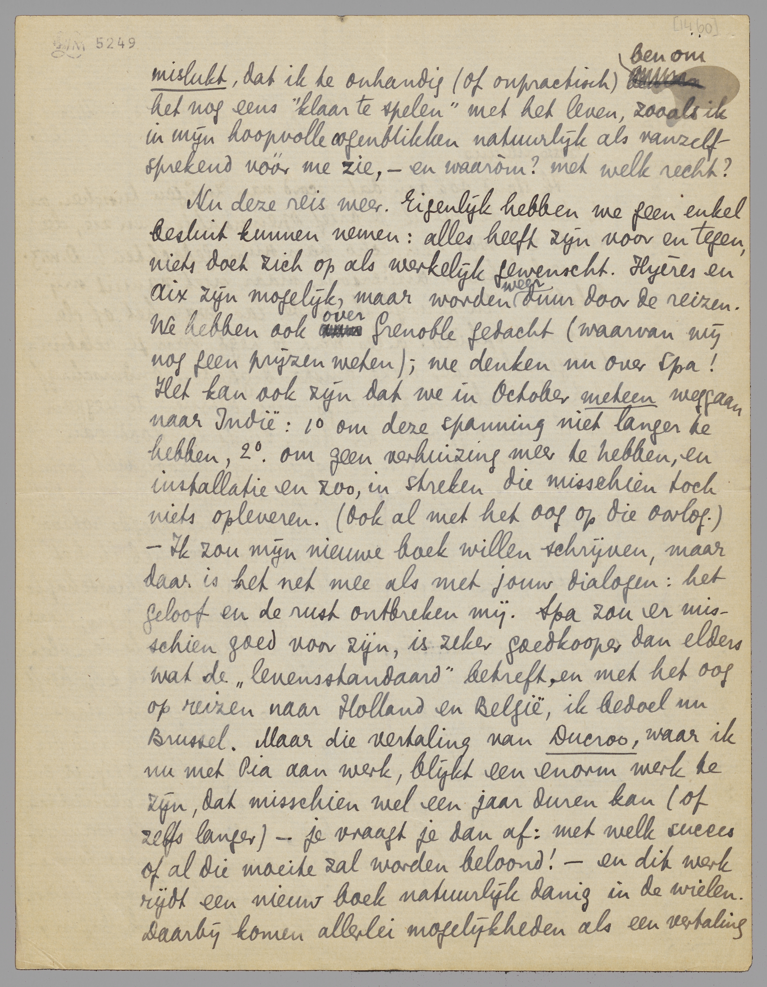 Nu deze reis weer. Eigenlijk hebben we geen enkel besluit kunnen nemen: alles heeft zijn voor en tegen, niets doet zich op als werkelijk gewenscht. Hyères en Aix zijn mogelijk, maar worden weer duur door de reizen. We hebben ook over Grenoble gedacht (waarvan wij nog geen prijzen weten); we denken nu over Spa! Het kan ook zijn dat we in October meteen weggaan naar Indië: 1o om deze spanning niet langer te hebben, 2o om geen verhuizing meer te hebben, en installatie en zoo, in streken die misschien toch niets opleveren. (Ook al met het oog op die oorlog.) - Ik zou mijn nieuwe boek willen schrijven, maar daar is het net mee als met jouw dialogen: het geloof en de rust ontbreken mij. Spa zou er misschien goed voor zijn, is zeker goedkooper dan elders wat de ‘levensstandaard’ betreft, en met het oog op reizen naar Holland en België, ik bedoel nu Brussel. Maar die vertaling van Ducroo, waar ik nu met Pia aan werk, blijkt een enorm werk te zijn, dat misschien wel een jaar duren kan (of zelfs langer) - je vraagt je dan af: met welk succes of al die moeite zal worden beloond! - en dit werk rijdt een nieuw boek natuurlijk danig in de wielen. Daarbij komen allerlei mogelijkheden als een vertaling van Le Sang Noir (de W.B. is daarover aan het onderhandelen); Bep wil die vertaling doen met supervizie van mij, maar ik voel mij (gegeven mijn toch al groote kwelling op dit gebied) verplicht om het zekere voor het onzekere te nemen en dit werk zelf te doen, dat mij dan weer de illuzie zou geven van ook geld ‘binnen te brengen’. Maar met het vertalen van Ducroo en eventueel Le Sang Noir ben ik dan ook wel onmachtig om iets anders te doen, en dan is het de ‘kunstenaar’ die lijdt! - Naar Indië gaan zou al deze problemen meteen opheffen: ik zou dan gewoon alles inspannen om zoo gauw mogelijk werk te vinden daar; misschien zou het zelfs verstandig zijn als ik eerst alleen ging.