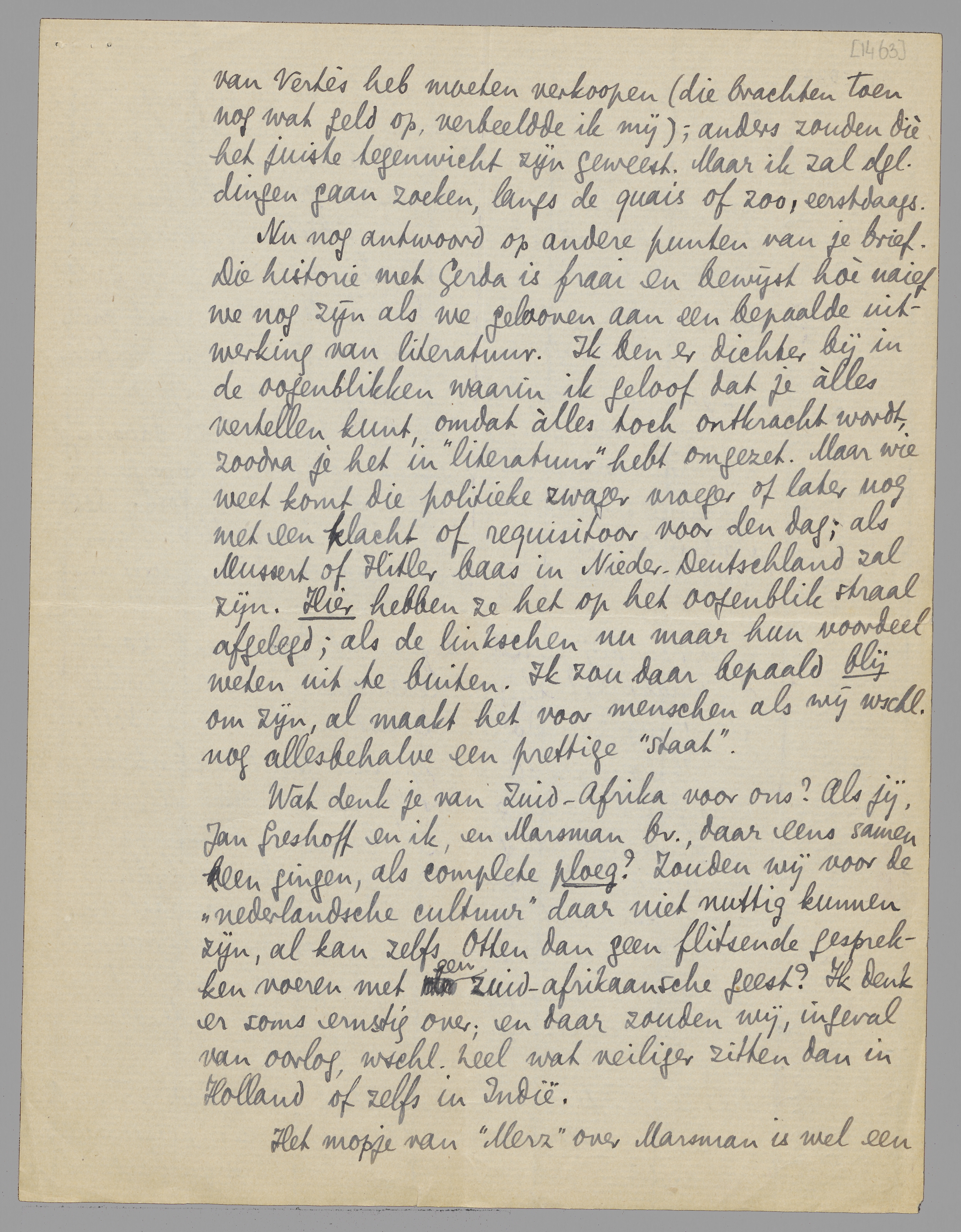Wat denk je van Zuid-Afrika voor ons? Als jij, Jan Greshoff en ik, en Marsman bv., daar eens samen heen gingen, als complete ploeg? Zouden wij voor de ‘nederlandsche cultuur’ daar niet nuttig kunnen zijn, al kan zelfs Otten dan geen flitsende gesprekken voeren met een zuidafrikaansche geest? Ik denk er soms ernstig over; en daar zouden wij, ingeval van oorlog, wschl. heel wat veiliger zitten dan in Holland of zelfs in Indië.