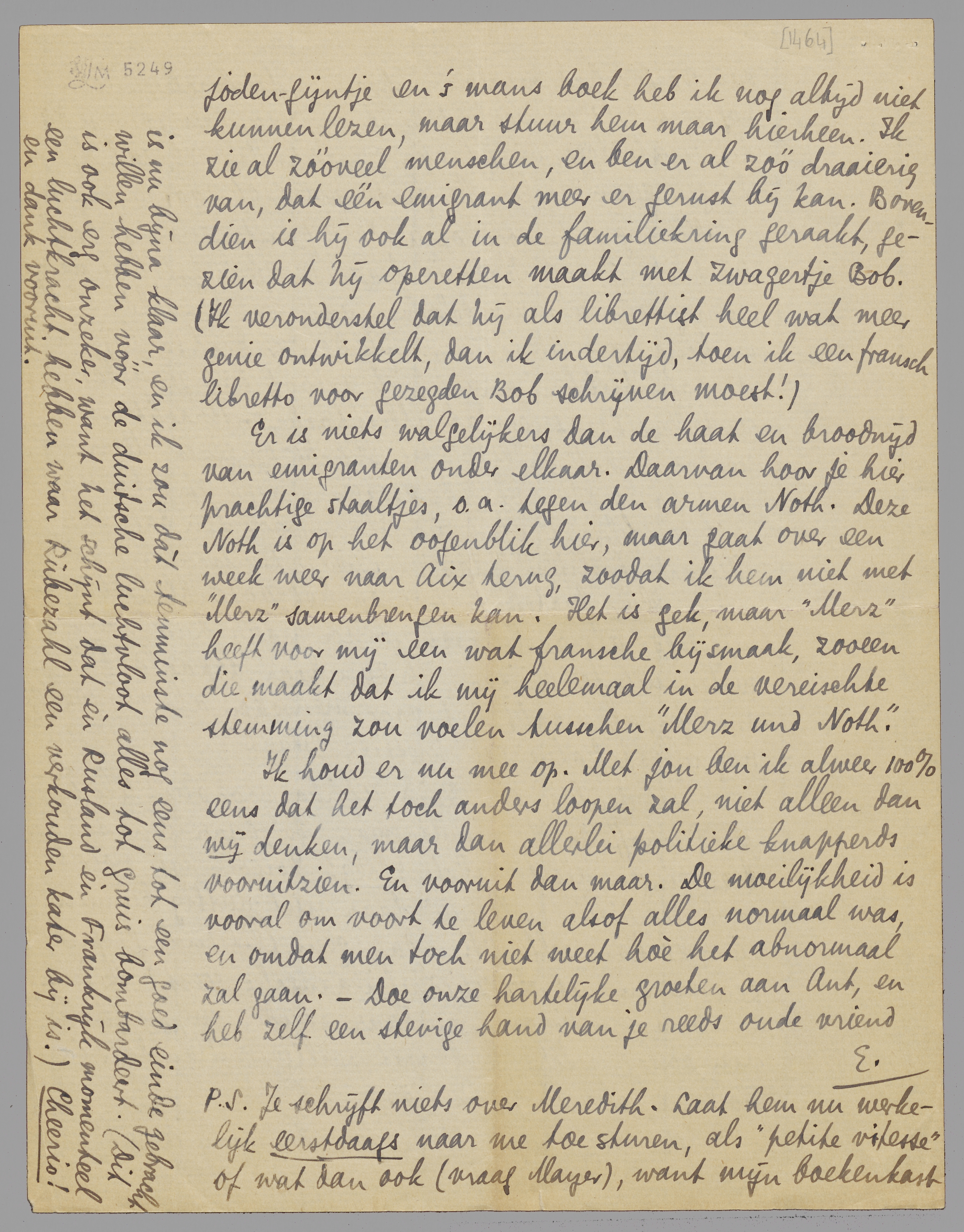 Het mopje van ‘Merz’ over Marsman is wel een jodengijntje en 's mans boek heb ik nog altijd niet kunnen lezen, maar stuur hem maar hierheen. Ik zie al zóóveel menschen, en ben er al zóó draaierig van, dat één emigrant meer er gerust bij kan. Bovendien is hij ook al in de familiekring geraakt, gezien dat hij operetten maakt met zwagertje Bob. (Ik veronderstel dat hij als librettist heel wat meer genie ontwikkelt, dan ik indertijd, toen ik een fransch libretto voor gezegden Bob schrijven moest!)