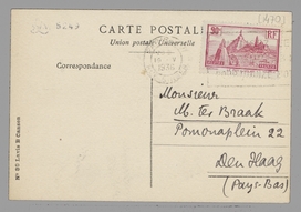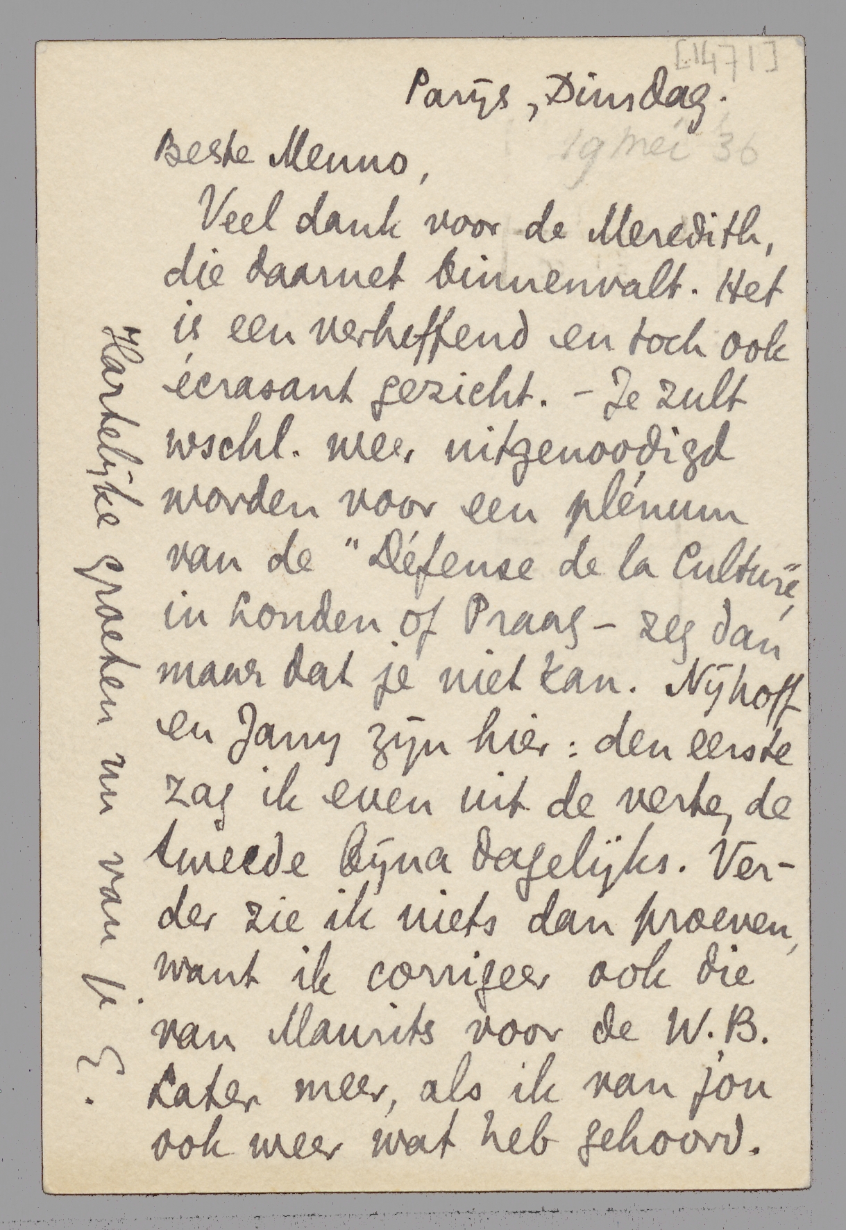 Veel dank voor de Meredith, die daarnet binnenvalt. Het is een verheffend en toch ook écrasant gezicht. - Je zult wschl. weer uitgenoodigd worden voor een plénum van de ‘Défense de la Culture’, in Londen of Praag - zeg dan maar dat je niet kan. Nijhoff en Jany zijn hier: den eerste zag ik even uit de verte, de tweede bijna dagelijks. Verder zie ik niets dan proeven, want ik corrigeer ook die van Maurits voor de W.B. Later meer, als ik van jou ook weer wat heb gehoord.