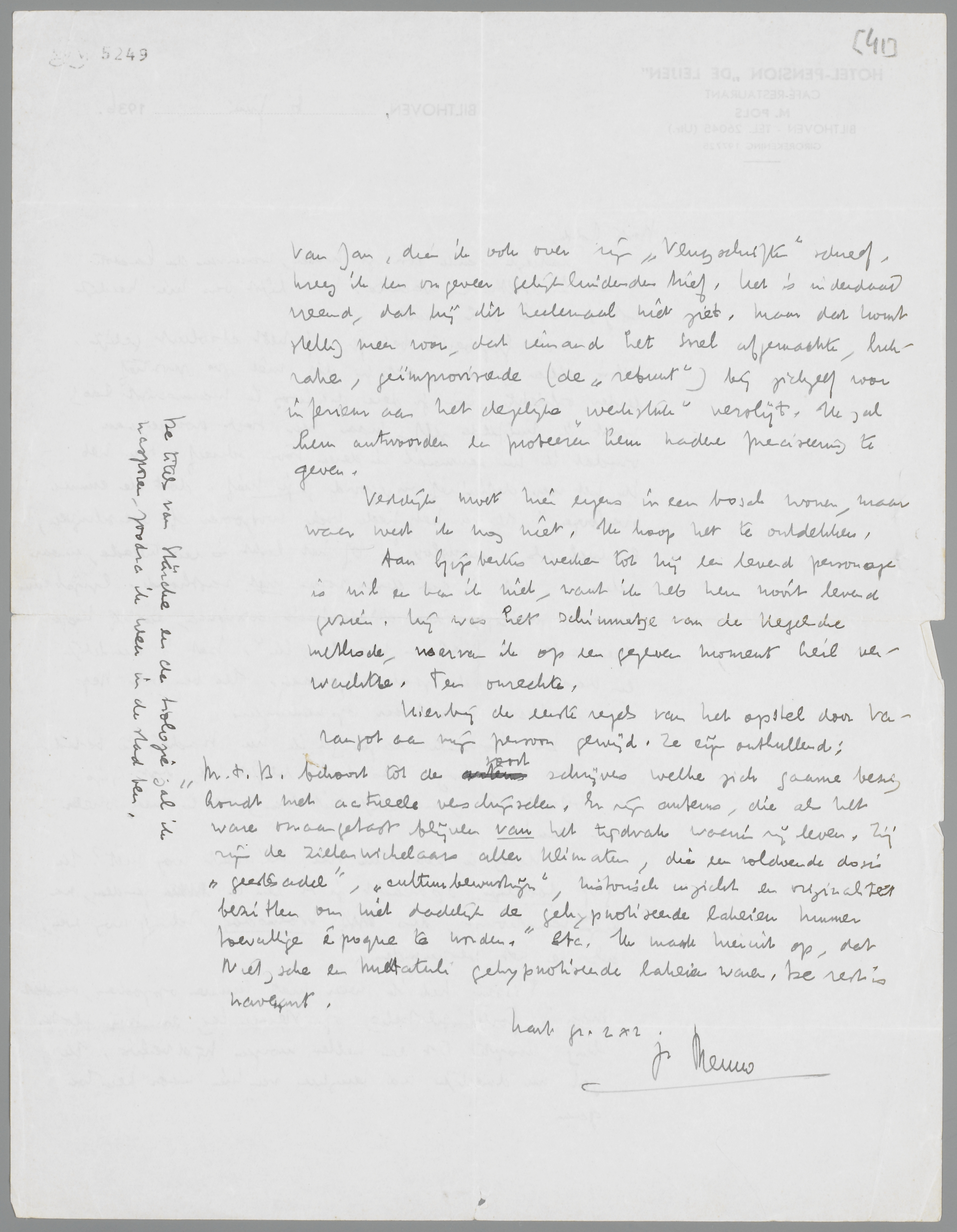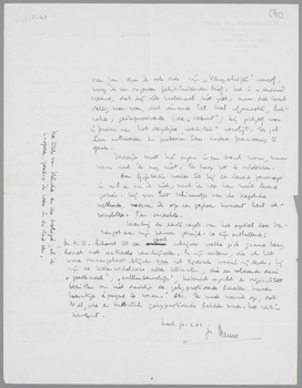Wat Gijsbertus betreft: je hebt absoluut gelijk. Het is alleen jammer, dat je dit niet zoo positief eerder ontdekte, toen je deze dialoog in manuscript las; want ik twijfelde zelf, maar ben toch doorgegaan, omdat ik nu eenmaal in dezen toon schreef. Nu heb ik het roer definitief omgegooid; je brief ‘doet de emmer overloopen’. Ik ga het heele boek voor zoover af overschrijven, en wel als ‘monoloog’. Of het lukt is een tweede, maar zeker is, dat ik aan dezen vorm niet vasthoud. Gijsbertus was een principe, een dialectisch axioma, en hij heeft geen recht van bestaan naast ‘ik’. Dat is duidelijk en daarmee is de zaak afgedaan. Ik ben ook Bep zeer dankbaar voor haar opmerkingen.