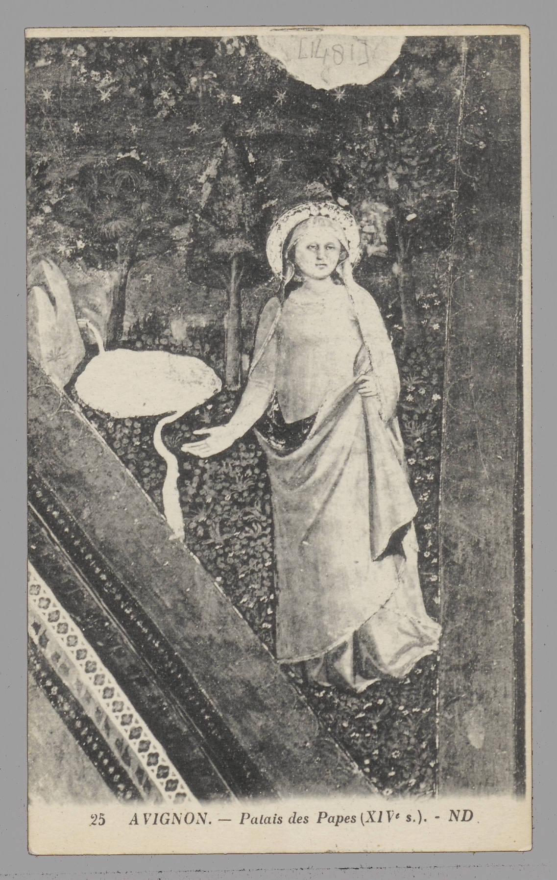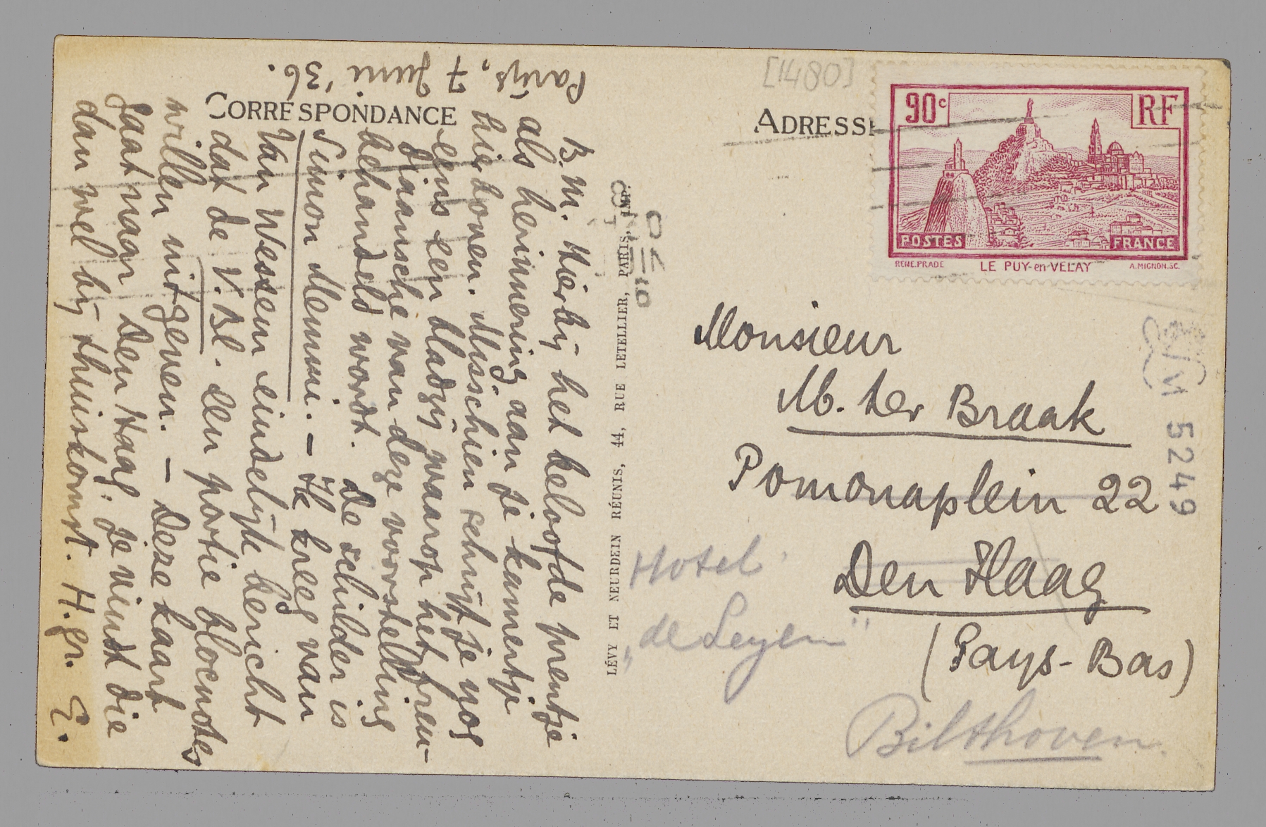 Hierbij het beloofde prentje als herinnering aan je kamertje hierboven. Misschien schrijf je nogeens een bladzij waarop het freudiaansche van deze voorstelling behandeld wordt. De schilder is Simon Memmi. - Ik kreeg van Van Wessem eindelijk bericht dat de V.Bl. een portie blocnotes willen uitgeven. - Deze kaart gaat naar Den Haag, je vindt die dan wel bij thuiskomst.