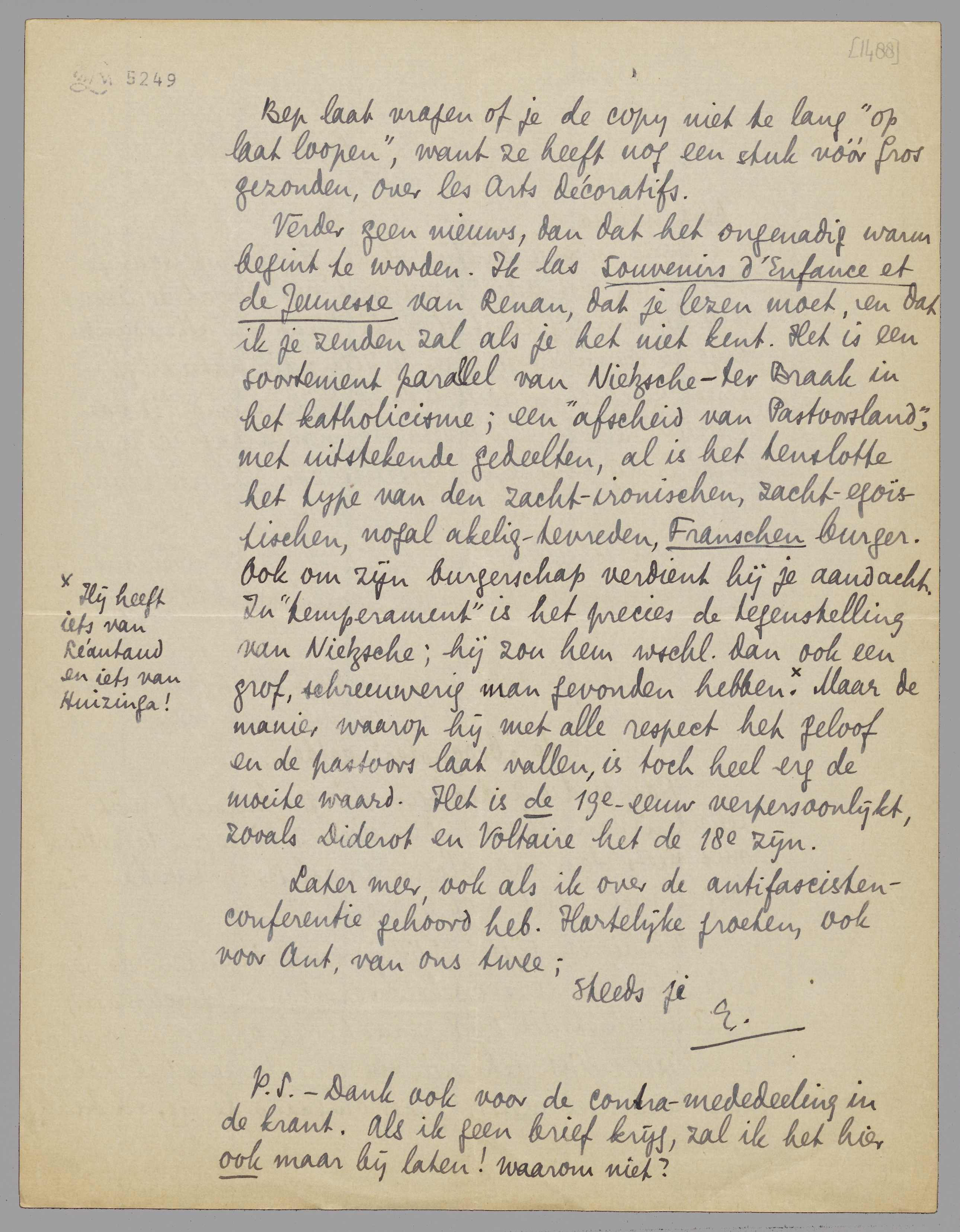 Verder geen nieuws, dan dat het ongenadig warm begint te worden. Ik las Souvenirs d'Enfance et de Jeunesse van Renan, dat je lezen moet, en dat ik je zenden zal als je het niet kent. Het is een soortement parallel van Nietzsche-ter Braak in het katholicisme; een ‘afscheid van Pastoorsland’, met uitstekende gedeelten, al is het tenslotte het type van den zacht-ironischen, zacht-egoïstischen, nogal akelig-tevreden, Franschen burger. Ook om zijn burgerschap verdient hij je aandacht. In ‘temperament’ is het precies de tegenstelling van Nietzsche; hij zou hem wschl. dan ook een grof, schreeuwerig man gevonden hebben. [Hij heeft iets van Léautaud en iets van Huizinga!] Maar de manier waarop hij met alle respect het geloof en de pastoors laat vallen, is toch heel erg de moeite waard. Het is de 19e eeuw verpersoonlijkt, zooals Diderot en Voltaire het de 18e zijn.