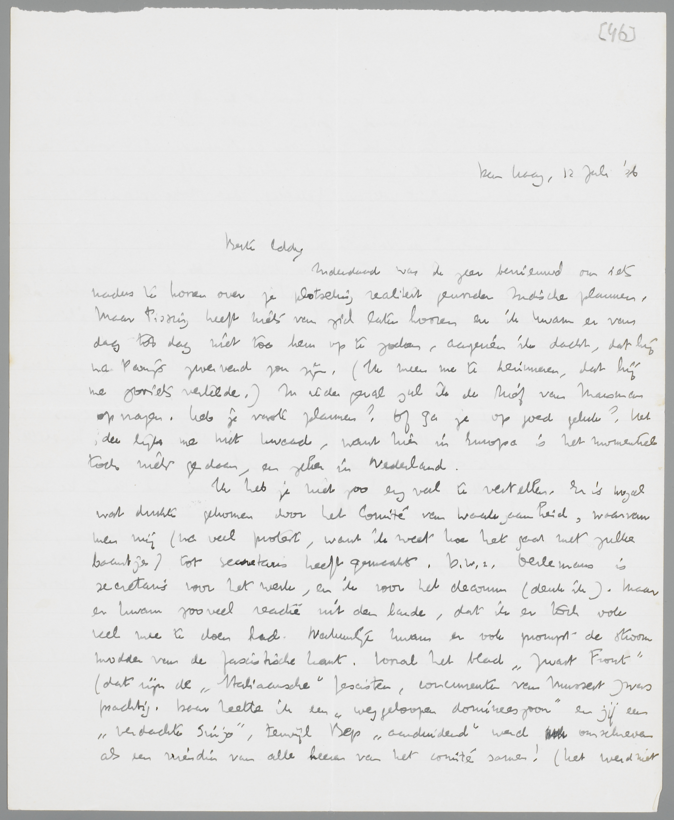Inderdaad was ik zeer benieuwd om iets naders te hooren over je plotseling realiteit geworden Indische plannen. Maar Tissing heeft niets van zich laten hooren en ik kwam er van dag tot dag niet toe hem op te zoeken, aangezien ik dacht, dat hij na Parijs zwervend zou zijn. (Ik meen me te herinneren, dat hij me zooiets vertelde.) In ieder geval zal ik de brief van Marsman opvragen. Heb je vaste plannen? Of ga je op goed geluk? Het idee lijkt me niet kwaad, want hier in Europa is het momenteel toch niets gedaan, en zeker in Nederland.