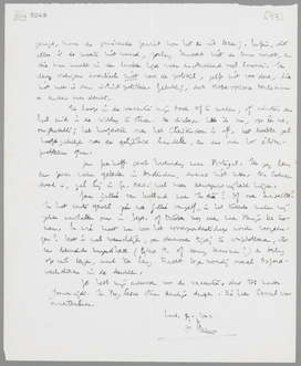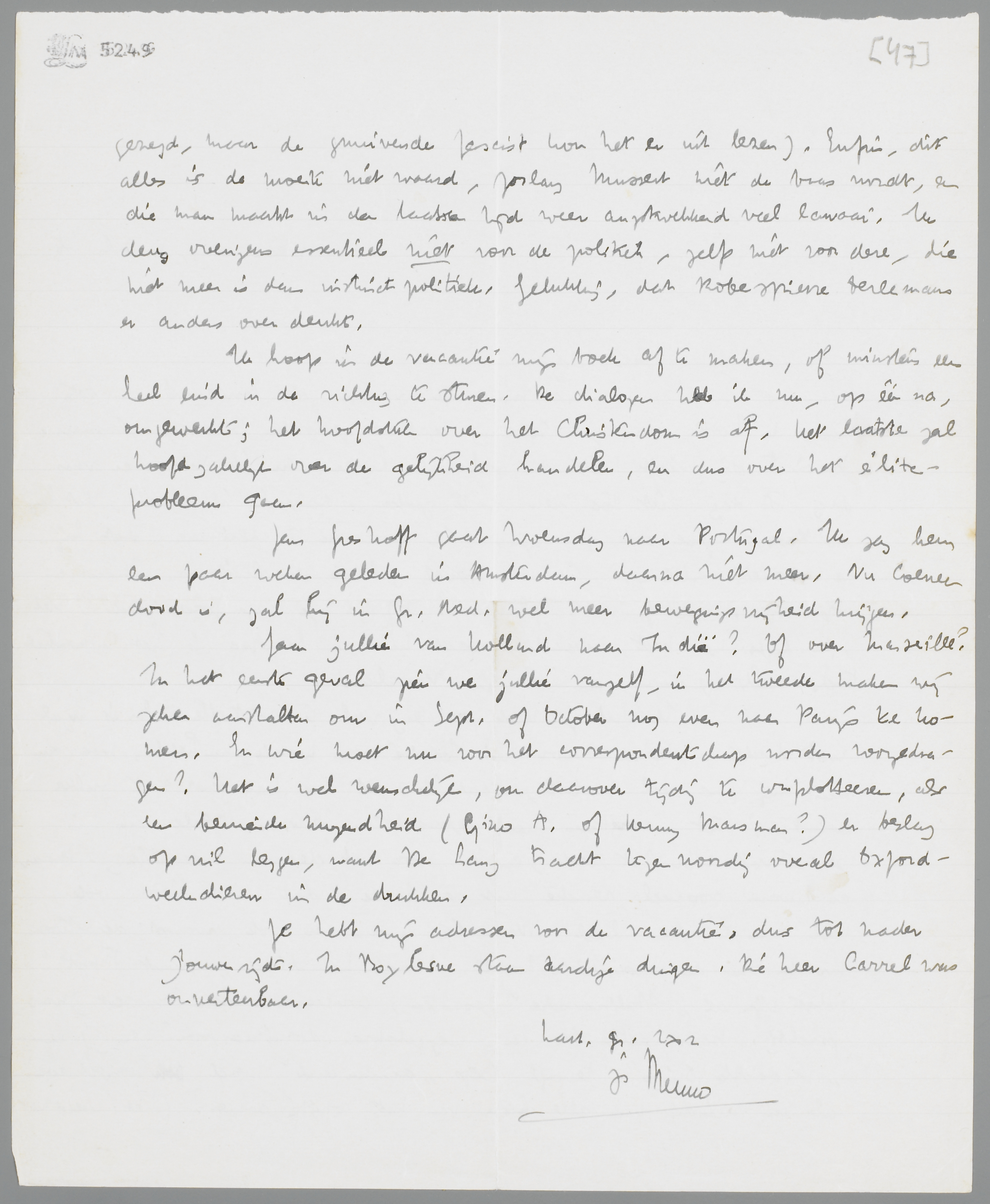 Gaan jullie van Holland naar Indië? Of over Marseille? In het eerste geval zien we jullie vanzelf, in het tweede maken wij zeker aanstalten om in Sept. of October nog even naar Parijs te komen. En wie moet nu voor het correspondentschap worden voorgedragen? Het is wel wenschelijk, om daarover tijdig te complotteeren als een bevriende mogendheid (Gino A. of Henny Marsman?) er beslag op wil leggen, want De Lang tracht tegenwoordig overal Oxford-weekdieren in te drukken.