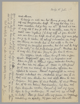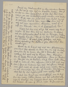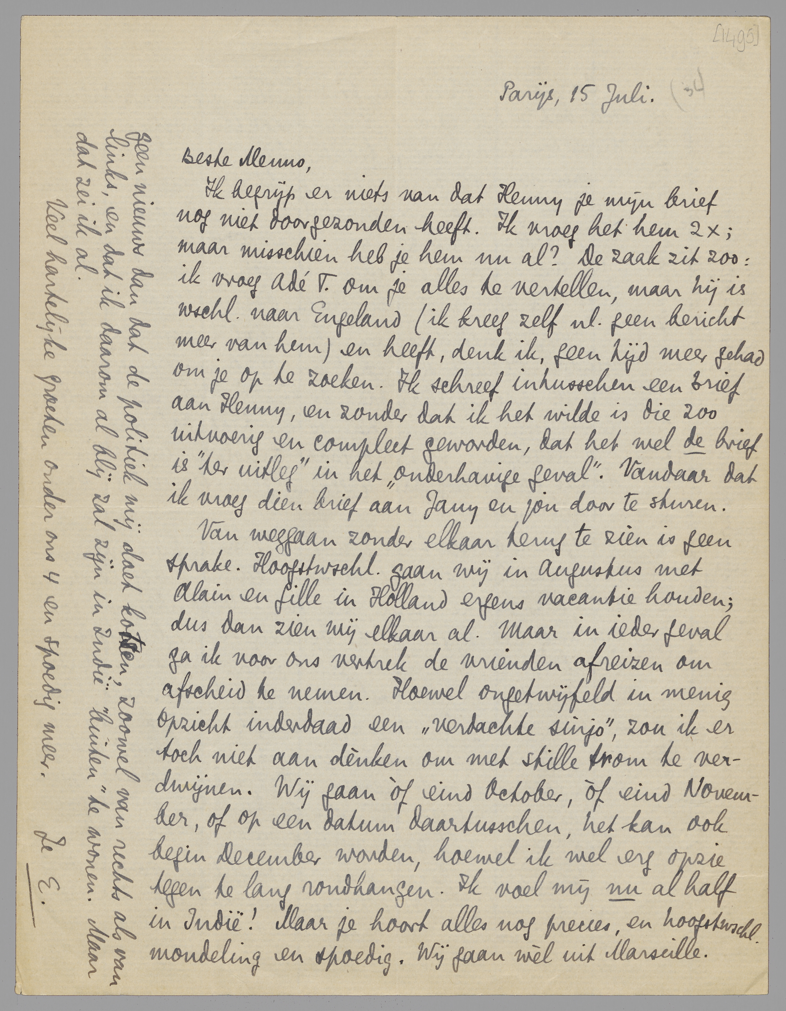 Ik begrijp er niets van dat Henny je mijn brief nog niet doorgezonden heeft. Ik vroeg het hem 2 ×; maar misschien heb je hem nu al? De zaak zit zoo: ik vroeg Adé T. om je alles te vertellen, maar hij is wschl. naar Engeland (ik kreeg zelf nl. geen bericht meer van hem) en heeft, denk ik, geen tijd meer gehad om je op te zoeken. Ik schreef intusschen een brief aan Henny, en zonder dat ik het wilde is die zoo uitvoerig en compleet geworden, dat het wel de brief is ‘ter uitleg’ in het ‘onderhavige geval’. Vandaar dat ik vroeg dien brief aan Jany en jou door te sturen.