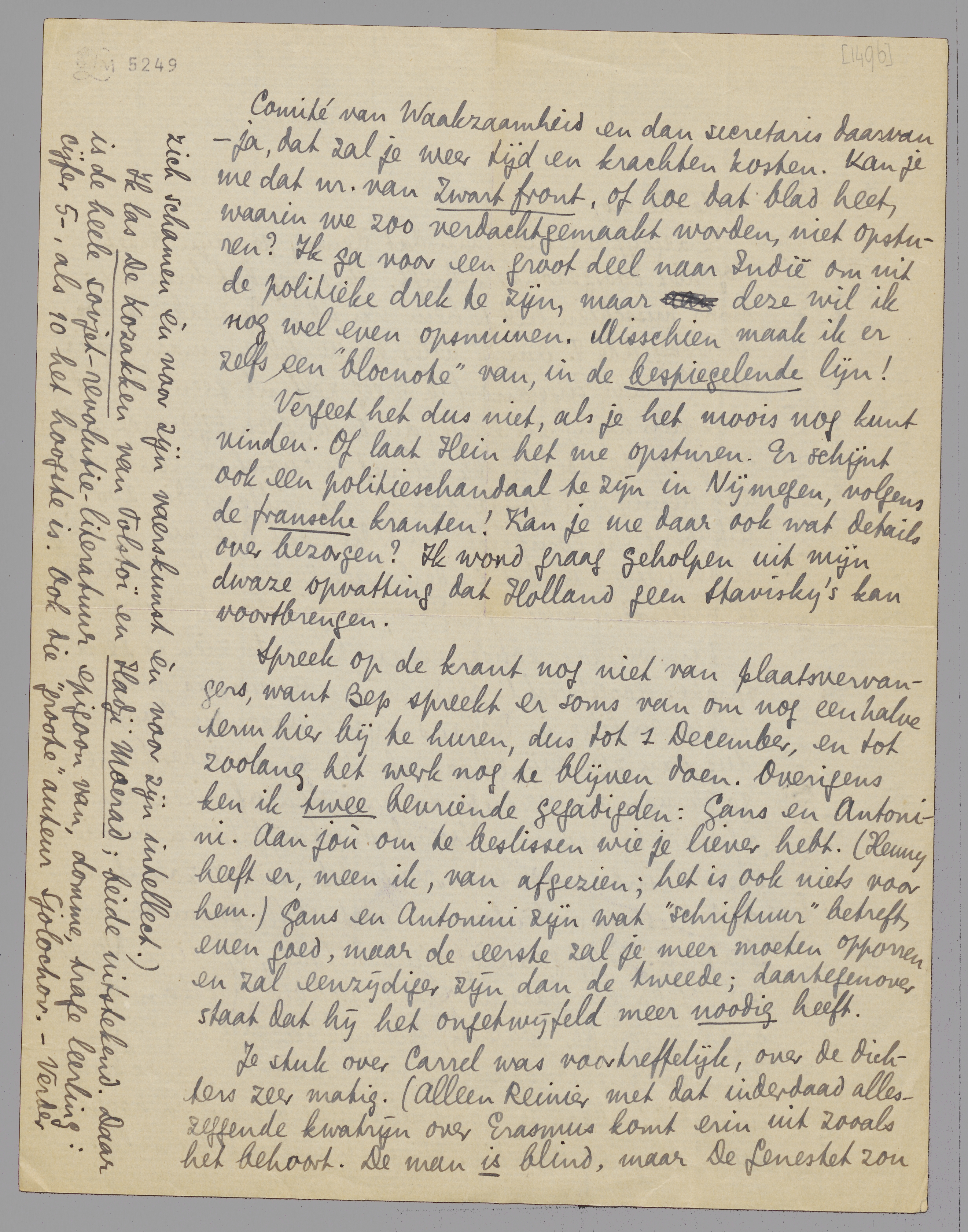 Comité van Waakzaamheid en dan secretaris daarvan - ja, dat zal je weer tijd en krachten kosten. Kan je me dat nr. van Zwart Front, of hoe dat blad heet, waarin we zoo verdacht gemaakt worden, niet opsturen? Ik ga voor een groot deel naar Indië om uit de politieke drek te zijn, maar deze wil ik nog wel even opsnuiven. Misschien maak ik er zelfs een ‘blocnote’ van, in de bespiegelende lijn!