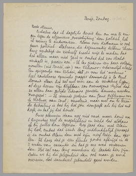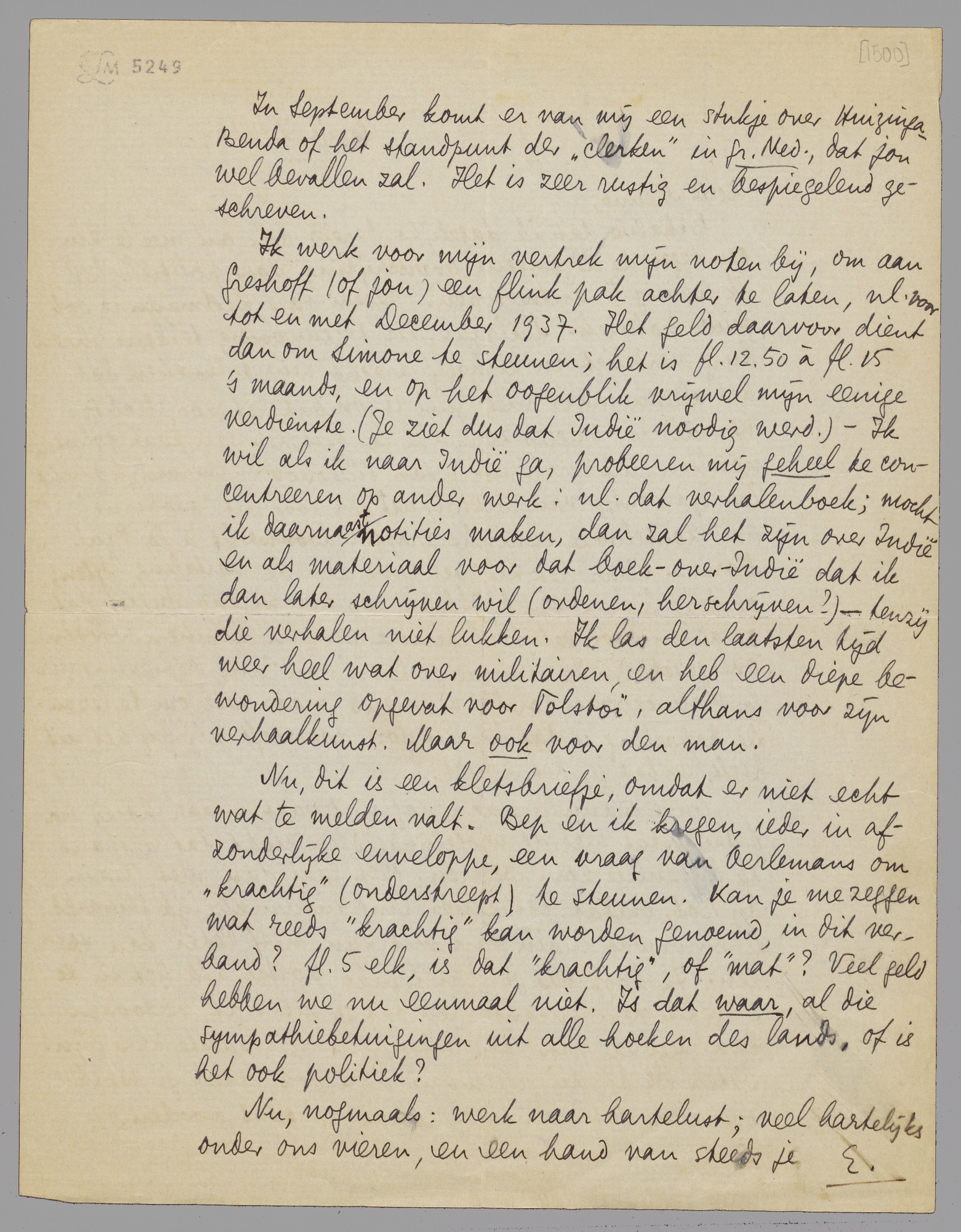 Ik werk voor mijn vertrek mijn noten bij, om aan Greshoff (of jou) een flink pak achter te laten, nl. voor tot en met December 1937. Het geld daarvoor dient dan om Simone te steunen; het is ƒ 12.50 à ƒ 15 's maands, en op het oogenblik vrijwel mijn eenige verdienste. (Je ziet dus dat Indië noodig werd.) - Ik wil als ik naar Indië ga, probeeren mij geheel te concentreeren op ander werk: nl. dat verhalenboek; mocht ik daarnaast notities maken, dan zal het zijn over Indië en als materiaal voor dat boek-over-Indië dat ik dan later schrijven wil (ordenen, herschrijven?) - tenzij die verhalen niet lukken. Ik las den laatsten tijd weer heel wat over militairen, en heb een diepe bewondering opgevat voor Tolstoï, althans voor zijn verhaalkunst. Maar ook voor den man.