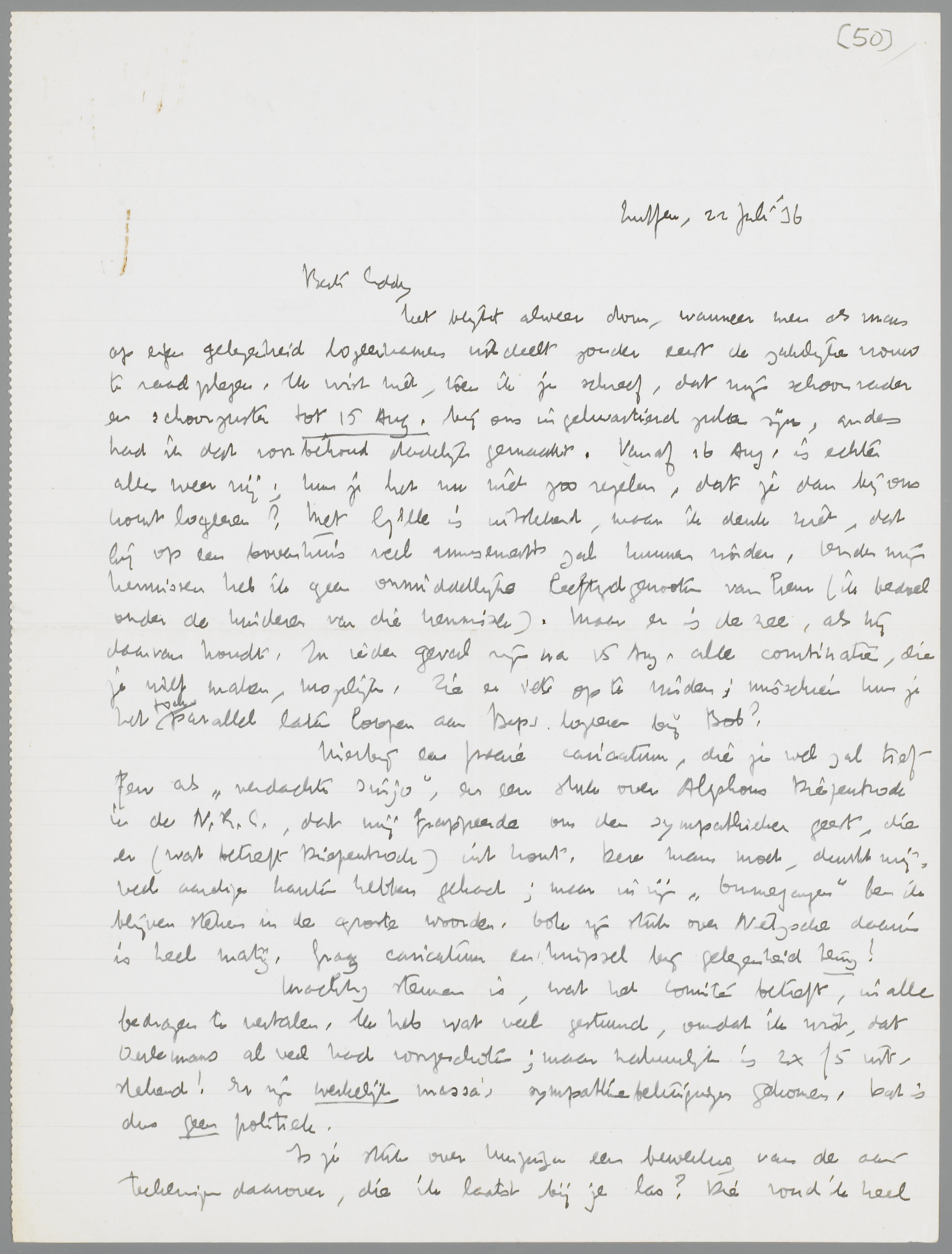 Het blijkt alweer dom, wanneer men als man op eigen gelegenheid logeerkamers uitdeelt zonder eerst de zakelijke vrouw te raadplegen. Ik wist niet, toen ik je schreef, dat mijn schoonvader en schoonzuster tot 15 Aug. bij ons ingekwartierd zullen zijn, anders had ik dat voorbehoud dadelijk gemaakt. Vanaf 16 Aug. is echter alles weer vrij; kun je het nu niet zoo regelen, dat je dan bij ons komt logeeren? Met Gille is uitstekend, maar ik denk niet, dat hij op een bovenhuis veel amusement zal kunnen vinden. Onder mijn kennissen heb ik geen onmiddellijke leeftijdgenoten van hem (ik bedoel onder de kinderen van die tenminste). Maar er is de zee, als hij daarvan houdt. In ieder geval zijn na 15 Aug. alle combinaties, die je wilt maken, mogelijk. Zie er wat op te vinden; misschien kun je het toch parallel laten loopen aan Bep's logeeren bij Bob?