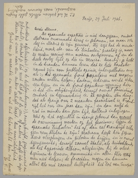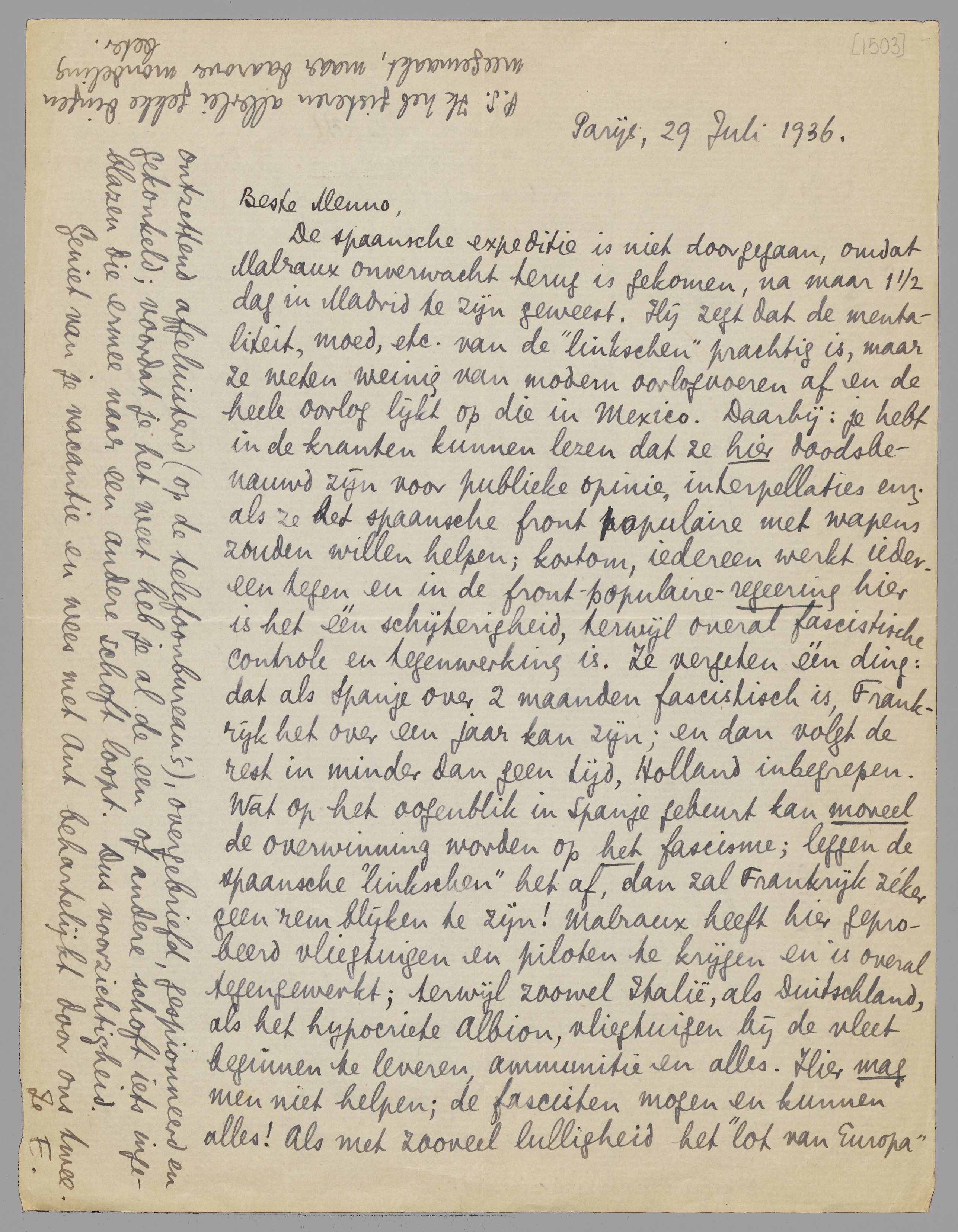 De spaansche expeditie is niet doorgegaan, omdat Malraux onverwacht terug is gekomen, na maar 1 ½ dag in Madrid te zijn geweest. Hij zegt dat de mentaliteit, moed, etc. van de ‘linkschen’ prachtig is, maar ze weten weinig van modern oorlogvoeren af en de heele oorlog lijkt op die in Mexico. Daarbij: je hebt in de kranten kunnen lezen dat ze hier doodsbenauwd zijn voor publieke opinie, interpellaties enz. als ze het spaansche front populaire met wapens zouden willen helpen; kortom, iedereen werkt iedereen tegen en in de front-populaire-regeering hier is het één schijterigheid, terwijl overal fascistische controle en tegenwerking is. Ze vergeten één ding: dat als Spanje over 2 maanden fascistisch is, Frankrijk het over een jaar kan zijn; en dan volgt de rest in minder dan geen tijd, Holland inbegrepen. Wat op het oogenblik in Spanje gebeurt kan moreel de overwinning worden op het fascisme; leggen de spaansche ‘linksen’ het af, dan zal Frankrijk zéker geen rem blijken te zijn! Malraux heeft hier geprobeerd vliegtuigen en piloten te krijgen en is overal tegengewerkt; terwijl zoowel Italië, als Duitschland, als het hypocriete Albion, vliegtuigen bij de vleet beginnen te leveren, ammunitie en alles. Hier mag men niet helpen; de fascisten mogen en kunnen alles! Als met zooveel lulligheid het ‘lot van Europa’ binnenkort fascistisch beslecht is, dan hebben de anderen het werkelijk verdiend. Je kunt geen voorzichtige en diplomatieke menschen stellen tegen resolute die voor niets terugdeinzen.