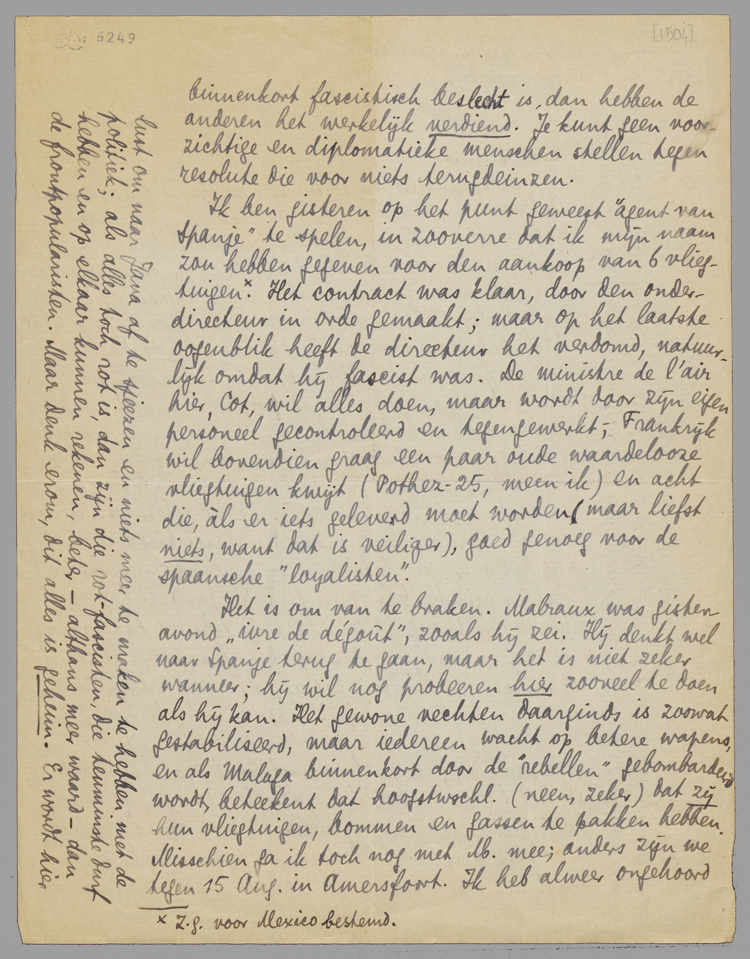 Ik ben gisteren op het punt geweest ‘agent van Spanje’ te spelen, in zooverre dat ik mijn naam zou hebben gegeven voor den aankoop van 6 vliegtuigen. [z.g. voor Mexico bestemd.] Het contract was klaar, door den onderdirecteur in orde gemaakt; maar op het laatste oogenblik heeft de directeur het verdomd, natuurlijk omdat hij fascist was. De ministre de l'air hier, Cot, wil alles doen, maar wordt door zijn eigen personeel gecontroleerd en tegengewerkt; Frankrijk wil bovendien graag een paar oude waardelooze vliegtuigen kwijt (Pothez-25, meen ik) en acht die, àls er iets geleverd moet worden (maar liefst niets, want dat is veiliger), goed genoeg voor de spaansche ‘loyalisten’.