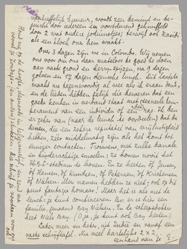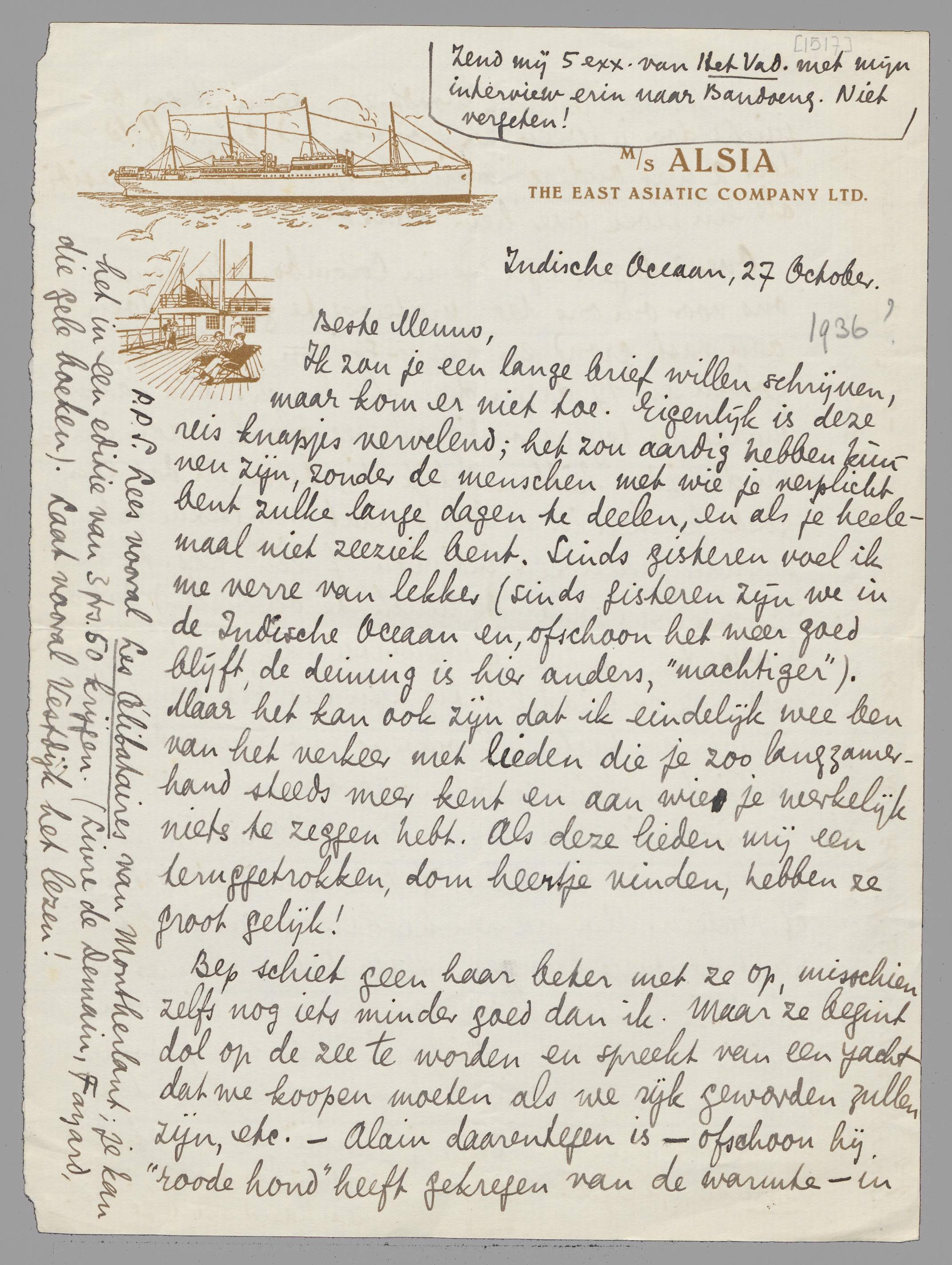 Ik zou je een lange brief willen schrijven, maar kom er niet toe. Eigenlijk is deze reis knapjes vervelend; het zou aardig hebben kùnnen zijn, zonder de menschen met wie je verplicht bent zulke lange dagen te deelen, en als je heelemaal niet zeeziek bent. Sinds gisteren voel ik me verre van lekker (sinds gisteren zijn we in de Indische Oceaan en, ofschoon het weer goed blijft, de deining is hier anders, ‘machtiger’). Maar het kan ook zijn dat ik eindelijk wee ben van het verkeer met lieden die je zoo langzamerhand steeds meer kent en aan wie je werkelijk niets te zeggen hebt. Als deze lieden mij een teruggetrokken, dom heertje vinden, hebben ze groot gelijk!