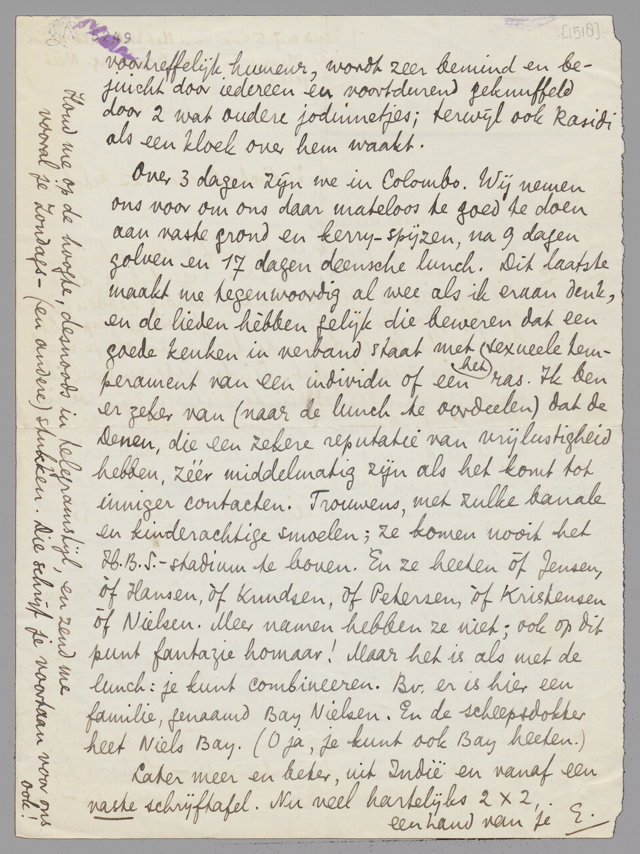 Over 3 dagen zijn we in Colombo. Wij nemen ons voor om ons daar mateloos te goed te doen aan vaste grond en kerryspijzen, na 9 dagen golven en 17 dagen deensche lunch. Dit laatste maakt me tegenwoordig al wee als ik eraan denk, en de lieden hèbben gelijk die beweren dat een goede keuken in verband staat met het sexueele temperament van een individu of een ras. Ik ben er zeker van (naar de lunch te oordeelen) dat de Denen, die een zekere reputatie van vrijlustigheid hebben, zéér middelmatig zijn als het komt tot inniger contacten. Trouwens, met zulke banale en kinderachtige smoelen; ze komen nooit het H.B.S.-stadium te boven. En ze heeten òf Jensen, òf Hansen, òf Knudsen, òf Petersen, òf Kristensen òf Nielsen. Meer namen hebben ze niet; ook op dit punt fantazie homaar! Maar het is als met de lunch: je kunt combineeren. Bv. er is hier een familie, genaamd Bay Nielsen. En de scheepsdokter heet Niels Bay. (O ja, je kunt ook Bay heeten.)
