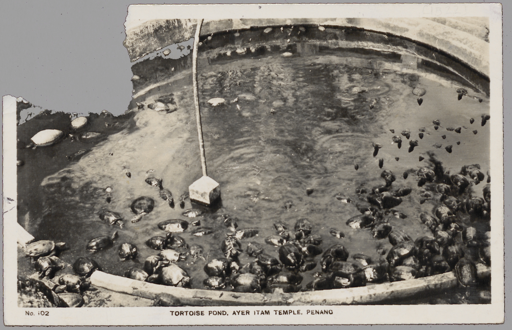 - Ik buste vanmorgen een brief voor je, die al 2 dagen oud was. Dit komt wschl. gelijk, [neen] hoewel ik sindsdien een afscheidsfuif doormaakte (ik zoowat de eenige zonder smoking!) met speeches over ‘Ships that pass in the night’ en dgl. Ik zou toch eens met jou 26 dagen tusschen deze menschen willen leven en dan nog eens praten over de ‘gewone’ menschen. Maar Penang is charmant; het landschap al 100% ‘land van herkomst’; Bep verrukt en vol moed. We zagen een heerlijke boeddh. tempel waarin deze heilige schildpadden (heilig als dikke dames).