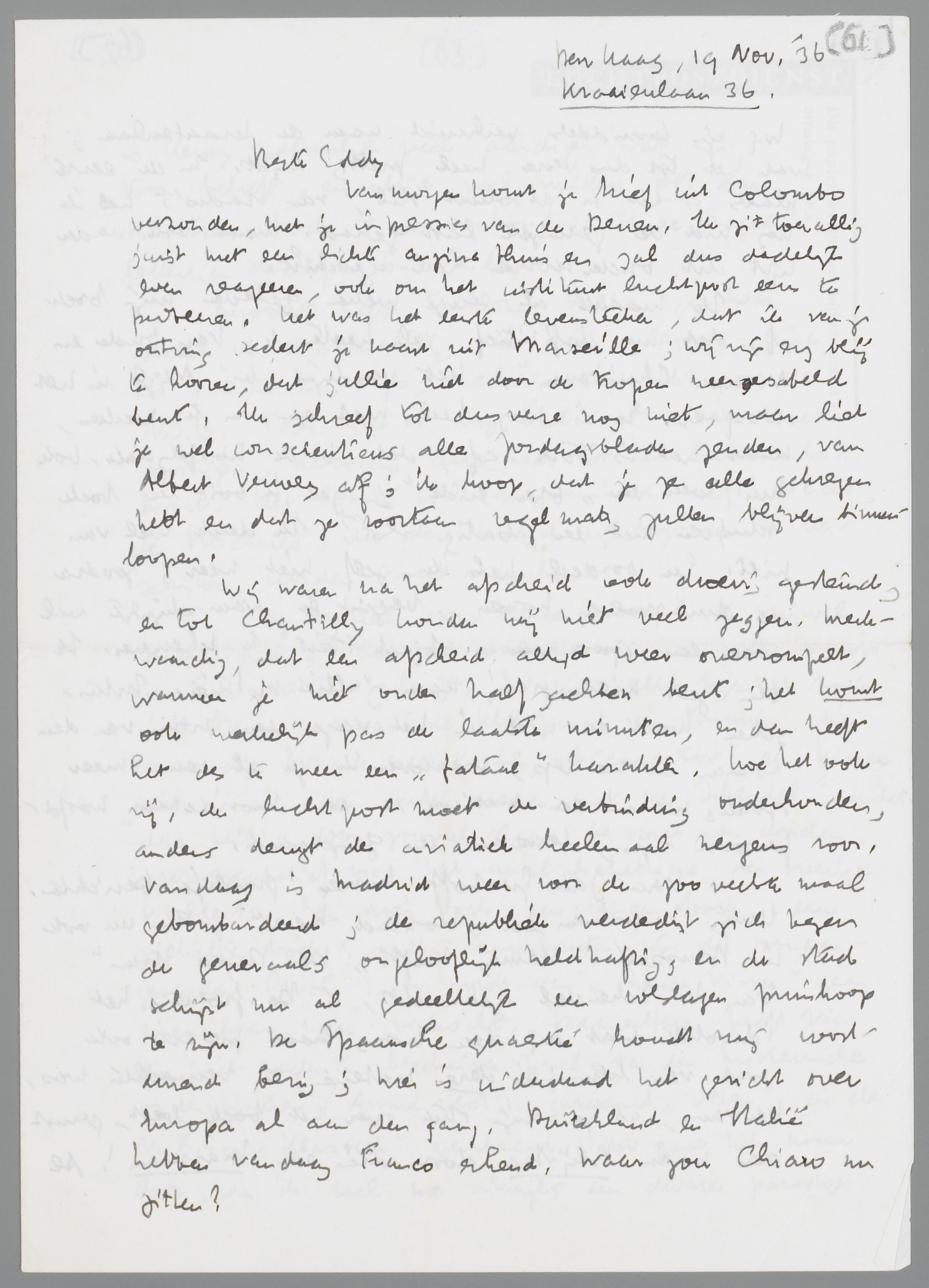 Wij waren na het afscheid ook droevig gestemd, en tot Chantilly konden wij niet veel zeggen. Merkwaardig, dat een afscheid altijd weer overrompelt, wanneer je niet onder halfzachten bent; het komt ook werkelijk pas de laatste minuten, en dan heeft het des te meer een ‘fataal’ karakter. Hoe het ook zij, de luchtpost moet de verbinding onderhouden, anders deugt de aviatiek heelemaal nergens voor. Vandaag is Madrid weer voor de zooveelste maal gebombardeerd; de republiek verdedigt zich tegen de generaals ongelooflijk heldhaftig, en de stad schijnt nu al gedeeltelijk een volslagen puinhoop te zijn. De Spaansche quaestie houdt mij voortdurend bezig; hier is inderdaad het gericht over Europa al aan den gang. Duitschland en Italië hebben vandaag Franco erkend. Waar zou Chiaro nu zitten?