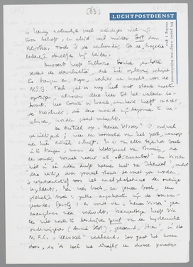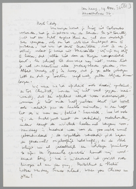 Vanmorgen komt je brief uit Colombo verzonden, met je impressies van de Denen. Ik zit toevallig juist met een lichte angina thuis en zal dus dadelijk even reageeren, ook om het instituut luchtpost eens te probeeren. Het was het eerste levensteeken, dat ik van je ontving sedert je kaart uit Marseille; wij zijn erg blij te hooren, dat jullie niet door de tropen neergesabeld bent. Ik schreef tot dusverre nog niet, maar liet je wel conscientieus alle Zondagsbladen zenden, van Albert Verwey af; ik hoop, dat je ze alle gekregen hebt en dat ze voortaan regelmatig zullen blijven binnenloopen.