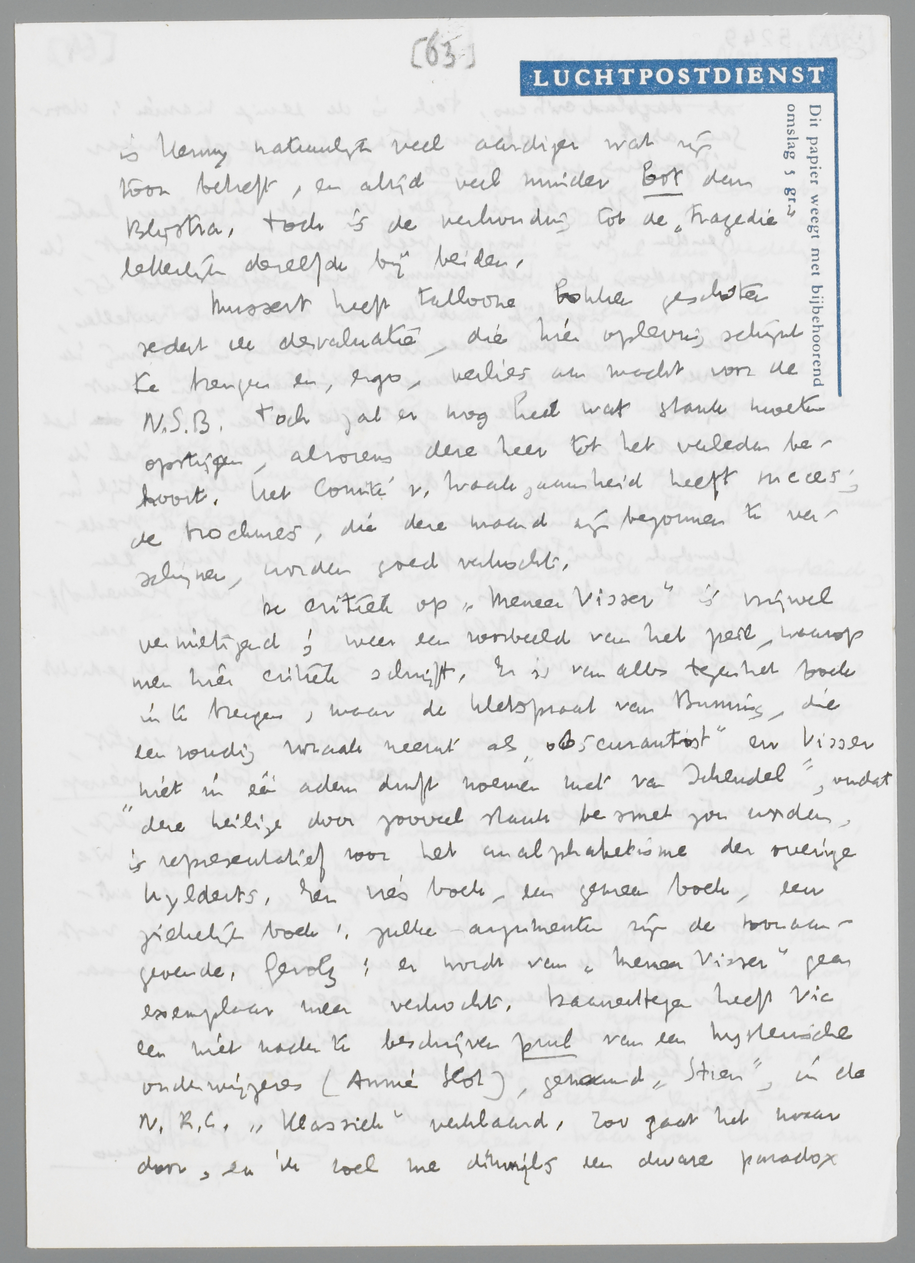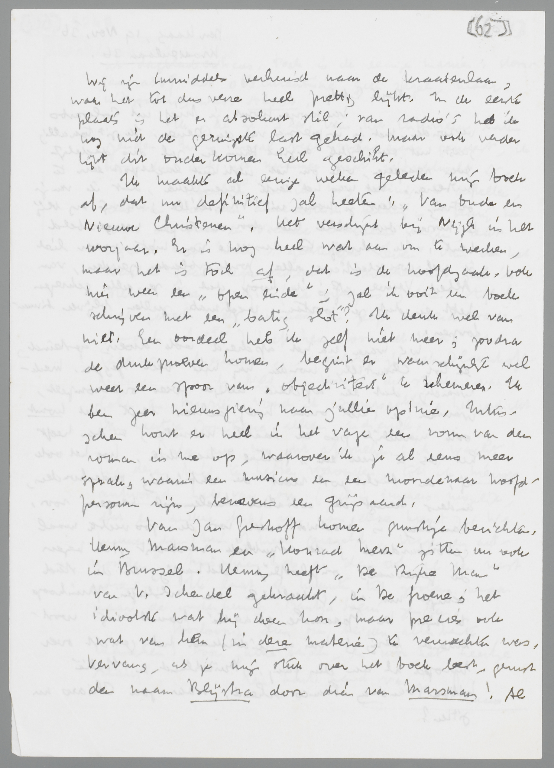 Van Jan Greshoff komen gunstige berichten. Henny Marsman en ‘Konrad Merz’ zitten nu ook in Brussel. Henny heeft De Rijke Man van V. Schendel gekraakt, in De Groene; het idiootste wat hij doen kon, maar precies ook wat van hem (in deze materie) te verwachten was. Vervang, als je mijn stuk over het boek leest, gerust den naam Blijstra door dien van Marsman! Al is Henny natuurlijk veel aardiger wat zijn toon betreft, en altijd veel minder bot dan Blijstra, toch is de verhouding tot de ‘tragedie’ letterlijk dezelfde bij beiden.