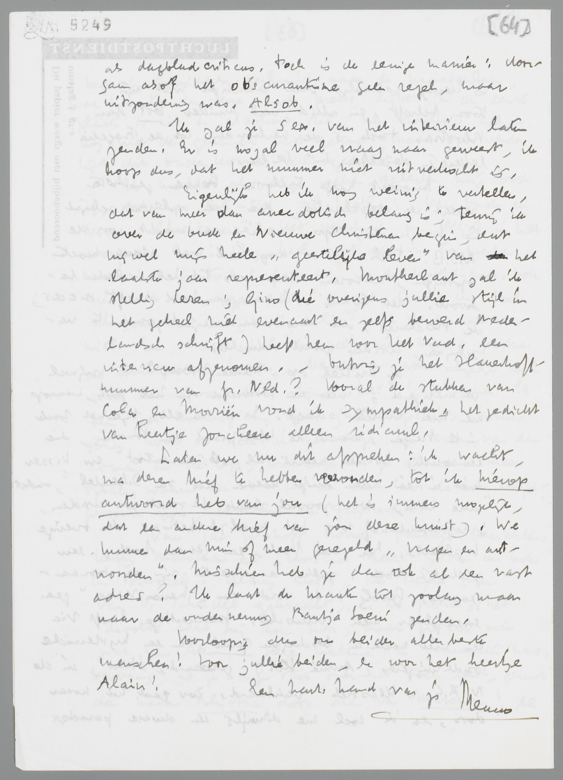 Eigenlijk heb ik nog weinig te vertellen, dat van meer dan anecdotisch belang is; tenzij ik over de Oude en Nieuwe Christenen begin, dat vrijwel mijn heele ‘geestelijke leven’ van het laatste jaar representeert. Montherlant zal ik stellig lezen; Gino (die overigens jullie stijl in het geheel niet evenaart en zelfs beroerd nederlandsch schrijft) heeft hem voor Het Vad. een interview afgenomen. - Ontving je het Slauerhoff-nummer van Gr.Ned.? Vooral de stukken van Cola en Morriën vond ik sympathiek; het gedicht van heertje Joncheere alleen ridicuul.