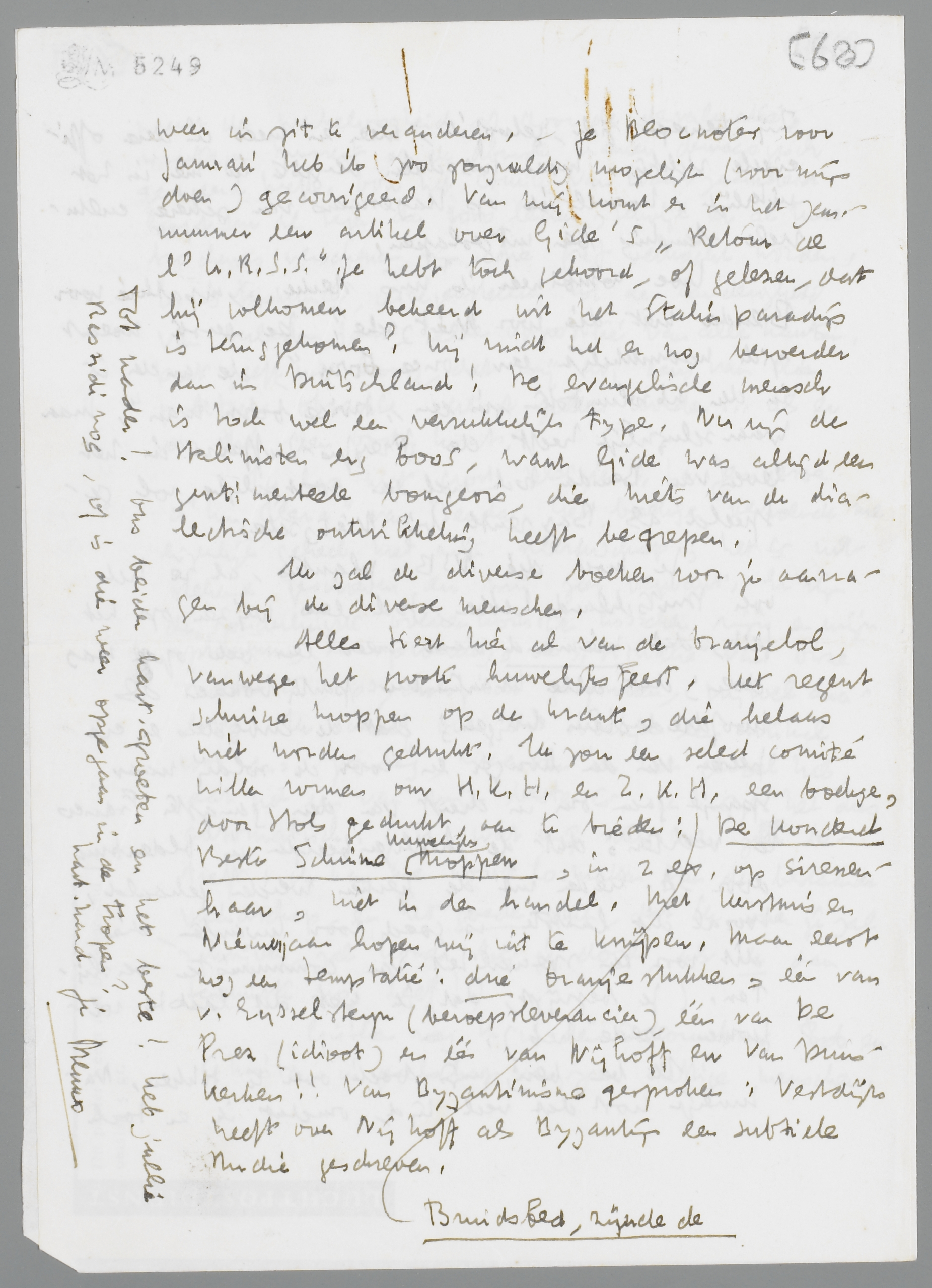 Ik ben bezig mijn boek over te tikken. Natuurlijk kost dat veel tijd, omdat ik er toch weer in zit te veranderen. Je Blocnotes voor Januari heb ik zoo zorgvuldig mogelijk (voor mijn doen) gecorrigeerd. Van mij komt er in het Jan. nummer een artikel over Gide's Retour de l'U.R.S.S. Je hebt toch gehoord, of gelezen, dat hij volkomen bekeerd uit het Stalinparadijs is teruggekomen? Hij vindt het er nog beroerder dan in Duitschland! De evangelische mensch is toch wel een verrukkelijk type. Nu zijn de Stalinisten erg boos, want Gide was altijd een sentimenteele bourgeois, die niets van de dialectische ontwikkeling heeft begrepen.