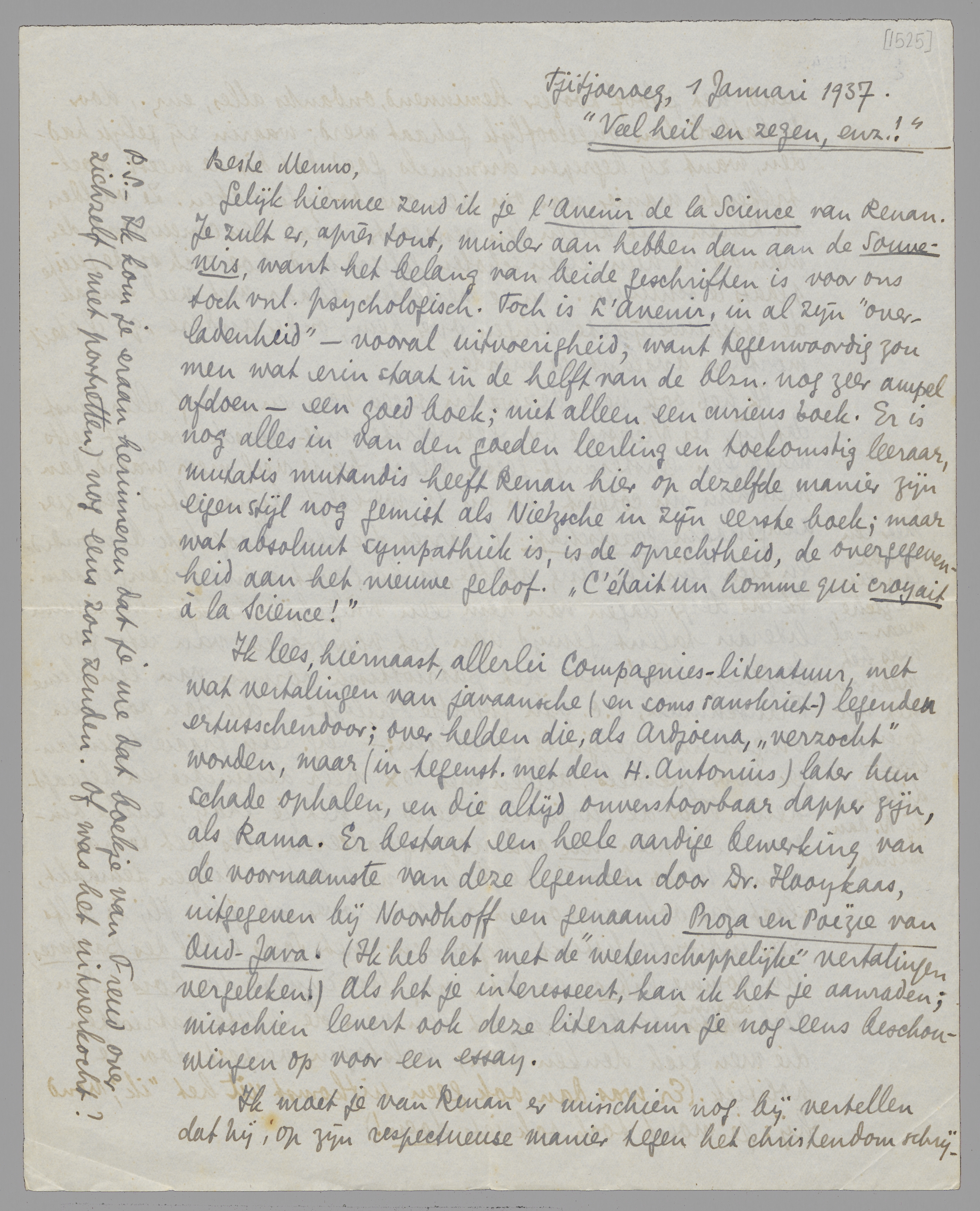 Gelijk hiermee zend ik je l'Avenir de la Science van Renan. Je zult er, après tout, minder aan hebben dan aan de Souvenirs, want het belang van beide geschriften is voor ons toch vnl. psychologisch. Toch is L'Avenir, in al zijn ‘overladenheid’ - vooral uitvoerigheid, want tegenwoordig zou men wat erin staat in de helft van de blzn. nog zeer ampel afdoen - een goed boek; niet alleen een curieus boek. Er is nog alles in van den goeden leerling en toekomstig leeraar, mutatis mutandis heeft Renan hier op dezelfde manier zijn eigen stijl nog gemist als Nietzsche in zijn eerste boek; maar wat absoluut sympathiek is, is de oprechtheid, de overgegevenheid aan het nieuwe geloof. ‘C'était un homme qui croyait à la Science!’