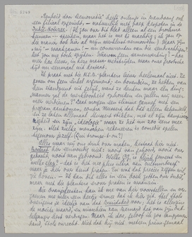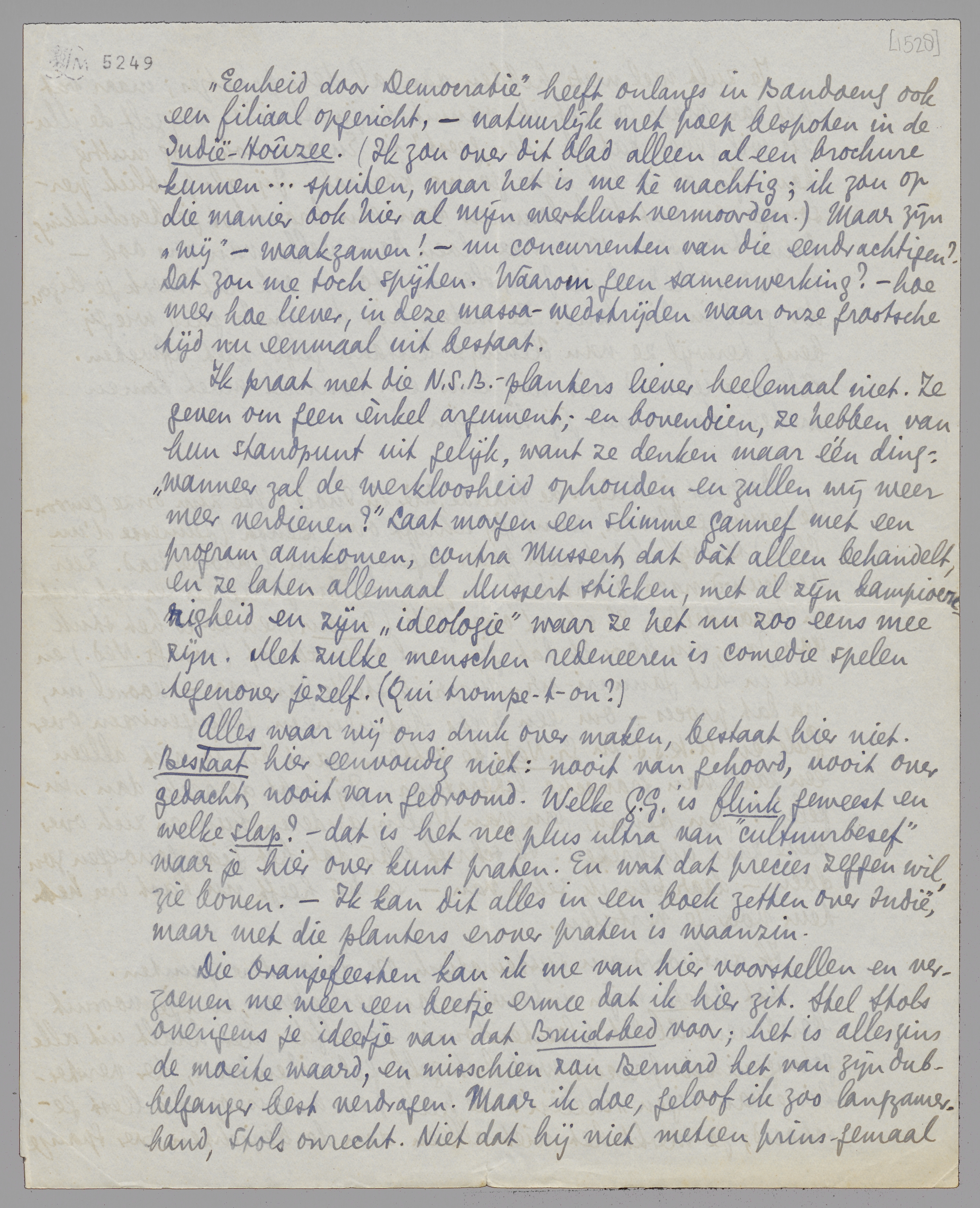 Ik praat met die N.S.B.-planters liever heelemaal niet. Ze geven om geen ènkel argument; en bovendien, ze hebben van hun standpunt uit gelijk, want ze denken maar één ding: ‘wanneer zal de werkloosheid ophouden en zullen wij weer meer verdienen?’ Laat morgen een slimme gannef met een program aankomen, contra Mussert dat dàt alleen behandelt, en ze laten allemaal Mussert stikken, met al zijn kampioenerigheid en zijn ‘ideologie’ waar ze het nu zoo mee eens zijn. Met zulke menschen redeneeren is comedie spelen tegenover jezelf. (Qui trompe-t-on?)