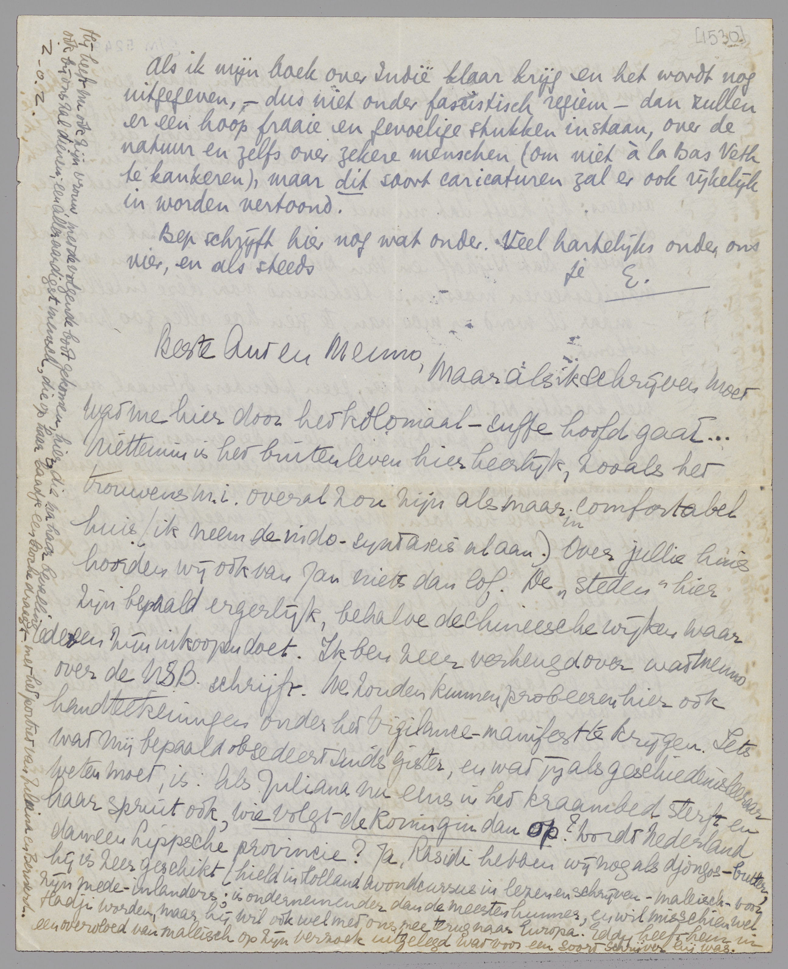 Maar als ik schrijven moet wat me hier door het koloniaal-suffe hoofd gaat... Niettemin is het buitenleven hier heerlijk, zooals het trouwens overal zou zijn als maar in comfortabel huis (ik neem de indo-syntaxis al aan). Over jullie huis hoorden wij ook van Jan niets dan lof. De ‘steden’ hier zijn bepaald ergerlijk, behalve de chineesche wijken waar iedereen zijn inkoopen doet. Ik ben zeer verheugd over wat Menno over de NSB schrijft. We zouden kunnen probeeren hier ook handteekeningen onder het Vigilance-manifest te krijgen. Iets wat mij bepaald obsedeert sinds gister, en wat jij als geschiedenisleeraar weten moet, is: Als Juliana nu eens in het kraambed sterft en haar spruit ook, wie volgt de koningin dan op? Wordt Nederland dan een Lippsche provincie? Ja, Rasidi hebben wij nog als djongos-butler, hij is zeer geschikt (hield in Holland avondcursus in lezen en schrijven - maleisch - voor zijn mede-inlanders; is ondernemender dan de meesten hunner, en wil misschien wel Hadji worden, maar hij wil ook wel met ons meer terug naar Europa. Eddy heeft hem in een overvloed van maleisch op zijn verzoek uitgelegd wat voor een soort schrijver hij was. Hij heeft nu ook zijn vrouw, met de volgende boot gekomen, hier, die na haar bevalling ook bij ons zal dienen; een alleraardigst mensch, die op haar baadje een broche draagt met het portret van Juliana en Bernard.