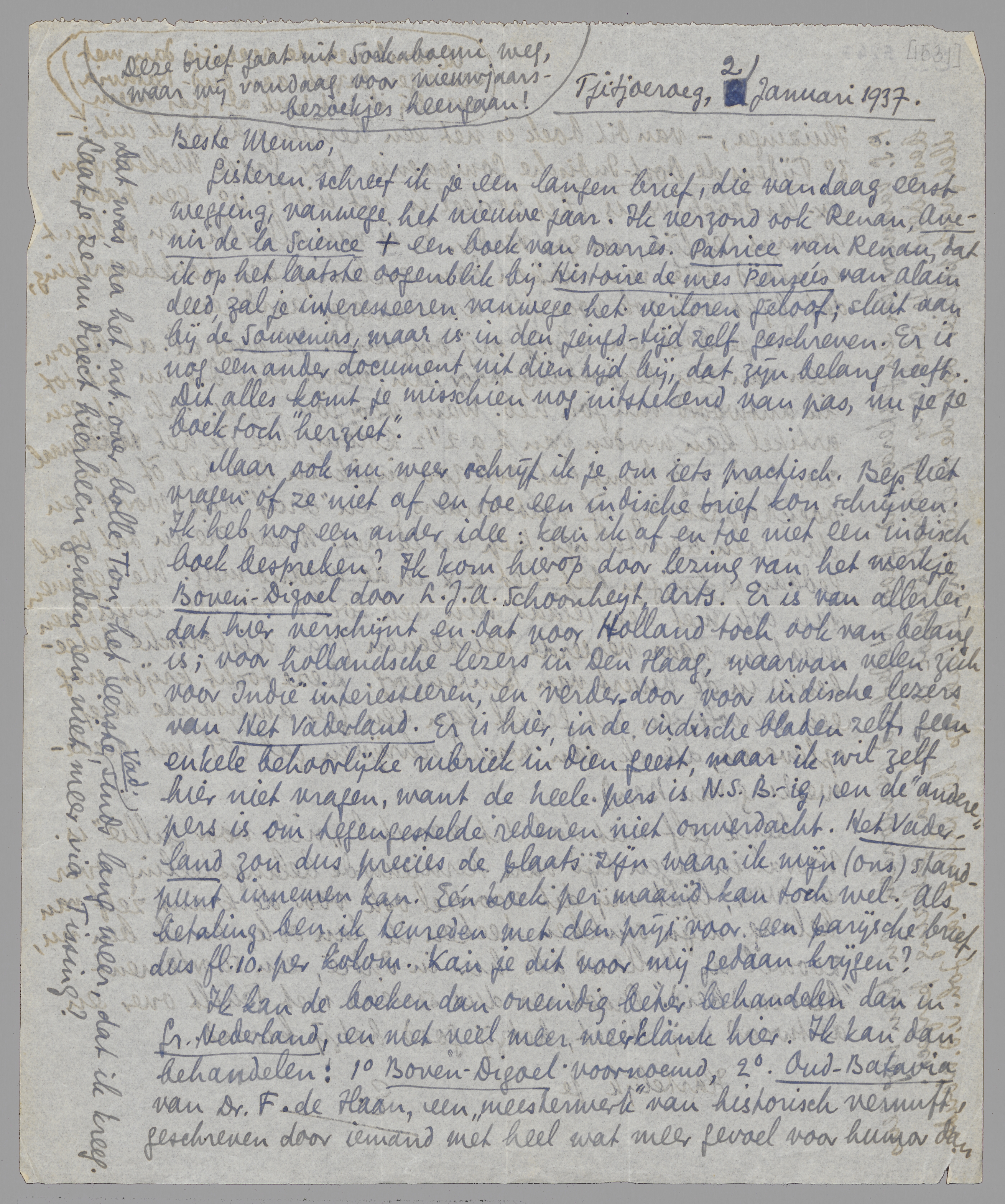 Maar ook nu weer schrijf ik je om iets practisch. Bep liet vragen of ze niet af en toe een indische brief kon schrijven. Ik heb nog een ander idee: kan ik af en toe niet een indisch boek bespreken? Ik kom hierop door lezing van het werkje Boven-Digoel door L.J.A. Schoonheyt, Arts. Er is van allerlei, dat hier verschijnt en dat voor Holland toch ook van belang is; voor hollandsche lezers in Den Haag, waarvan velen zich voor Indië interesseeren, en verder-door voor indische lezers van Het Vaderland. Er is hier, in de indische bladen zelf, geen enkele behoorlijke rubriek in dien geest, maar ik wil zelf hier niet vragen, want de heele pers is N.S.B.-ig, en de ‘andere’ pers is om tegengestelde redenen niet onverdacht. Het Vaderland zou dus precies de plaats zijn waar ik mijn (ons) standpunt innemen kan. Eén boek per maand kan toch wel. Als betaling ben ik tevreden met den prijs voor een parijsche brief, dus fl. 10. per kolom. Kan je dit voor mij gedaan krijgen?
