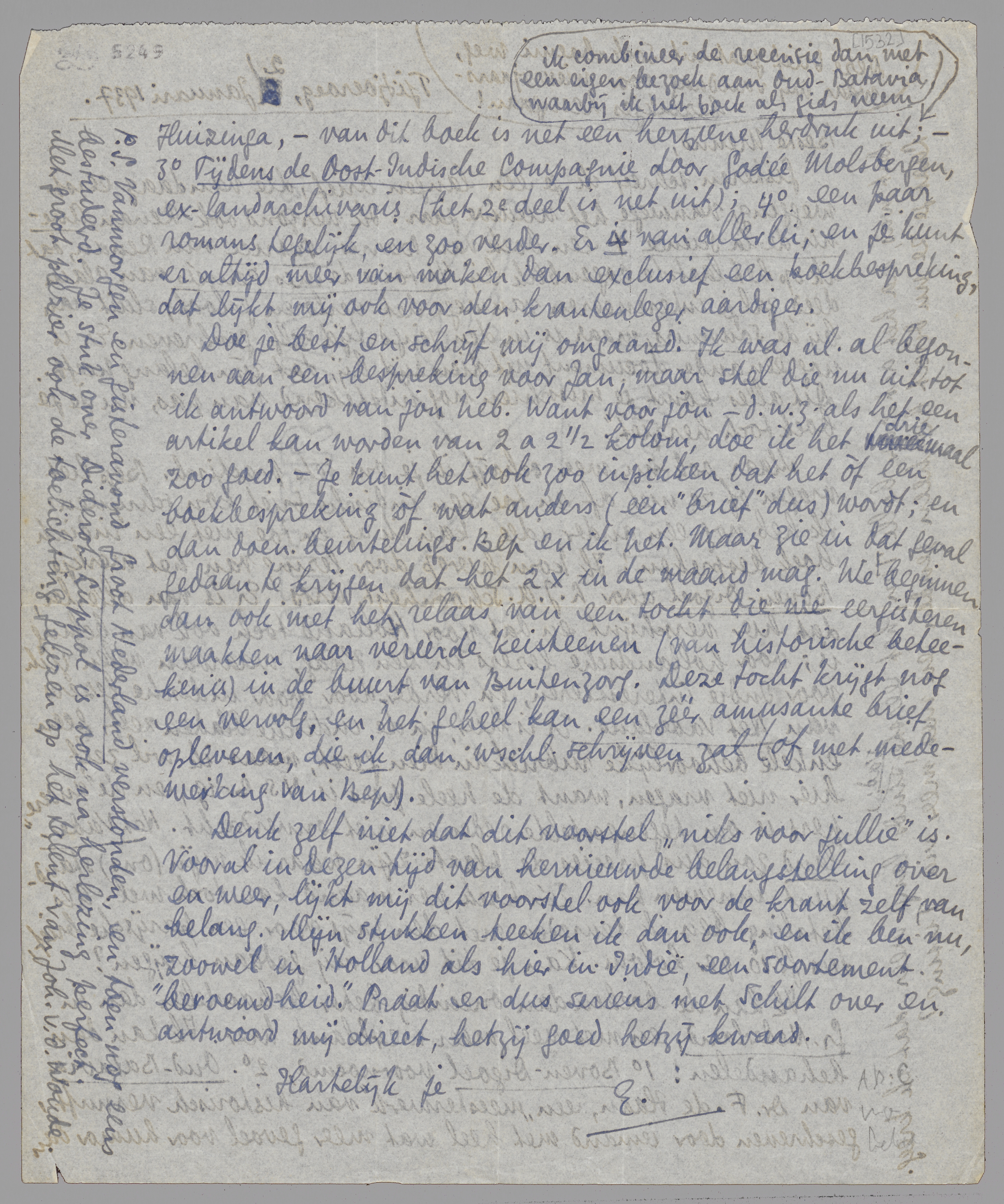 Doe je best en schrijf mij omgaand. Ik was n.l. al begonnen aan een bespreking voor Jan, maar stel die nu uit tot ik antwoord van jou heb. Want voor jou - d.w.z. als het een artikel kan worden van 2 a 2 ½ kolom, doe ik het driemaal zoo goed. - Je kunt het ook zoo inpikken dat het òf een boekbespreking òf wat anders (een ‘brief’ dus) wordt; en dan doen beurtelings Bep en ik het. Maar zie in dat geval gedaan te krijgen dat het 2 × in de maand mag. We beginnen dan ook met het relaas van een tocht die we eergisteren maakten naar vereerde keisteenen (van historische beteekenis) in de buurt van Buitenzorg. Deze tocht krijgt nog een vervolg, en het geheel kan een zéér amusante brief opleveren, die ik dan wschl. schrijven zal (of met medewerking van Bep.)