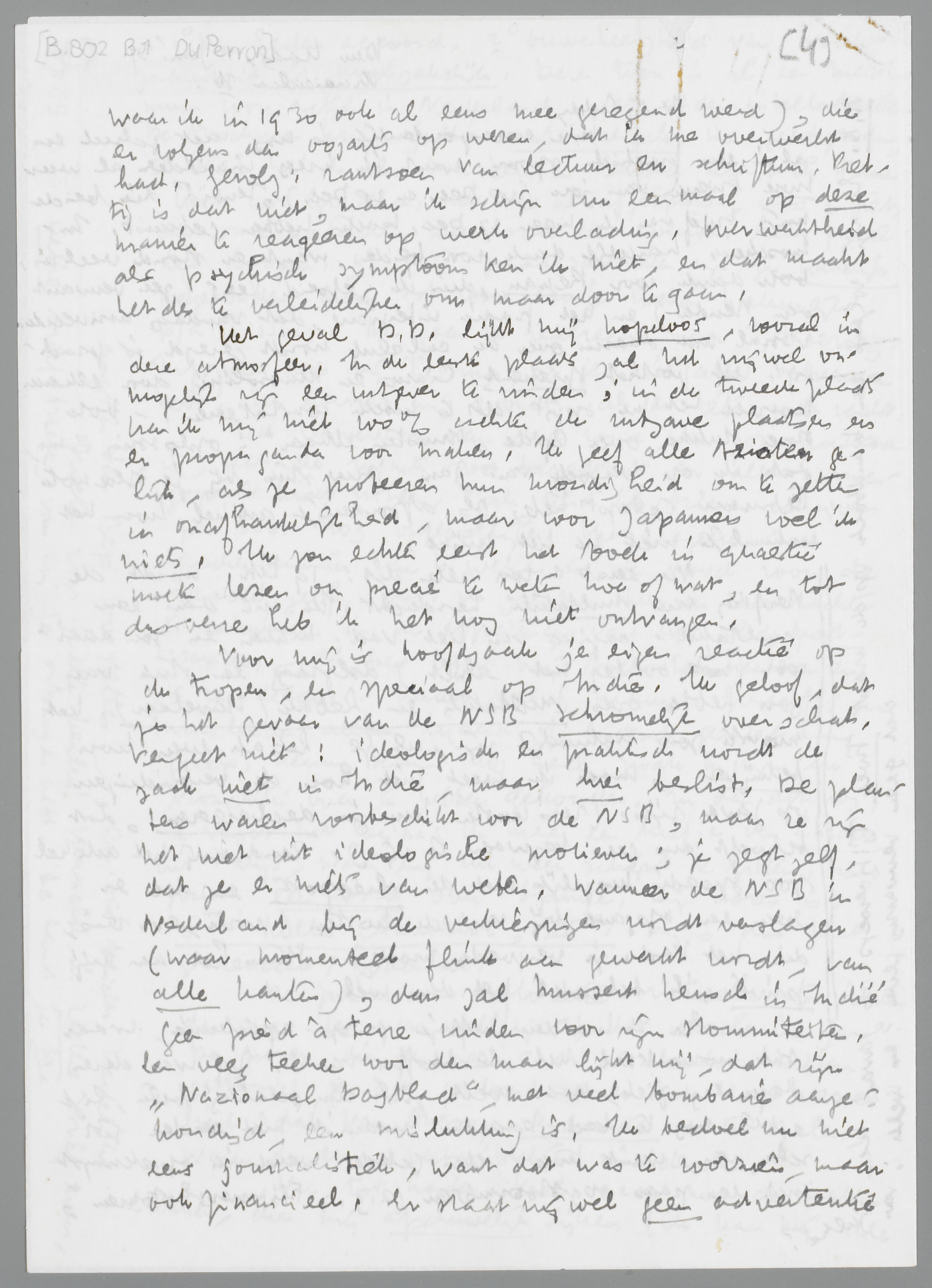 Wat mij vooral treft in je beschrijving van het geval D.D., is weer de dilettantische bestrijding van zoo'n man door het gouvernement. Zoo moet het wilhelminische Duitschland Liebknecht en het Tsaristische Rusland zijn ‘intellectueelen’ bestreden hebben! Een concentratiekamp, of een veemmoord zou veel eenvoudiger zijn dan deze omslachtige procedure. De democratie (en zeker de koloniale) is een wonderlijke paradox. Hoeveel vooroordeelen zijn er niet verdiskonteerd in deze ‘rechten van den mensch en van den burger’, die dan toch maar beletten, dat iemand als D.D. onmiddellijk wordt gefusilleerd, zooals in Duitschland, of eerst latrines mag schoonmaken. Alles welbeschouwd leeft hij nog in een paradijs. In Duitschland is zoojuist een officieel verbod voor schilders afgekomen om families te schilderen met minder dan 4 kinderen, aangezien dat niet in overeenstemming zou zijn met de waardigheid van het kinderenfokkende Rijk. Dit is geen mop!