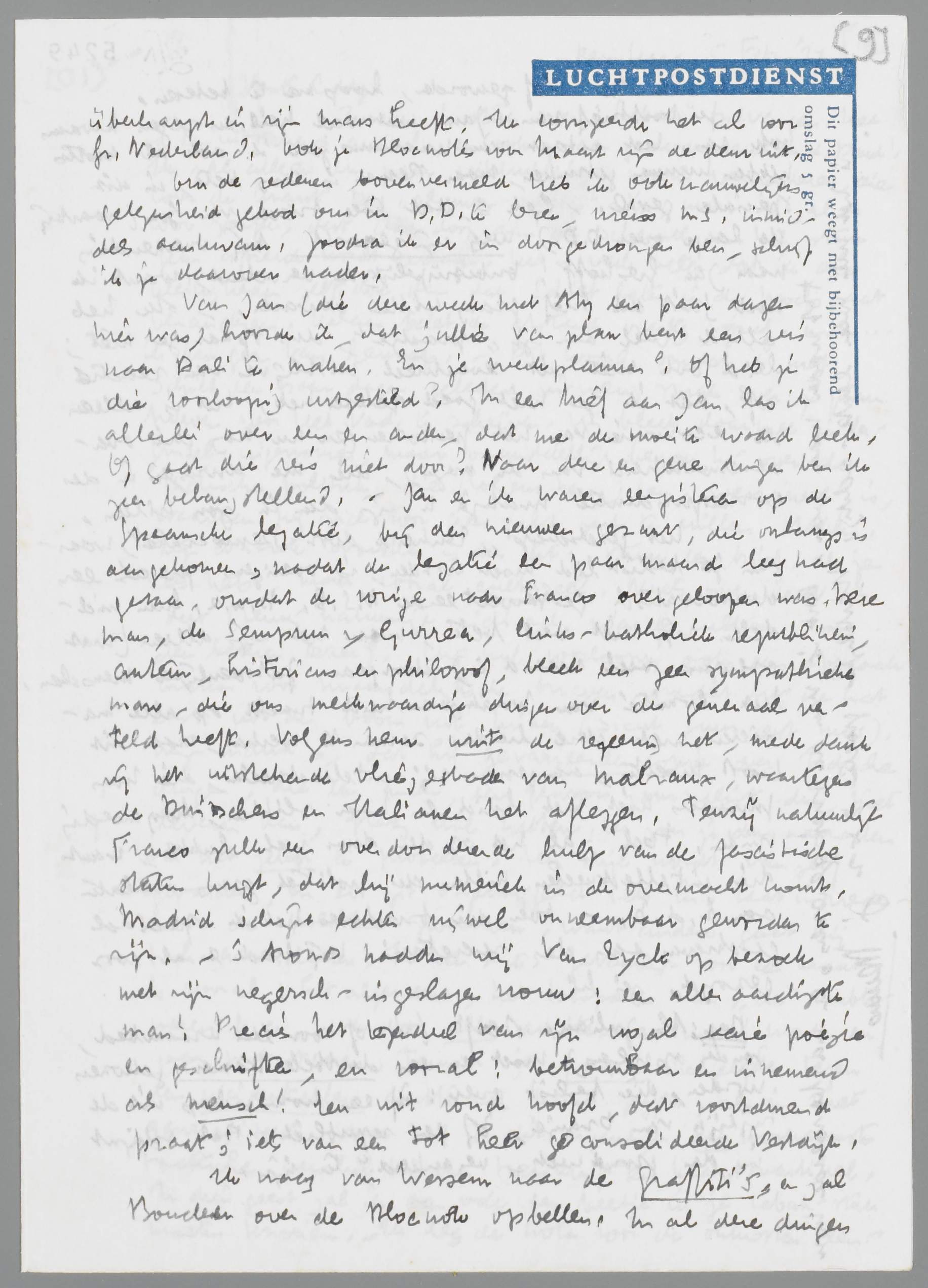 Van Jan (die deze week met Aty een paar dagen hier was) hoorde ik, dat jullie van plan bent een reis naar Bali te maken. En je werkplannen? Of heb je die voorloopig uitgesteld? In een brief aan Jan las ik allerlei over een en ander, dat me de moeite waard leek. Of gaat die reis niet door? Naar deze en gene dingen ben ik zeer belangstellend. - Jan en ik waren eergisteren op de Spaansche legatie, bij den nieuwen gezant, die onlangs is aangekomen, nadat de legatie een paar maand leeg had gestaan, omdat de vorige naar Franco overgeloopen was. Deze man, de Semprun y Gurrea, links-katholiek republikein, auteur, historicus en philosoof, bleek een zeer sympathieke man, die ons merkwaardige dingen over de generaal verteld heeft. Volgens hem wint de regeering het, mede dank zij het uitstekende vliegeskader van Malraux, waartegen de Duitschers en Italianen het afleggen. Tenzij natuurlijk Franco zulk een overdonderende hulp van de fascistische staten krijgt, dat hij numeriek in de overmacht komt. Madrid schijnt echter vrijwel onneembaar geworden te zijn. - 's Avonds hadden wij Van Eyck op bezoek met zijn negersch-ingeslagen vrouw; een alleraardigste man! Precies het tegendeel van zijn nogal saaie poëzie en geschriften, en vooral: betrouwbaar en innemend als mensch! Een wit rond hoofd, dat voortdurend praat; iets van een tot heer geconsolideerde Vestdijk.