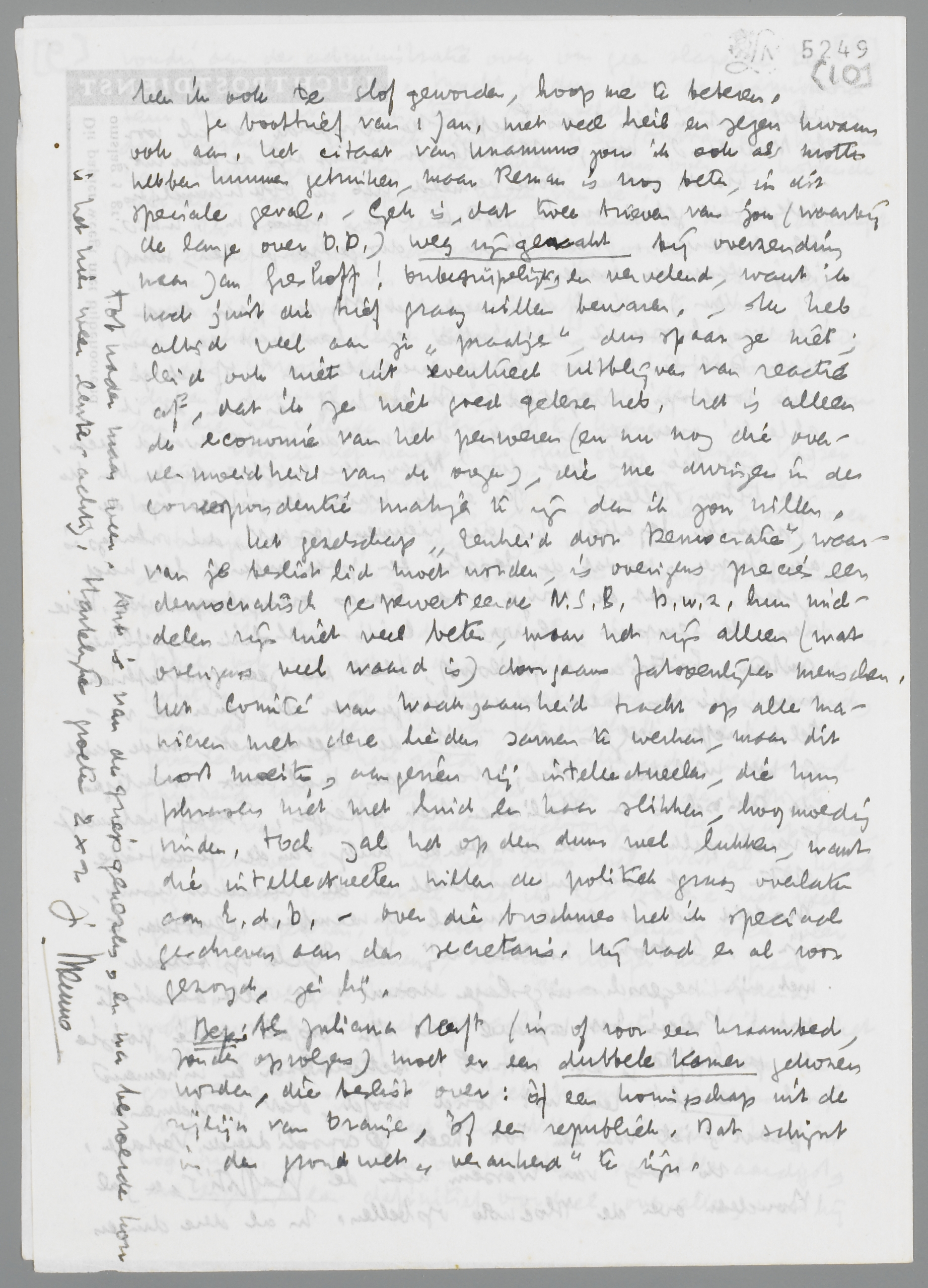 Het gezelschap Eenheid door Democratie, waarvan je beslist lid moet worden, is overigens precies een democratisch geperverteerde N.S.B. D.w.z. hun middelen zijn niet veel beter, maar het zijn alleen (wat overigens veel waard is) doorgaans fatsoenlijker menschen. Het Comité van Waakzaamheid tracht op alle manieren met deze lieden samen te werken, maar dit kost moeite, aangezien zij intellectueelen, die hun phrasen niet met huid en haar slikken, hoogmoedig vinden. Toch zal het op den duur wel lukken, want die intellectueelen willen de politiek graag overlaten aan E.d.D. - Over die brochures heb ik speciaal geschreven aan den secretaris. Hij had er al voor gezorgd, zei hij.