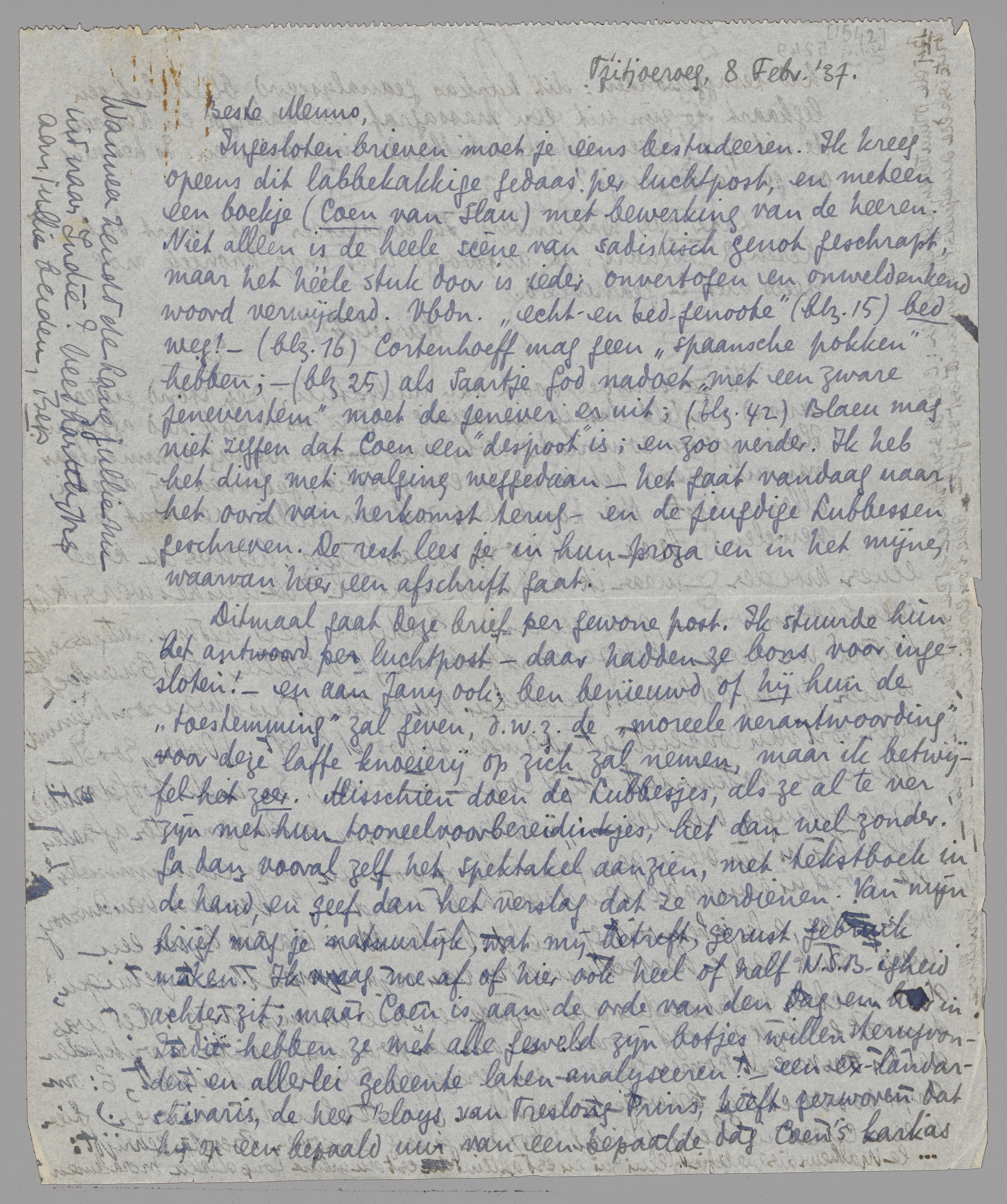Ingesloten brieven moet je eens bestudeeren. Ik kreeg opeens dit labbekakkige gedaas, per luchtpost, en meteen een boekje (Coen van Slau) met bewerking van de heeren. Niet alleen is de heele scène van sadistisch genot geschrapt, maar het hééle stuk door is ieder onvertogen en onweldenkend woord verwijderd. Vbdn. ‘echt-en bed-genoote’ (blz. 15) bed weg! - (blz. 16) Cortenhoeff mag geen ‘spaansche pokken’ hebben; - (blz. 25) als Saartje God nadoet ‘met een zware jeneverstem’ moet de jenever eruit; (blz. 42) Blaeu mag niet zeggen dat Coen een ‘despoot’ is; en zoo verder. Ik heb het ding met walging weggedaan - het gaat vandaag naar het oord van herkomst terug - en de jeugdige Lubbessen geschreven. De rest lees je in hun proza en in het mijne, waarvan hier een afschrift gaat.