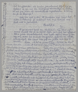 [E.d.P.-d.R.:] Nee, ik kom ervan terug: het was de kreet eener moeder - maar ik heb zelf al aan de winkel waar ik het over hebben wou, geschreven. Eddy vergeet het m.i. interessantste feit dat we deze week gehoord hebben, te vertellen: het bruinboek is hier, vanaf het begin, verboden. Nu onthult zich waarom niemand hier ooit van concentratiekampen gehoord heeft. (Over ‘roode gruwelen’ natuurlijk altijd copie te over). En in de hoofdartikelen opmerkingen als deze: ‘in Holland, waar ze een burgemeester afzetten omdat hij in zijn dorp geen plaats heeft voor een paar communisten wien de grond in hun vaderland wat heet werd...’ Omhels van Anrooy van me, als je hem ooit spreekt. Verbeeld je dat ik bijna een ingez. stuk aan je had gestuurd om van mijn sympathie te getuigen, door E. echter weerhouden als zijnde het ‘niet in mijn stijl’. Het was dan ook eerlijk gezegd vooral: a: om een krantenfascistje te prikkelen, dat bij ons moest komen logeeren en geregeld het Vaderland uitspelt, b: om mijn voorzichtige broertje te ergeren. (Vertel hem dit niet over.) Hier is een citaat uit Lévy-Brühl voor als je nog eens over Benda schrijft: ... le malheur disqualifie. Celui qui en est atteint est du même coup déchu moralement. Bij de primitieven zegt een ander: C' est la souffrance et ce sont les accidents de toute espèce auxquels l'humanité est sujette que l'on considère comme une souillure.