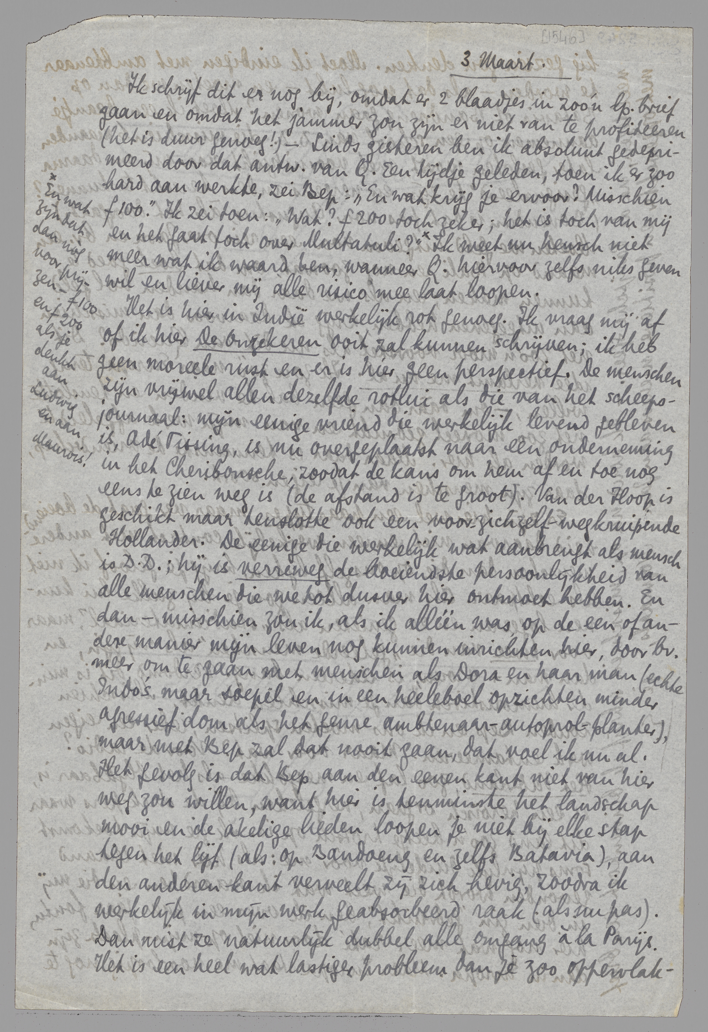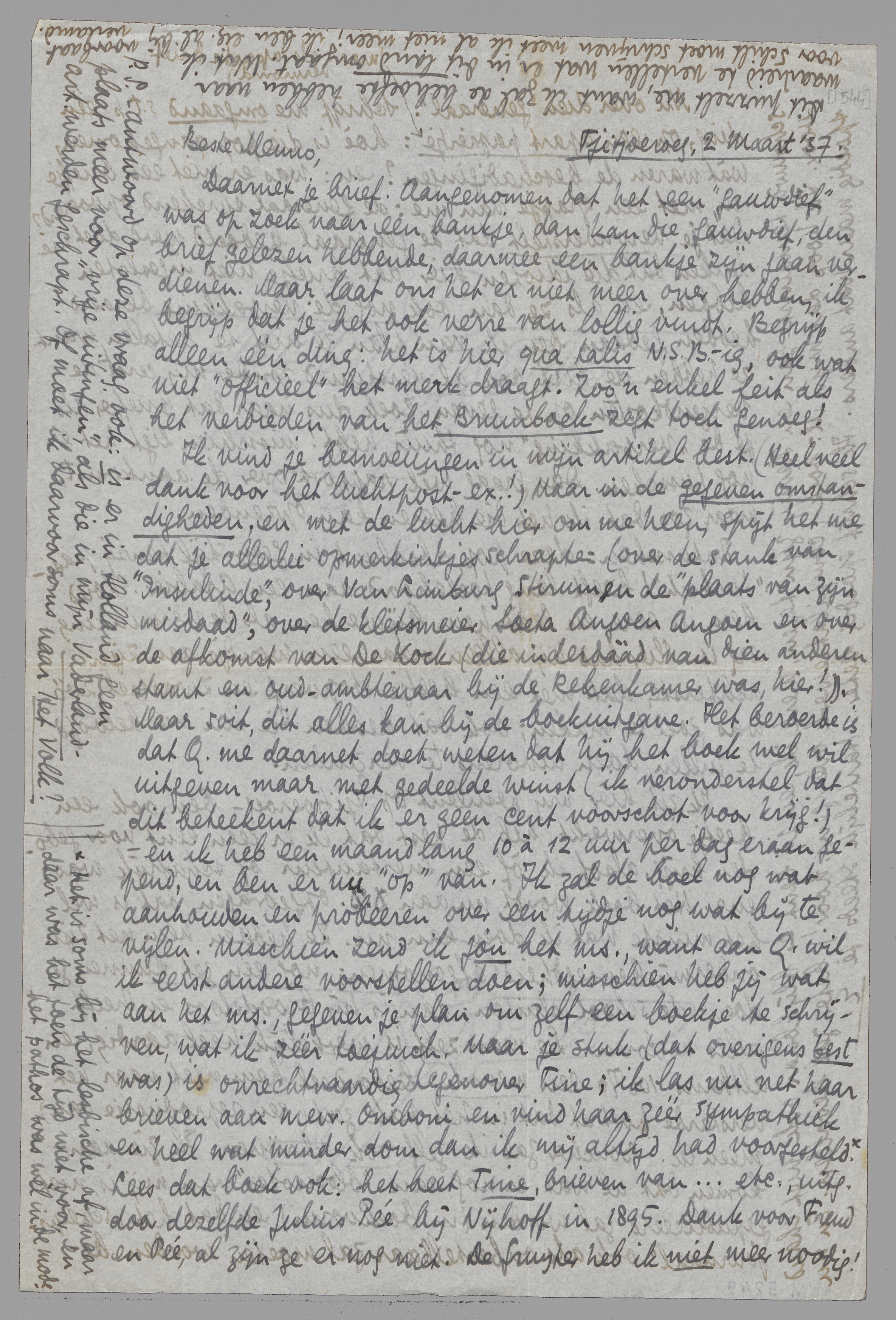 Ik schrijf dit er nog bij, omdat er 2 blaadjes in zoo'n lp. brief gaan en omdat het jammer zou zijn er niet van te profiteeren (het is duur genoeg!) - Sinds gisteren ben ik absoluut gedeprimeerd door dat antw. van Q. Een tijdje geleden, toen ik er zoo hard aan werkte, zei Bep: ‘En wat krijg je ervoor? Misschien ƒ 100.’ Ik zei toen: ‘Wat? ƒ 200 toch zeker; het is toch van mij en het gaat toch over Multatuli?’ [En wat zijn dat dan nòg voor prijzen - ƒ 100 en ƒ 200 als je denkt aan Ludwig en aan Maurois!] Ik weet nu heusch niet meer wat ik waard ben, wanneer Q. hiervoor zelfs niks geven wil en liever mij alle risico mee laat loopen.