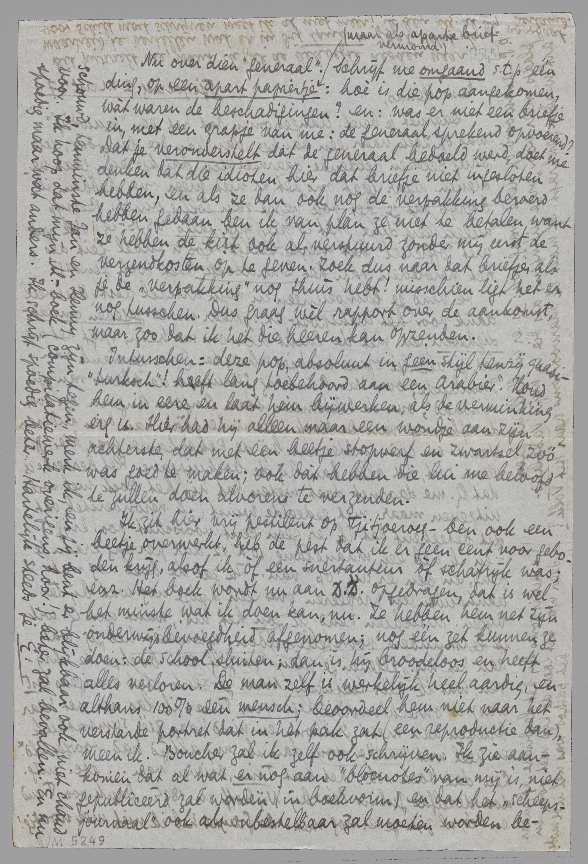 Nu over dien ‘generaal’. Schrijf me omgaand s.t.p. één ding, op een apart papiertje, maar als aparte brief vermomd: hoè is die pop aangekomen, wàt waren de beschadigingen? en: was er niet een briefje in, met een grapje van me: de generaal sprekend opvoerend? Dat je veronderstelt dat de generaal bedoeld werd, doet me denken dat die idioten hier dat briefje niet ingesloten hebben, en als ze dan ook nog de verpakking beroerd hebben gedaan ben ik van plan ze niet te betalen, want ze hebben de kist ook al verstuurd zonder mij eerst de verzendkosten op te geven. Zoek dus naar dat briefje, als je de ‘verpakking’ nog thuis hebt! misschien ligt het er nog tusschen. Dus graag wèl rapport over de aankomst, maar zoo dat ik het die heeren kan opzenden.