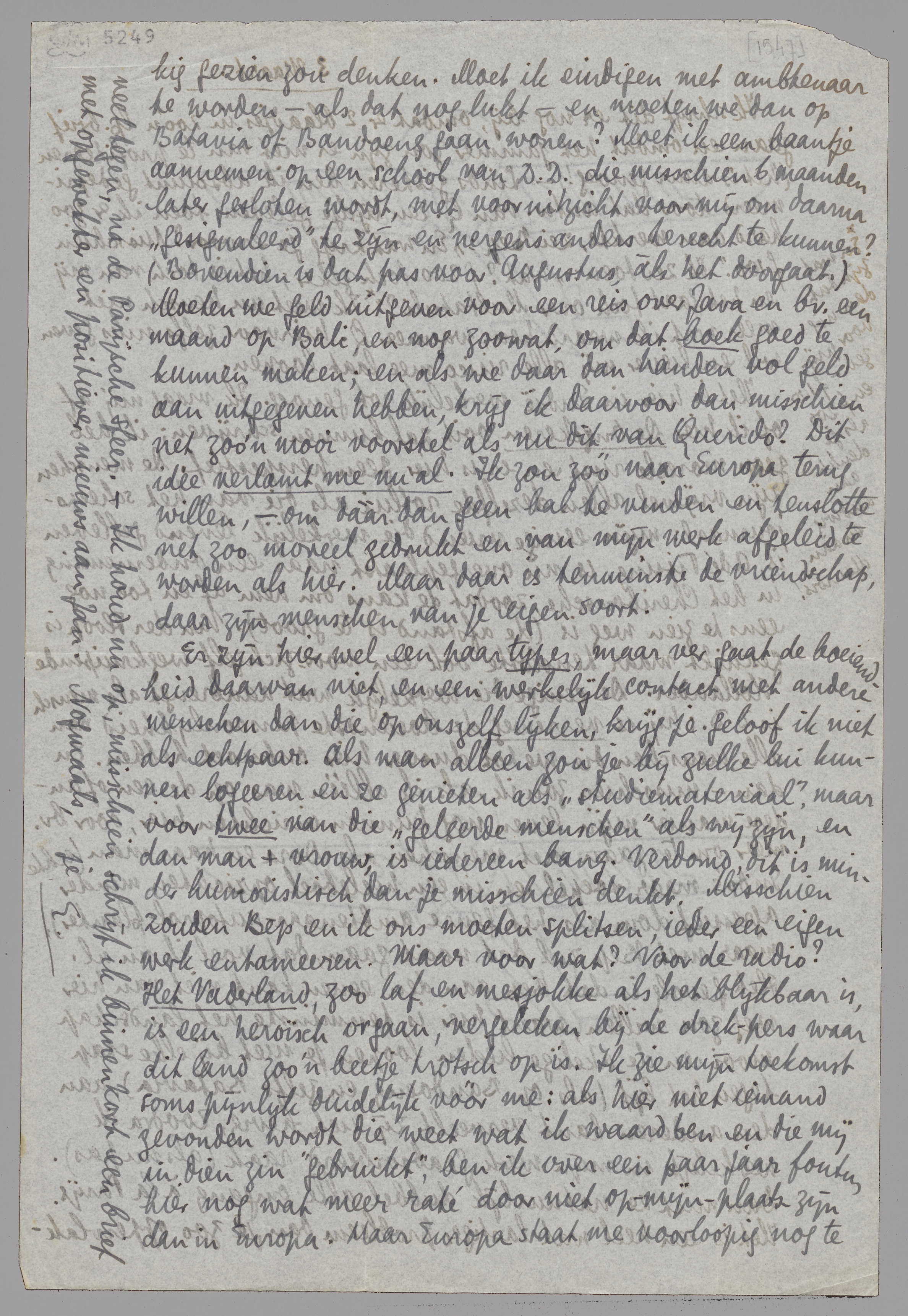 Het is hier in Indië werkelijk rot genoeg. Ik vraag mij af of ik hier De Onzekeren ooit zal kunnen schrijven; ik heb geen moreele rust en er is hier geen perspectief. De menschen zijn vrijwel allen dezelfde rotlui als die van het scheepsjournaal: mijn eenige vriend die werkelijk levend gebleven is, Adé Tissing, is nu overgeplaatst naar een onderneming in het Cheribonsche; zoodat de kans om hem af en toe nog eens te zien weg is (de afstand is te groot). Van der Hoop is geschikt maar tenslotte ook een voor-zichzelf-wegkruipende Hollander. De eenige die werkelijk wat aanbrengt als mensch is D.D.; hij is verreweg de boeiendste persoonlijkheid van alle menschen die we tot dusver hier ontmoet hebben. En dan - misschien zou ik, als ik alléén was, op de een of andere manier mijn leven nog kunnen inrichten hier, door bv. meer om te gaan met menschen als Dora en haar man (echte Indo's maar soepel en in een heeleboel opzichten minder agressief dom als het genre ambtenaar-autoprol-planter), maar met Bep zal dat nooit gaan, dat voel ik nu al. Het gevolg is dat Bep aan den eenen kant niet van hier weg zou willen, want hier is tenminste het landschap mooi en de akelige lieden loopen je niet bij elke stap tegen het lijf (als: op Bandoeng en zelfs Batavia), aan den anderen kant verveelt zij zich hevig, zoodra ik werkelijk in mijn werk geabsorbeerd raak (als nu pas). Dan mist ze natuurlijk dubbel alle omgang à la Parijs. Het is een heel wat lastiger probleem dan je zoo oppervlakkig gezien zou denken. Moet ik eindigen met ambtenaar te worden - als dat nog lukt - en moeten we dan op Batavia of Bandoeng gaan wonen? Moet ik een baantje aannemen op een school van D.D. die misschien 6 maanden later gesloten wordt, met vooruitzicht voor mij om daarna ‘gesignaleerd’ te zijn en nergens anders terecht te kunnen? (Bovendien is dat pas voor Augustus, àls het doorgaat.) Moeten we geld uitgeven voor een reis over Java en bv. een maand op Bali, en nog zoowat, om dat boek goed te kunnen maken; en als we daar dan handen vol geld aan uitgegeven hebben, krijg ik daarvoor dan misschien net zoo'n mooi voorstel als nu dit van Querido? Dit idee verlamt me nu al. Ik zou zóó naar Europa terug willen, - om dààr dan geen bal te vinden en tenslotte net zoo moreel gedrukt en van mijn werk afgeleid te worden als hier. Maar daar is tenminste de vriendschap, daar zijn menschen van je eigen soort.