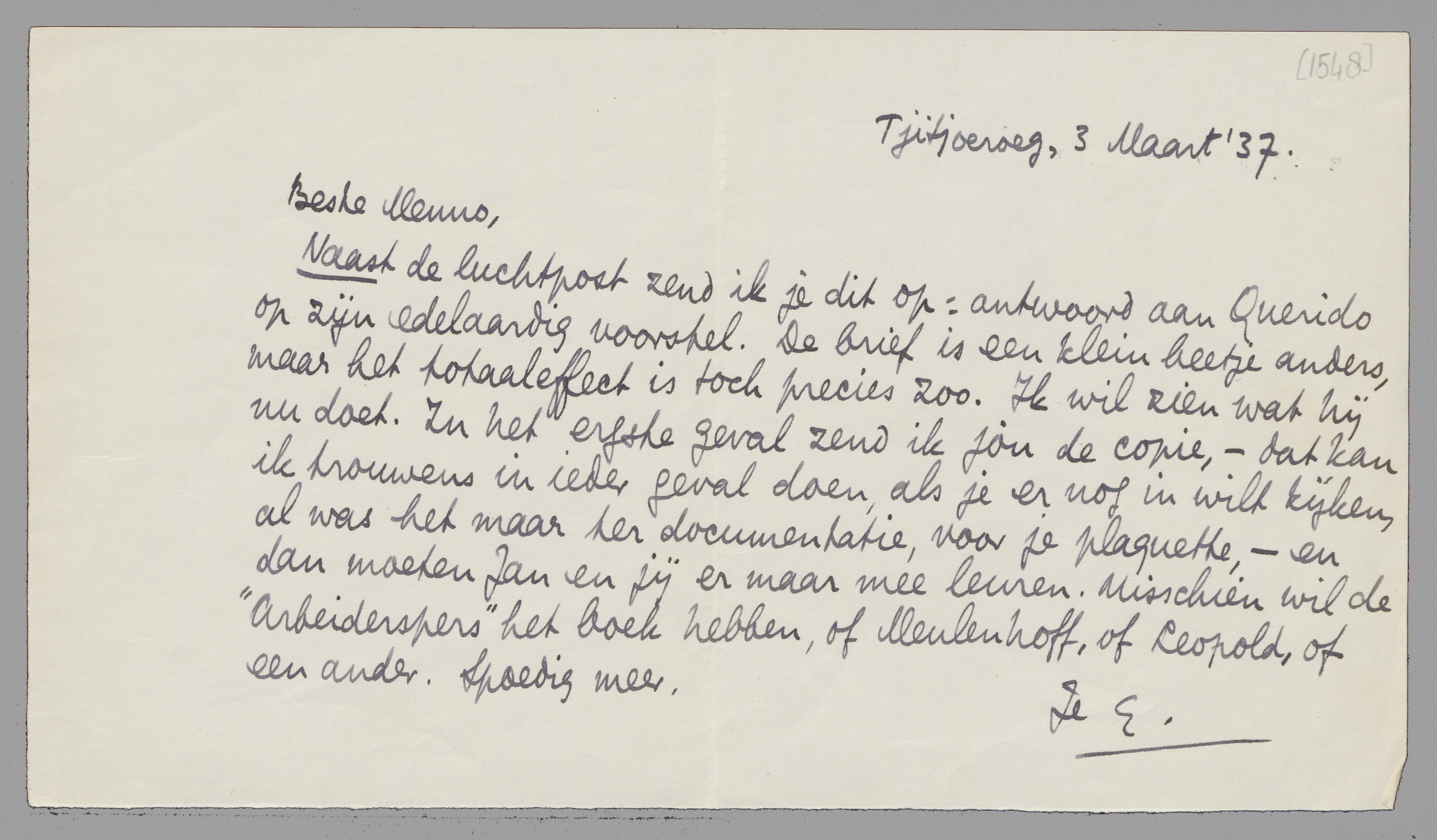 Naast de luchtpost zend ik je dit op: antwoord aan Querido op zijn edelaardig voorstel. De brief is een klein beetje anders, maar het totaaleffect is toch precies zoo. Ik wil zien wat hij nu doet. In het ergste geval zend ik jou de copie, - dat kan ik trouwens in ieder geval doen, als je er nog in wilt kijken, al was het maar ter documentatie, voor je plaquette, - en dan moeten Jan en jij er maar mee leuren. Misschien wil de Arbeiderspers het boek hebben, of Meulenhoff, of Leopold, of een ander. Spoedig meer.