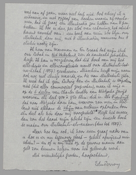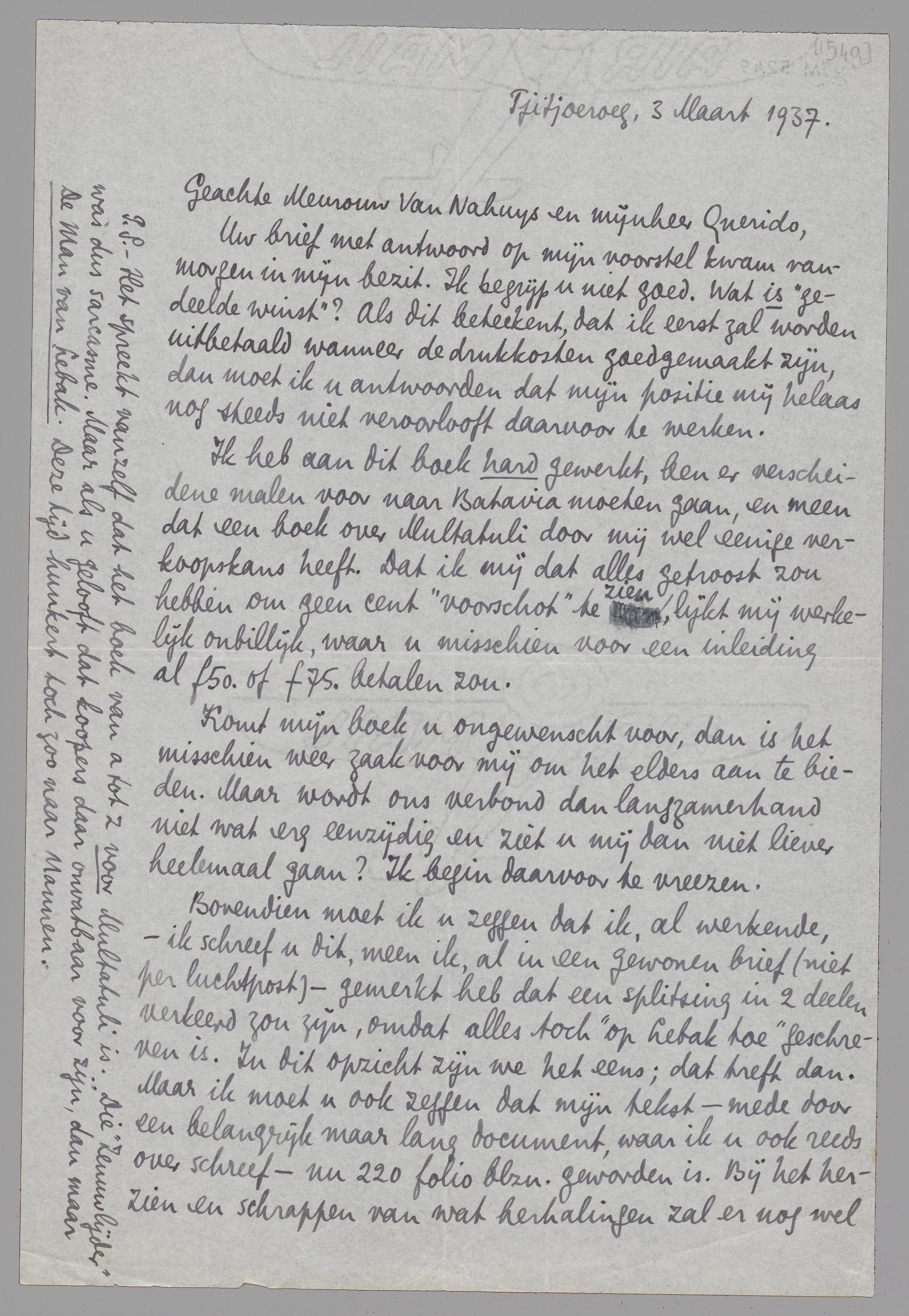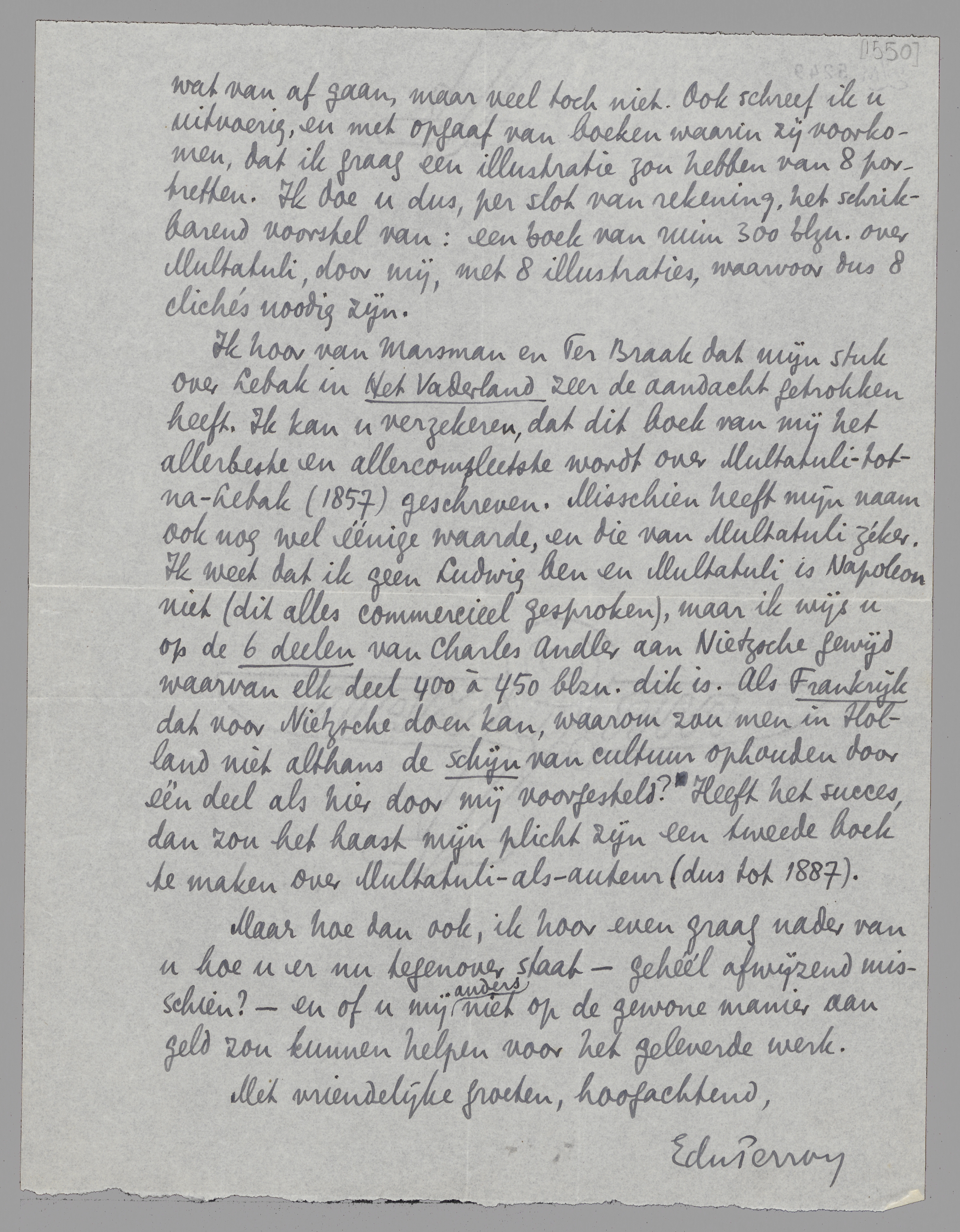 Ik heb aan dit boek hard gewerkt, ben er verscheidene malen voor naar Batavia moeten gaan, en meen dat een boek over Multatuli door mij wel eenige verkoopskans heeft. Dat ik mij dat alles getroost zou hebben om geen cent ‘voorschot’ te zien, lijkt mij werkelijk onbillijk, waar u misschien voor een inleiding al ƒ 50. of ƒ 75. betalen zou.
