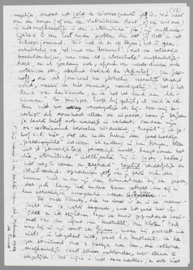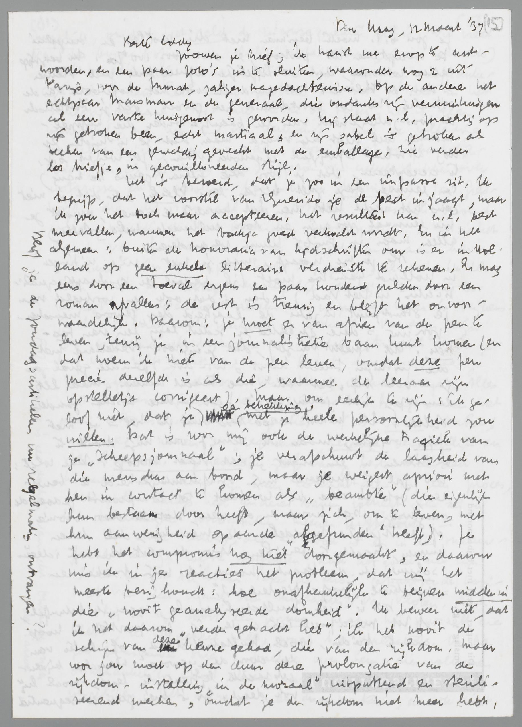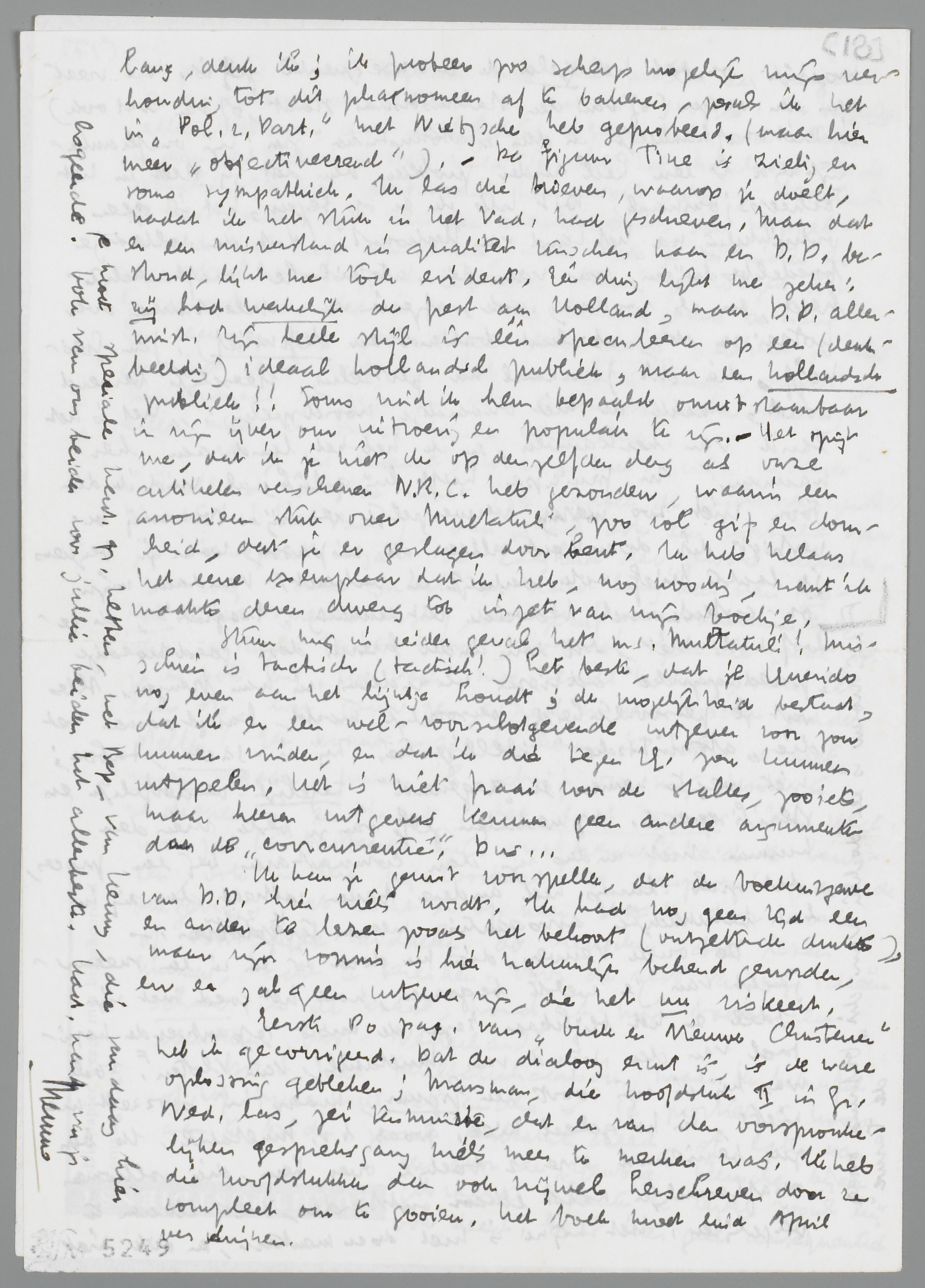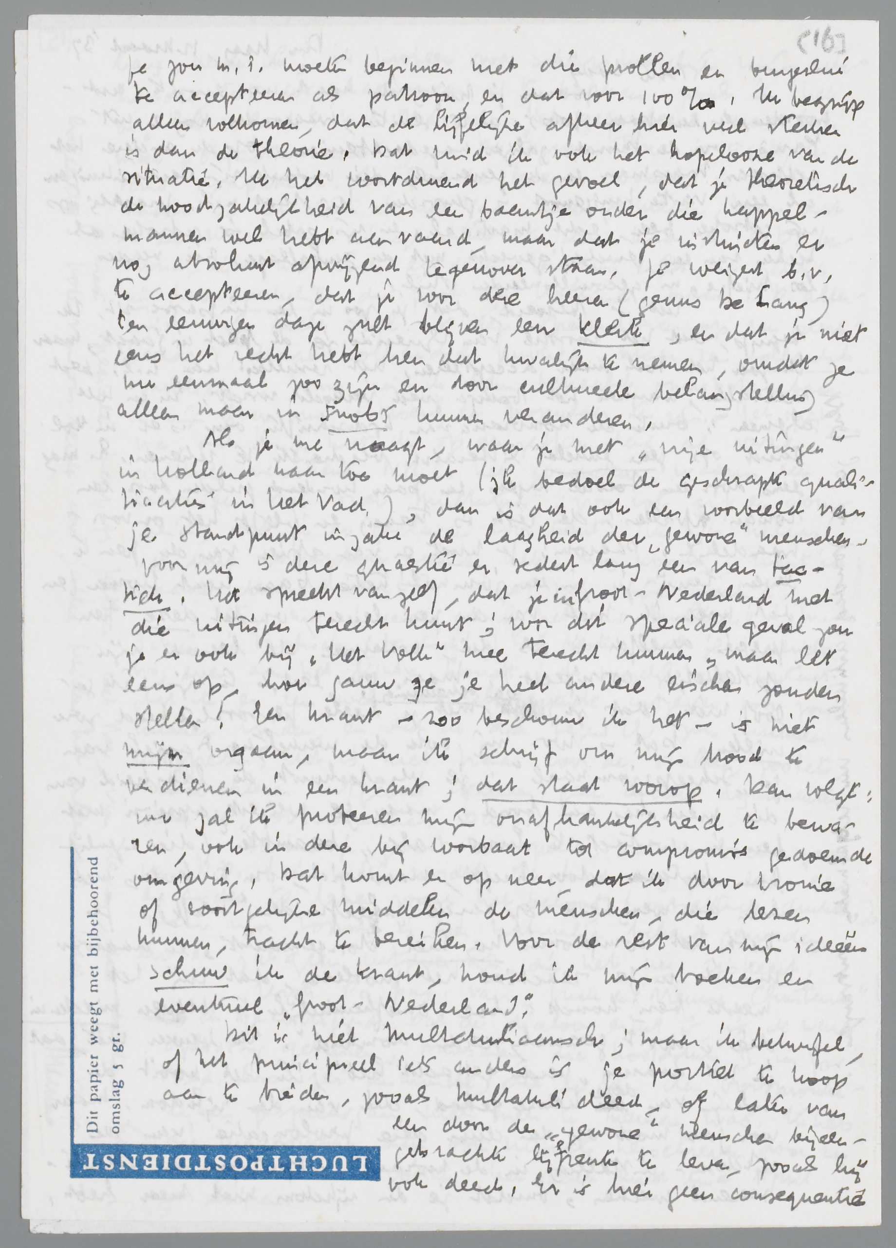 Als je me vraagt, waar je met ‘vrije uitingen’ in Holland naar toe moet (ik bedoel de geschrapte qualificaties in het Vad.), dan is dat ook een voorbeeld van je standpunt inzake de laagheid der ‘gewone’ menschen. Voor mij is deze quaestie er sedert lang een van tactiek. Het spreekt vanzelf, dat je in Groot-Nederland met die uitingen terecht kunt; voor dit speciale geval zou je er ook bij Het Volk mee terecht kunnen, maar let eens op, hoe gauw ze je heel andere eischen zouden stellen! Een krant - zoo beschouw ik het - is niet mijn orgaan, maar ik schrijf om mijn brood te verdienen in een krant; dat staat voorop. Dan volgt: nu zal ik probeeren mijn onafhankelijkheid te bewaren, ook in deze bij voorbaat tot compromis gedoemde omgeving. Dat komt er op neer, dat ik door ironie of soortgelijke middelen de menschen, die lezen kunnen, tracht te bereiken. Voor de rest van mijn ideeën schuw ik de krant, houd ik mijn boeken en eventueel Groot-Nederland.