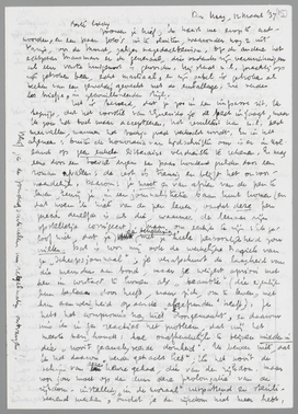 De oude Verwey, die nu dood is en in een sneeuwjacht van je welste begraven, had het goed met zijn Idee en het blijkbaar tegen de crisis gepantserde kapitaal van den vijand van Multatuli, Van Vloten. [Zijn vrouw is een dochter van dit ‘Onkruid onder de Tarwe’.] Toch was hij in zijn soort een figuur, maar hij puzzelt me niets, in het geheel niet, zooals bijv. Multatuli. Ik ben zeer benieuwd onze 2 boekjes over hem, die volkomen onafhankelijk naast elkaar ontstonden, met elkaar te vergelijken. Het mijne is niet documentair, en ook niet lang, denk ik; ik probeer zoo scherp mogelijk mijn verhouding tot dit phaenomeen af te bakenen, zooals ik het in Pol. z. Part. met Nietzsche heb geprobeerd. (maar hier meer ‘objectiveerend’). - De figuur Tine is zielig en soms sympathiek. Ik las die brieven, waarop je doelt, nadat ik het stuk in Het Vad. had geschreven. Maar dat er een misverstand in qualiteit tusschen haar en D.D. bestond, lijkt me toch evident. Eén ding lijkt me zeker: zij had werkelijk de pest aan Holland, maar D.D. allerminst. Zijn heele stijl is één speculeeren op een (denkbeeldig) ideaal hollandsch publiek, maar een hollandsch publiek!! Soms vind ik hem bepaald onuitstaanbaar in zijn ijver om uitvoerig en populair te zijn. - Het spijt me, dat ik je niet de op denzelfden dag als onze artikelen verschenen N.R.C. heb gezonden, waarin een anoniem stuk over Multatuli, zoo vol gif en domheid, dat je er geslagen door bent. Ik heb helaas het eene exemplaar dat ik heb, nog noodig, want ik maakte dezen dwerg tot inzet van mijn boekje.