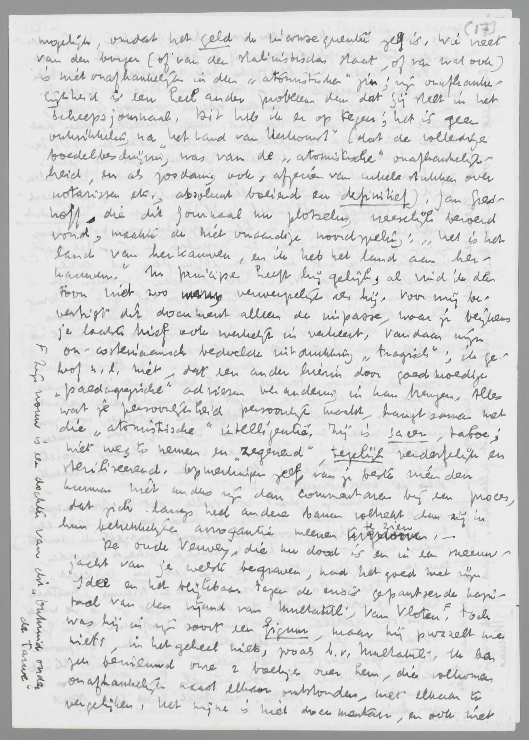Dit is niet Multatuliaansch; maar ik betwijfel, of het principieel iets anders is je portret te koop aan te bieden, zooals Multatuli deed, of later van een door de ‘gewone’ menschen bijeengebrachte lijfrente te leven, zooals hij ook deed. Er is hier geen consequentie mogelijk, omdat het geld de inconsequentie zelf is. Wie vreet van den burger (of van den stalinistischen staat, of van wat ook) is niet onafhankelijk in den ‘atomistischen’ zin; zijn onafhankelijkheid is een heel ander probleem dan dat jij stelt in het Scheepsjournaal. Dit heb ik er op tegen; het is geen ontwikkeling na Het Land van Herkomst (dat de volledige boedelbeschrijving was van de ‘atomistische’ onafhankelijkheid, en als zoodanig ook, afgezien van enkele stukken over notarissen etc., absoluut boeiend en definitief). Jan Greshoff, die dit journaal nu plotseling vreeselijk beroerd vond, maakte de niet onaardige woordspeling: ‘Het is het land van herkauwen, en ik heb het land aan herkauwen.’ In principe heeft hij gelijk, al vind ik den toon niet zoo verwerpelijk als hij. Voor mij bevestigt dit document alleen de impasse, waar je blijkens je laatste brief ook werkelijk in verkeert. Vandaar mijn on-costeriaansch bedoelde uitdrukking ‘tragisch’; ik geloof n.l. niet, dat een ander hierin door goedmoedige ‘paedagogische’ adviezen verandering in kan brengen. Alles wat je persoonlijk maakt, hangt samen met die ‘atomistische’ intelligentie. Zij is sacer, taboe; niet weg te nemen en ‘zegenend’, tegelijk verderfelijk en steriliseerend. Opmerkingen zelfs van je beste vrienden kunnen niet anders zijn dan commentaren bij een proces, dat zich langs heel andere banen voltrekt dan zij in hun betrekkelijke arrogantie meenen te zien.