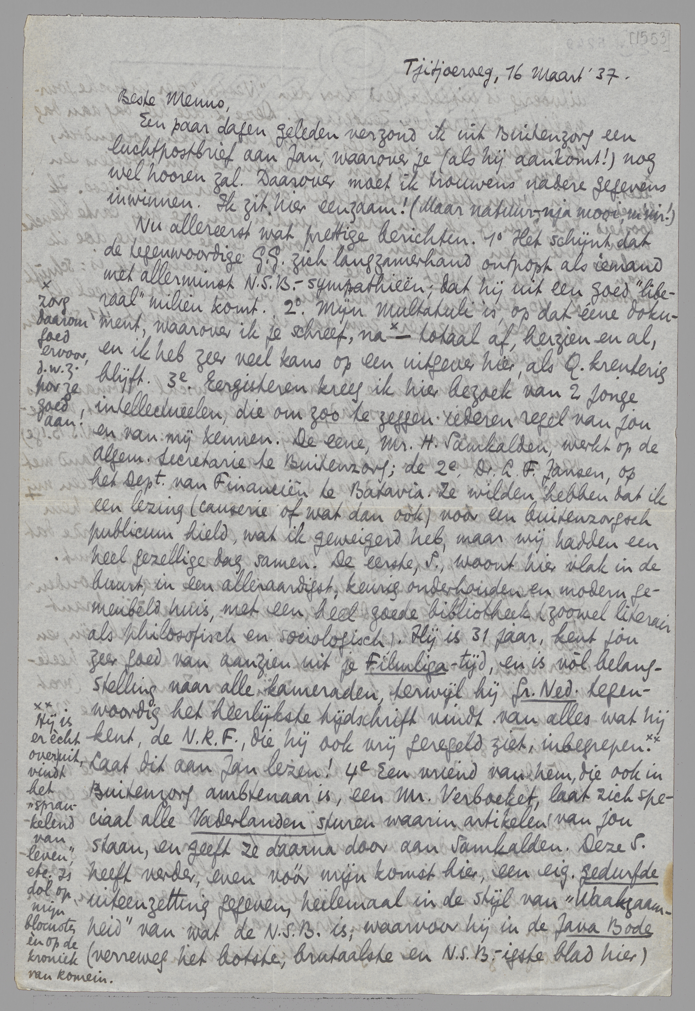 Nu allereerst wat prettige berichten. 1o Het schijnt dat de tegenwoordige G.G. zich langzamerhand ontpopt als iemand met allerminst N.S.B.-sympathieën; dat hij uit een goed ‘liberaal’ milieu komt. 2o. Mijn Multatuli is, op dat eene dokument, waarover ik je schreef, na [zorg daarom goed ervoor, d.w.z. por ze goed aan!] - totaal af, herzien en al, en ik heb zeer veel kans op een uitgever hier, als Q. krenterig blijft. 3o. Eergisteren kreeg ik hier bezoek van 2 jonge intellectueelen, die om zoo te zeggen iederen regel van jou en van mij kennen. De eene, Mr. H. Samkalden, werkt op de Algem. Secretarie te Buitenzorg; de 2e Dr. L.F. Jansen, op het Dept. van Financiën te Batavia. Ze wilden hebben dat ik een lezing (causerie of wat dan ook) voor een buitenzorgsch publicum hield, wat ik geweigerd heb, maar wij hadden een heel gezellige dag samen. De eerste, S., woont hier vlak in de buurt, in een alleraardigst, keurig onderhouden en modern gemeubeld huis, met een heel goede bibliotheek (zoowel literair als philosofisch en sociologisch). Hij is 31 jaar, kent jou zeer goed van aanzien uit je Filmliga-tijd, en is vòl belangstelling naar alle kameraden, terwijl hij Gr. Ned. tegenwoordig het heerlijkste tijdschrift vindt van alles wat hij kent, de N.R.F., die hij ook vrij geregeld ziet, inbegrepen. [Hij is er ècht over uit, vindt het ‘sprankelend van leven’, etc. Is dol op mijn blocnotes èn op de kroniek van Romein.] Laat dit aan Jan lezen! 4o Een vriend van hem, die ook in Buitenzorg ambtenaar is, een Mr. Verboeket, laat zich speciaal alle Vaderlanden sturen waarin artikelen van jou staan, en geeft ze daarna door aan Samkalden. Deze S. heeft verder, even vóór mijn komst hier, een eig. gedurfde uiteenzetting gegeven, heelemaal in de stijl van Waakzaamheid van wat de N.S.B. is, waarvoor hij in de Java Bode (verreweg het botste, brutaalste en N.S.B.-igste blad hier) uitvoerig is uitgekafferd door den ‘Nestor’ der indische journalisten, zekeren heer Zentgraaff. Deze Z. die hier dag aan dag de onbenulligste stukkies schrijft in klerkenhollandsch, is om zijn ervaring, zijn feitenkennis, zijn dossiers en zijn journalistenpatserigheid [lees: gewetenloosheid onder veel airs van ‘fatsoen’] door iedereen gevreesd. Ik zal zien of ik een krant vinden kan die mij carte blanche wil geven tegen den vent. Zonder carte blanche doe ik het niet. Ik weet wat de indische journalistiek is: schrijft Z. 40 stukken tegen mij, dan wil ik (contractueel als het moet) verzekerd zijn dat ik, desgewenscht, 41 stukken schrijven kan.