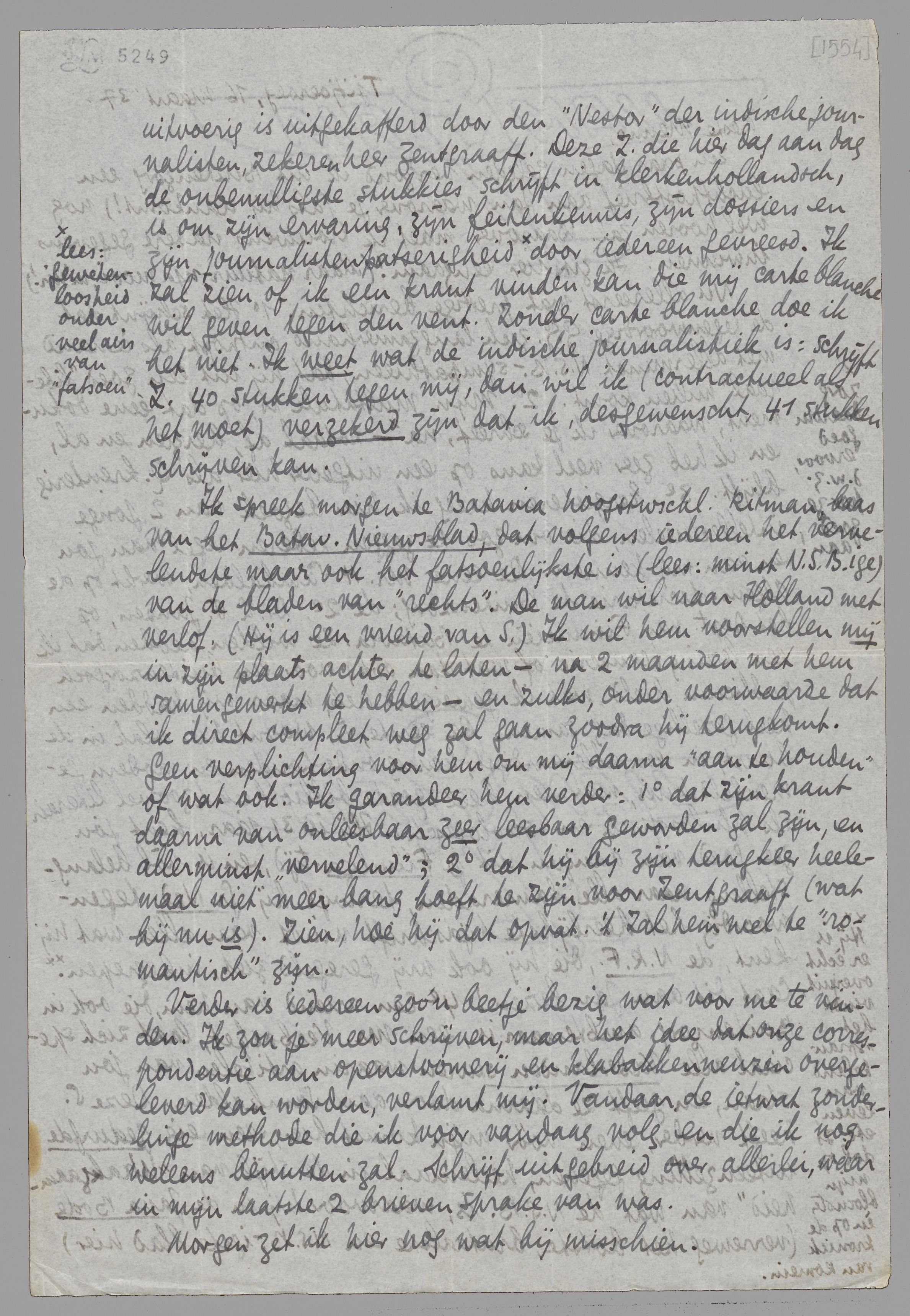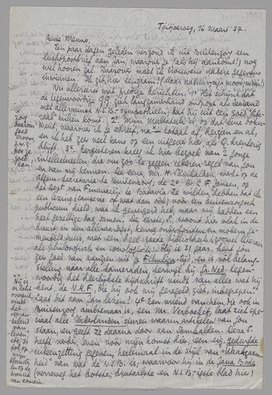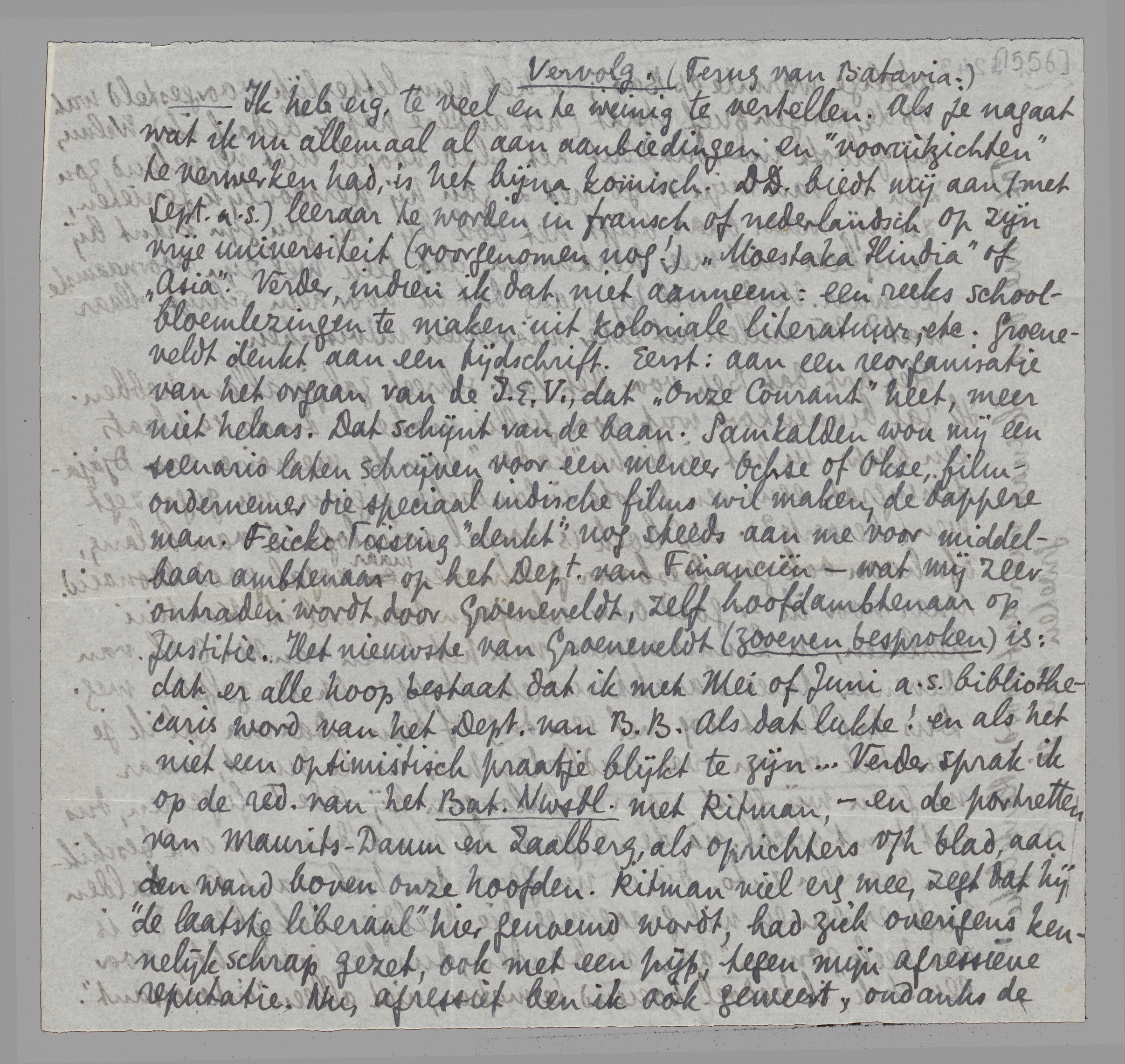 Ik heb eig. te veel en te weinig te vertellen. Als je nagaat wat ik nu allemaal al aan aanbiedingen en ‘vooruitzichten’ te verwerken had, is het bijna komisch. D.D. biedt mij aan (met Sept. a.s.) leeraar te worden in fransch of nederlandsch op zijn vrije universiteit (voorgenomen nog!) Moestaka Hindia of Asia. Verder, indien ik dat niet aanneem: een reeks schoolbloemlezingen te maken uit koloniale literatuur, etc. Groeneveldt denkt aan een tijdschrift. Eerst: aan een reorganisatie van het orgaan van de I.E.V., dat Onze Courant heet, meer niet helaas. Dat schijnt van de baan. Samkalden wou mij een scenario laten schrijven voor een meneer Ochse of Okse, filmondernemer die speciaal indische films wil maken, de dappere man. Feicko Tissing ‘denkt’ nog steeds aan me voor middelbaar ambtenaar op het Dept. van Financiën - wat mij zeer ontraden wordt door Groeneveldt, zelf hoofdambtenaar op Justitie. Het nieuwste van Groeneveldt (zooeven besproken) is: dat er alle hoop bestaat dat ik met Mei of Juni a.s. bibliothecaris wordt van het Dept. van B.B. Als dat lukte! en als het niet een optimistisch praatje blijkt te zijn... Verder sprak ik op de red. van het Bat. Nwsbl. met Ritman, - en de portretten van Maurits-Daum en Zaalberg, als oprichters v/h blad, aan den wand boven onze hoofden. Ritman viel erg mee, zegt dat hij ‘de laatste liberaal’ hier genoemd wordt, had zich overigens kennelijk schrap gezet, ook met een pijp, tegen mijn agressieve reputatie. Nu, agressief ben ik ook geweest, ondanks de akelige warmte op Bat.; ik heb hem letterlijk voorgesteld wat op den vorigen brief staat (het andere papier bedoel ik). Welnu, hij gelooft inderdaad dat het blad vooral niet vervelend zou zijn en van mijn strijd met Z. zou hij persoonlijk genieten, zei hij, maar daar blijft het ook bij. Hij zou zijn krant bij terugkeer niet meer herkennen, dat leek wel zijn voornaamste bezwaar. Verder wil hij graag dat ik voor hem schrijf. Maar wat? We zullen het later misschien uitvisschen.