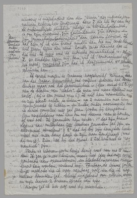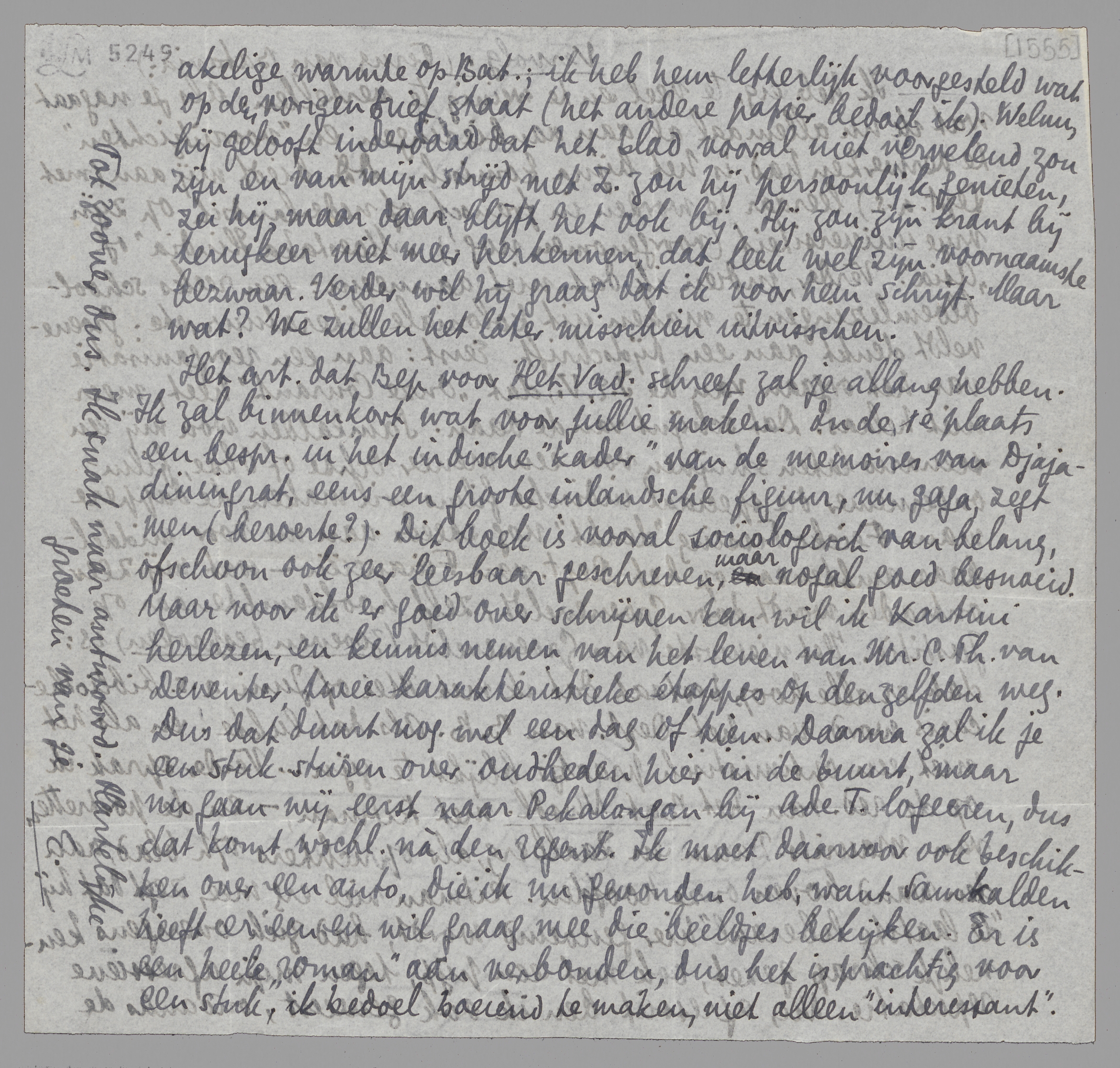 Het art. dat Bep voor Het Vad. schreef zal je allang hebben. Ik zal binnenkort wat voor jullie maken. In de 1e plaats een bespr. in het indische ‘kader’ van de memoires van Djajadiningrat, eens een groote inlandsche figuur, nu gaga, zegt men (beroerte?) Dit boek is vooral sociologisch van belang, ofschoon ook zeer leesbaar geschreven, maar nogal goed besnoeid. Maar voor ik er goed over schrijven kan wil ik Kartini herlezen, en kennis nemen van het leven van Mr. C.Th. van Deventer, twee karakteristieke étappes op denzelfden weg. Dus dat duurt nog wel een dag of tien. Daarna zal ik je een stuk sturen over oudheden hier in de buurt, maar nu gaan wij eerst naar Pekalongan bij Ade T. logeeren, dus dat komt wschl. nà den regent. Ik moet daarvoor ook beschikken over een auto, die ik nu gevonden heb, want Samkalden heeft er een en wil graag mee die beeldjes bekijken. Er is een heele ‘roman’ aan verbonden, dus het is prachtig voor een stuk, ik bedoel boeiend te maken, niet alleen ‘interessant’. Tot zoover dus. Ik snak naar antwoord. Hartelijke groeten