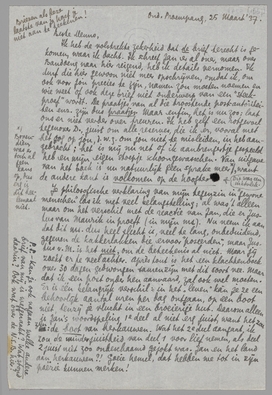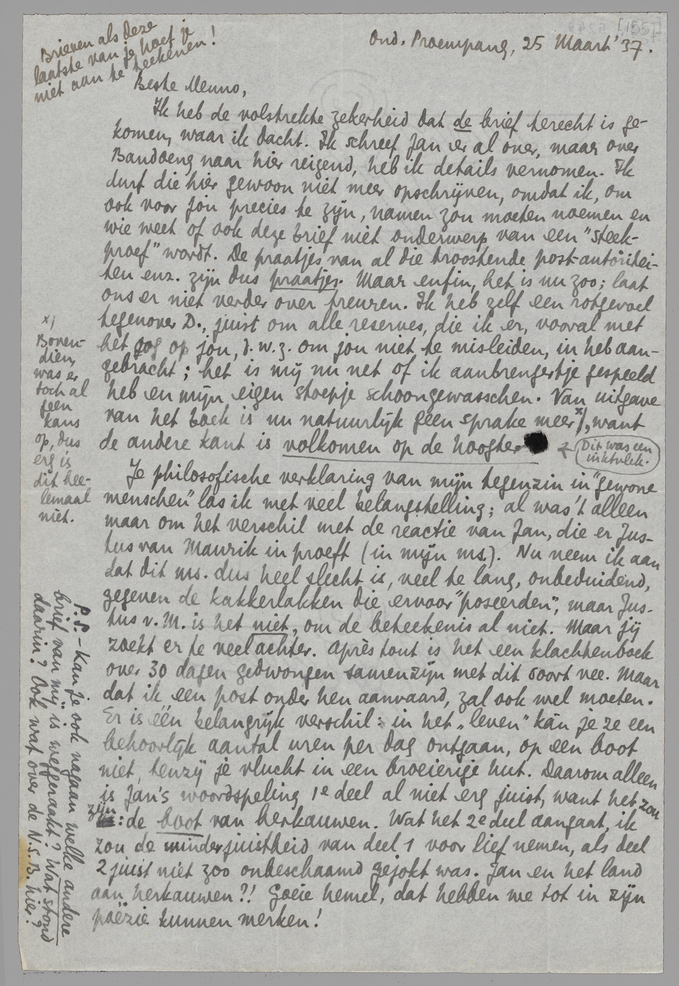 Ik heb de volstrekte zekerheid dat de brief terecht is gekomen, waar ik dacht. Ik schreef Jan er al over, maar over Bandoeng naar hier reizend, heb ik details vernomen. Ik durf die hier gewoon niet meer opschrijven, omdat ik, om ook voor jou precies te zijn, namen zou moeten noemen en wie weet of ook deze brief niet onderwerp van een ‘steekproef’ wordt. De praatjes van al die troostende post-autoriteiten enz. zijn dus praatjes. Maar enfin, het is nu zoo; laat ons er niet verder over treuren. Ik heb zelf een rotgevoel tegenover D., juist om alle reserves, die ik er, vooral met het oog op jou, d.w.z. om jou niet te misleiden, in heb aangebracht; het is mij nu net of ik aanbrengertje gespeeld heb en mijn eigen stoepje schoongewasschen. Van uitgave van het boek is nu natuurlijk geen sprake meer [Bovendien was er toch al geen kans op, dus erg is dit heelemaal niet.], want de andere kant is volkomen op de hoogte. (Dit was een inktvlek).