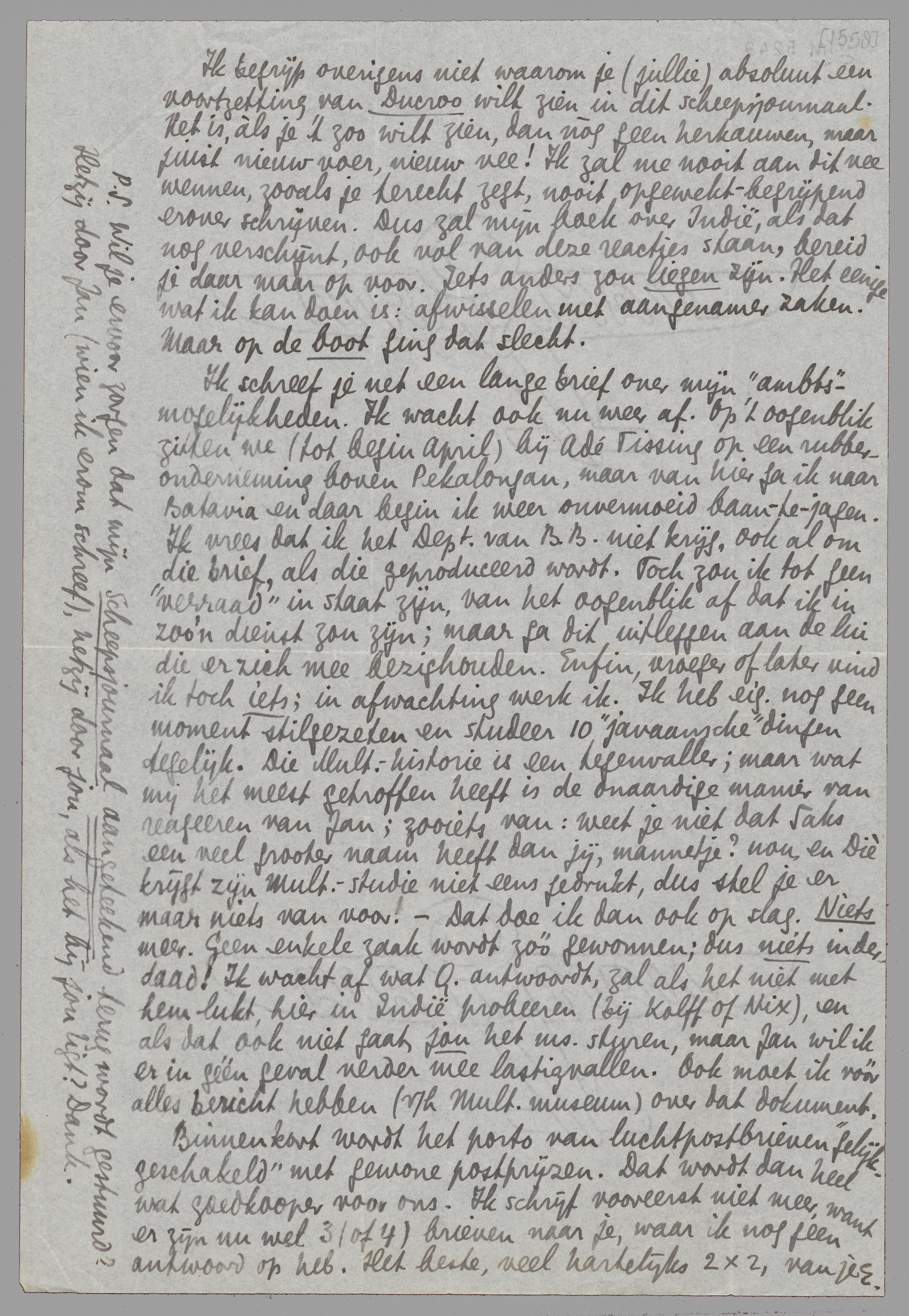 P.S. Wil je ervoor zorgen dat mijn Scheepsjournaal aangeteekend terug wordt gestuurd? Hetzij door Jan (wien ik erom schreef), hetzij door jou, als het bij jou ligt? Dank.