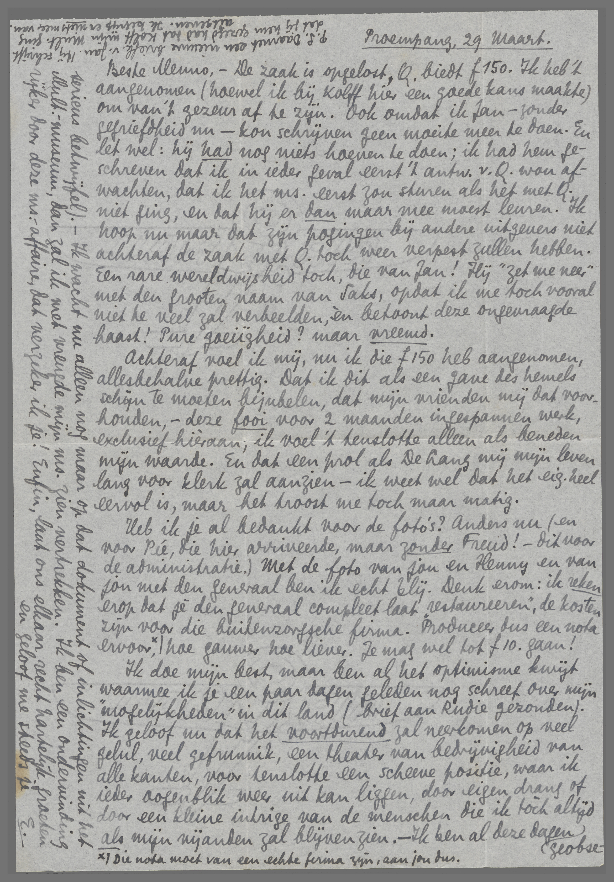 Heb ik je al bedankt voor de foto's? Anders nu (en voor Pée, die hier arriveerde, maar zonder Freud! – Dit voor de administratie.) Met de foto van jou en Henny en van jou met den generaal ben ik echt blij. Denk erom: ik reken erop dat je den generaal compleet laat ‘restaureeren’, de kosten zijn voor die buitenzorgsche firma. Produceer dus een nota ervoor (Die nota moet van een echte firma zijn, aan jou dus.), hoe gauwer hoe liever. Je mag wel tot f10. gaan!