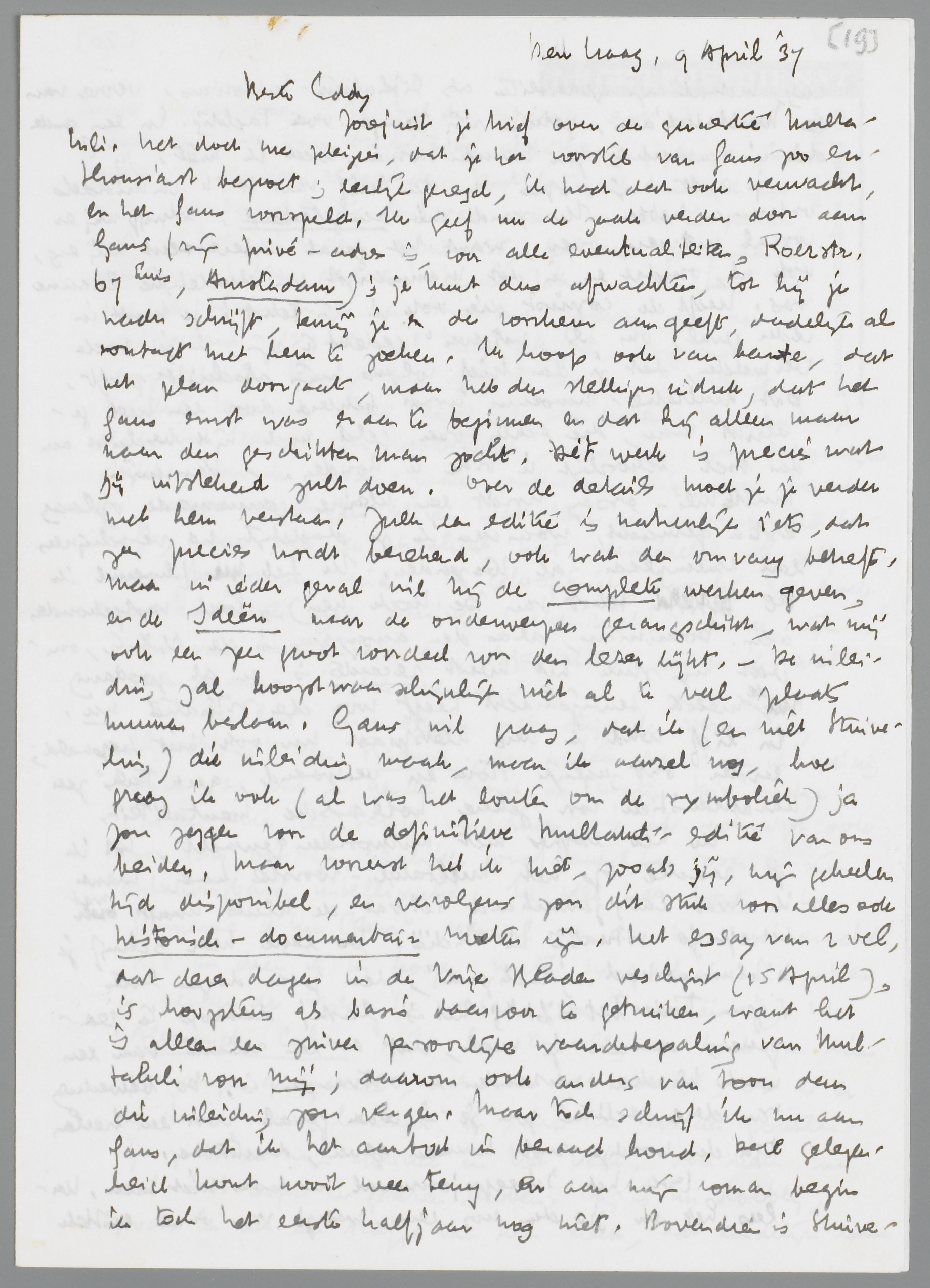 Zoojuist je brief over de quaestie Multatuli. Het doet me pleizier, dat je het voorstel van Gans zoo enthousiast begroet; eerlijk gezegd, ik had dat ook verwacht, en het Gans voorspeld. Ik geef nu de zaak verder door aan Gans (zijn privéadres is, voor alle eventualiteiten, Roerstraat 67 huis, Amsterdam); je kunt dus afwachten, tot hij je nader schrijft, tenzij je er de voorkeur aan geeft, dadelijk al contact met hem te zoeken. Ik hoop ook van harte, dat het plan doorgaat, maar heb den stelligen indruk, dat het Gans ernst was er aan te beginnen en dat hij alleen maar naar den geschikten man zocht. Dit werk is precies wat jij uitstekend zult doen. Over de details moet je je verder met hem verstaan. Zulk een editie is natuurlijk iets, dat zeer precies wordt berekend, ook wat den omvang betreft. Maar in ieder geval wil hij de complete werken geven, en de Ideën naar de onderwerpen gerangschikt, wat mij ook een zeer groot voordeel voor den lezer lijkt. - De inleiding zal hoogstwaarschijnlijk niet al te veel plaats kunnen beslaan. Gans wil graag, dat ik (en niet Stuiveling) die inleiding maak, maar ik aarzel nog, hoe graag ik ook (al was het louter om de symboliek) ja zou zeggen voor de definitieve Multatuli-editie van ons beiden. Maar vooreerst heb ik niet, zooals jij, mijn geheelen tijd disponibel, en vervolgens zou dit stuk voor alles ook historisch-documentair moeten zijn. Het essay van 2 vel, dat dezer dagen in de Vrije Bladen verschijnt (15 April), is hoogstens als basis daarvoor te gebruiken, want het is alleen een zuiver persoonlijke waardebepaling van Multatuli voor mij; daarom ook anders van toon dan die inleiding zou vergen. Maar toch schrijf ik nu aan Gans, dat ik het aanbod in beraad houd. Deze gelegenheid komt nooit weer terug, en aan mijn roman begin ik toch het eerste halfjaar nog niet. Bovendien is Stuiveling, met al zijn qualiteiten als literatuur-historicus, verre van een Multatuliaan, getuige zijn boekje over Tachtig. En een ander die in aanmerking zou kunnen komen, weet ik niet. Jij?