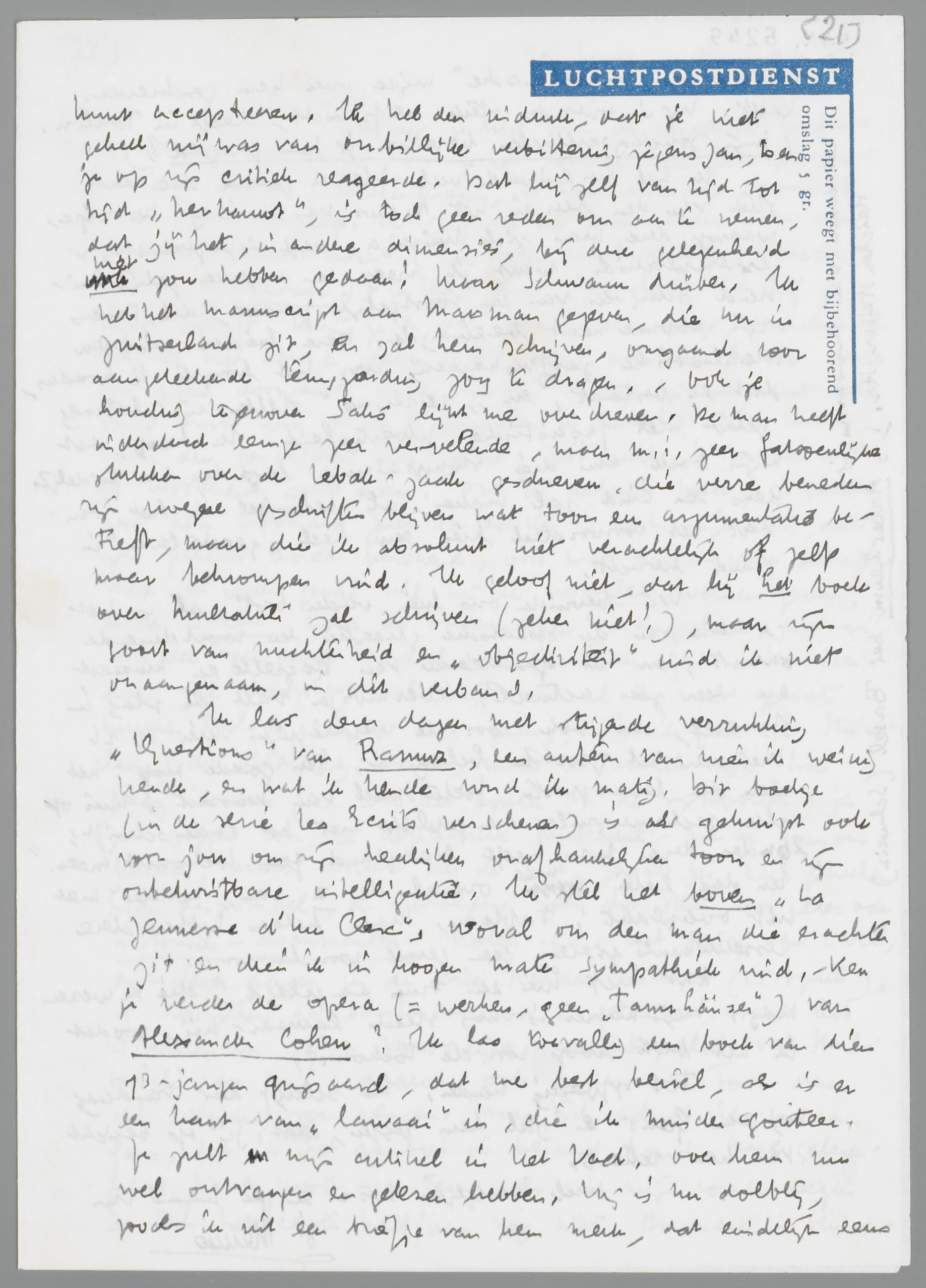 Ik las dezer dagen met stijgende verrukking Questions van Ramuz, een auteur van wien ik weinig kende, en wat ik kende vond ik matig. Dit boekje (in de serie les Ecrits verschenen) is als geknipt voor ook jou om zijn heerlijken onafhankelijken toon en zijn onbetwistbare intelligentie. Ik stel het boven La jeunesse d'un Clerc, vooral om den man die erachter zit en dien ik in hoogen mate symphatiek vind. - Ken je verder de opera ( = werken, geen Tannhäuser) van Alexander Cohen? Ik las toevallig een boek van dien 73-jarigen grijsaard, dat me best beviel, al is er een kant van ‘lawaai’ in, die ik minder goûteer. Je zult mijn artikel in Het Vad. over hem nu wel ontvangen en gelezen hebben. Hij is nu dolblij, zooals ik uit een briefje van hem merk, dat eindelijk eens iemand op ‘onhollandsche’ wijze over hem geschreven heeft. Hij is overigens sterk verfranscht, leeft in Toulon. (Mijn Zondagsartikelen bereiken je toch geregeld?)